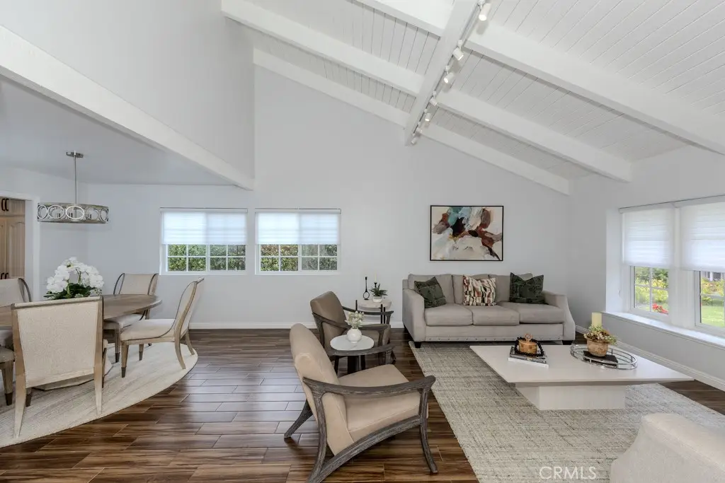Single-story 3-bedroom 2-bath view home at 581 S Paseo Carmel in Anaheim Hills offers city lights and mountain vistas along with a spacious primary suite and a backyard retreat built for entertaining. The property begins with great curb appeal, wood siding with brick accents, and a landscaped approach. A covered entry functions as a front patio seating area and sets a welcoming tone. Inside, wood-look tile flooring runs throughout with no interior steps. The main living area opens under vaulted wood beam ceilings with abundant natural light, creating a bright and open feel that blends into the dining area. A hallway with a double-door storage closet leads toward the family room, where vaulted ceilings continue above a tall whitewashed brick fireplace wall. The family room flows into a kitchen nook finished with wainscoting and wood accents, positioned beside large windows for natural light. The kitchen is anchored by a peninsula counter and finished with granite countertops, a herringbone marble mosaic backsplash, recessed lighting, and a deep sink. A garden bay window offers extra display space. Appliances include a gas cooktop, oven, dishwasher, and trash compactor. Pull-out drawers add convenience, and the adjacent dining space accommodates a full table. The primary suite features double door entry, vaulted ceilings with a ceiling fan, dual mirrored wardrobes, and French doors with operable side windows. Its en suite bath offers dual granite vanities, a walk-in shower with seating bench, a private water closet, and large travertine tile finishes. The second bedroom, also with double-door entry, is used as an office with ceiling fan and mirrored closet, while the third bedroom includes the same. The guest bath is a full bath with granite vanity and large travertine tile shower surround. The laundry room is inside with overhead cabinetry. The attached two-car garage provides direct access, storage cabinets, and overhead racks. The backyard is designed as an entertainer's retreat, featuring a large Luminwood patio cover with recessed lighting and dual ceiling fans, paver hardscape, built-in barbecue with bar seating, a decorative glass gas fireplace, turf, and a putting green. Mature trees along the rear add privacy while framing the city lights and mountain views. Located minutes from shopping, dining, and parks with nearby access to freeways and award-winning schools, this property offers a single-level lifestyle with outdoor amenities and relaxing views
