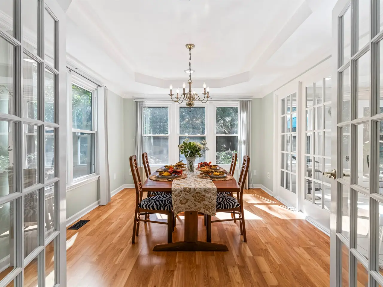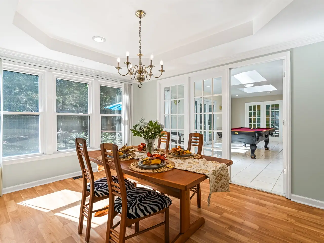 Experience the perfect blend of elegance, comfort, and modern upgrades in this beautifully appointed 4-bedroom, 2.5-bath traditional home located in the highly desirable Shepherd's Vineyard community in Apex, North Carolina. With 3,053 sq. ft. on a 0.29-acre lot, this residence offers both exceptional functionality and a refined lifestyle.The marble-tiled foyer, illuminated by an imported triple-pane Sch?co window and dramatic front door, features a stunning crystal chandelier, which makes a memorable first impression. Chandeliers in the living room area and formal dining room add a luxurious touch, creating the perfect atmosphere for hosting and entertaining.The primary suite serves as a private retreat, complete with a spa-inspired bathroom featuring a jetted soaking tub, sauna, bidet, and a home office?an ideal balance of comfort and practicality.The home's kitchen combines warmth and modern style with newly refinished oak cabinets, new stainless dishwasher, granite countertops, and a center island that is perfect for cooking or gathering. Kitchen French doors flow directly into the billiard room. A custom Sch?co door leads to the 2-car garage with brand-new steel insulated garage doors with glass windows, which elevate both curb appeal and energy efficiency.The billiard room with 3-panel Sch?co door, cheerful playroom, and cozy gathering room overlooking the vibrant banana tree provide distinct areas for relaxation, work, and entertainment. Tile flooring in both the kitchen and billiard room enhances durability and easy maintenance. Step outside to the back deck with a swinging hammock and al fresco dining space, offering the perfect setting for indoor-outdoor living.Each of the upper level four bedrooms features Pergo flooring and abundant natural light, adding warmth and charm throughout the home. Located within a convenient distance of the community clubhouse, pools, tennis, and beach volleyball courts, and just minutes from Apex Peakway, restaurants, shops, Apex Community Park Lake Pine trail, and the community library, this home blends suburban serenity with practicality.This Shepherd's Vineyard residence is more than a home?it's a sanctuary of comfort, style, and thoughtful design, offering multiple areas for living, entertaining, and unwinding in the heart of Apex.