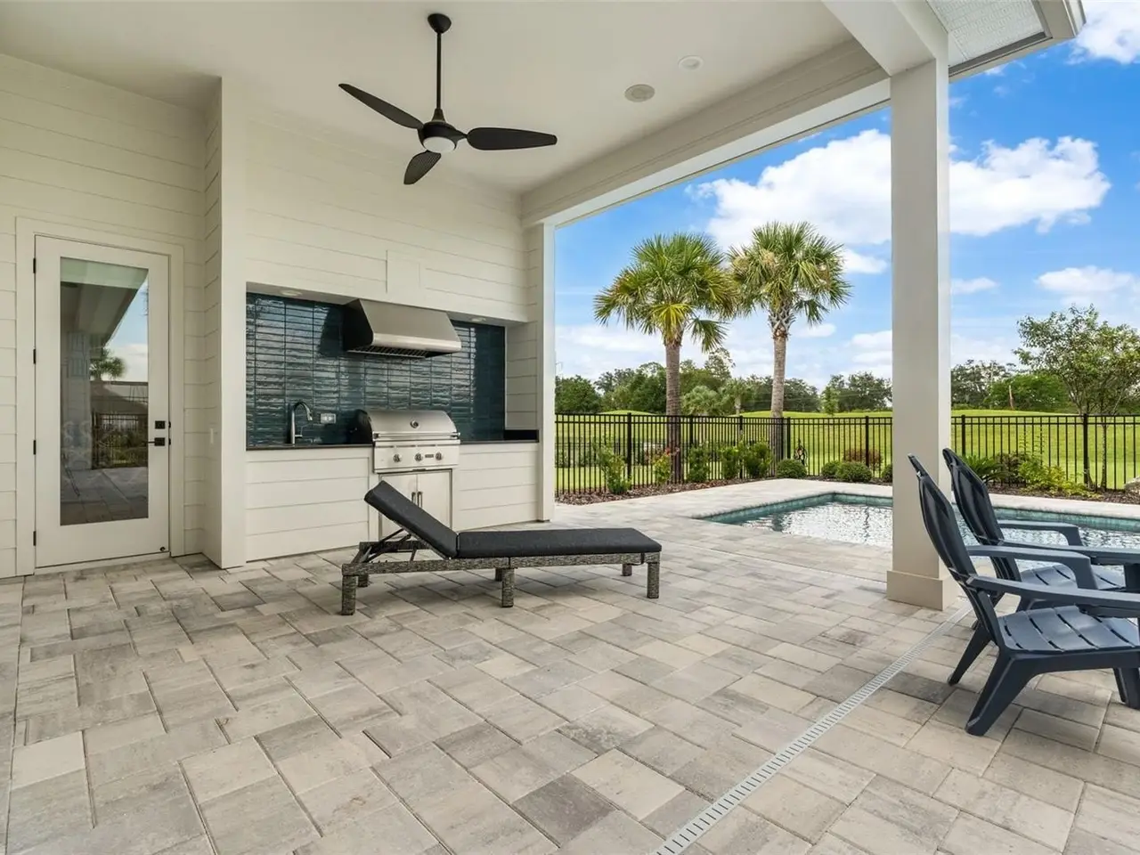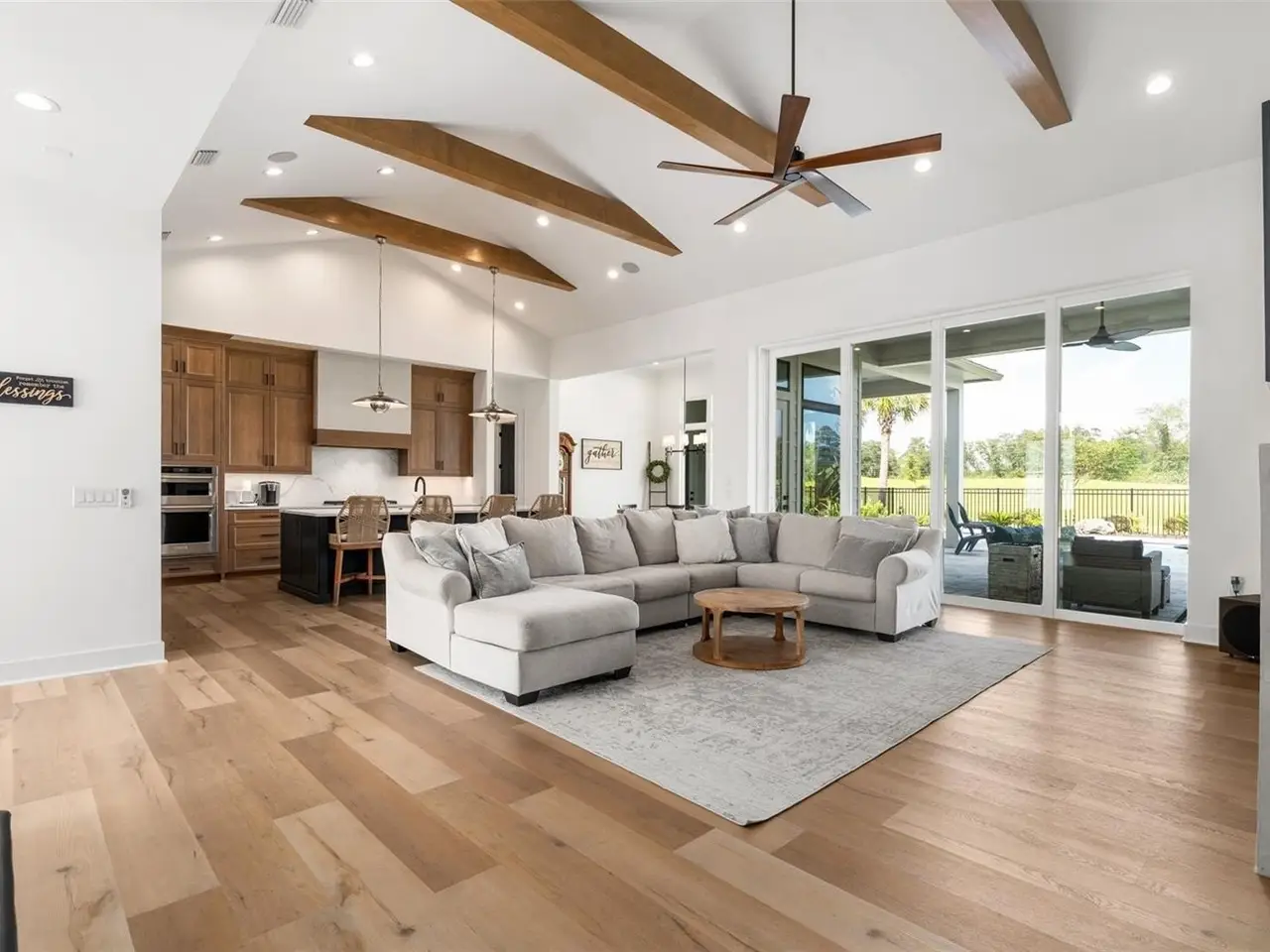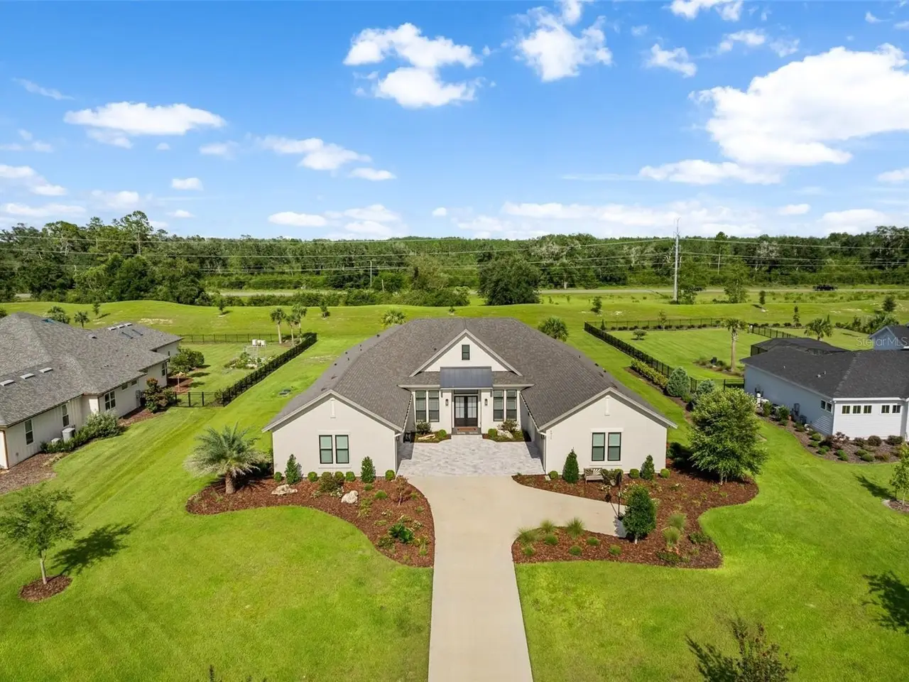 Designed and built by Barry Bullard Homes, this estate blends timeless style with today’s most sought after features, all thoughtfully placed on a fully landscaped, one-acre lot in one of Gainesville’s most desirable luxury communities - Flint Rock. With over 3,600 square feet, this home offers four spacious bedrooms, four full bathrooms, a dedicated study, formal dining, and a flex room with a custom beverage bar that opens directly to your outdoor living space. You’ll instantly appreciate every detail of the kitchen, from the rift-cut oak cabinetry and quartz countertops to the oversized island, stone hood, 5-burner gas cooktop, a built-in convection oven integrated above the microwave, and the wine chiller tucked into its own elegant nook with glass-front cabinets above. The walk-in pantry offers exceptional storage with plenty of space for small appliances, bulk items, and everyday essentials. It doesn’t stop there..your own dedicated household supply room offers even more room for seasonal decor, cleaning essentials, or just extra bulk supplies. Laundy just became that much easier with additional cabinetry, a folding counter, and a designated space to hang clothes. Wood plank flooring runs throughout the main living areas, offering durability with an elevated look. 16' vaulted ceilings with stained wood beams define the great room, which features a gas fireplace, built-ins, and 10’ stack-back sliders that disappear to reveal an expansive lanai and pool. The primary suite has dual walk-in closets, a freestanding soaking tub, and a spa-like walk-in shower. Two full-size, 2-car garages allow for separate entryways from either side of the house for seamless access into the home- each with its own custom drop zone and built-in storage. Out back, the patio is fully paved and made for Florida days. Enjoy a saltwater pool with a sun shelf and flowing water feature, a summer kitchen with a built-in grill and sink, and plenty of covered space to relax or host. Additional energy-efficient upgrades include spray foam insulation, tankless water heaters, a two-zone high-efficiency HVAC system, and vinyl insulated low E windows, all designed to enhance comfort and performance year-round. Flint Rock is a thoughtfully planned community designed to preserve open space and natural beauty. Residents get to enjoy access to recreational areas, nature trails, orchards with fruit and nut-bearing trees, community gardens, and winding walking paths offering more green space than a typical Gainesville subdivision. Schedule a private tour to see the only available home in the neighborhood!