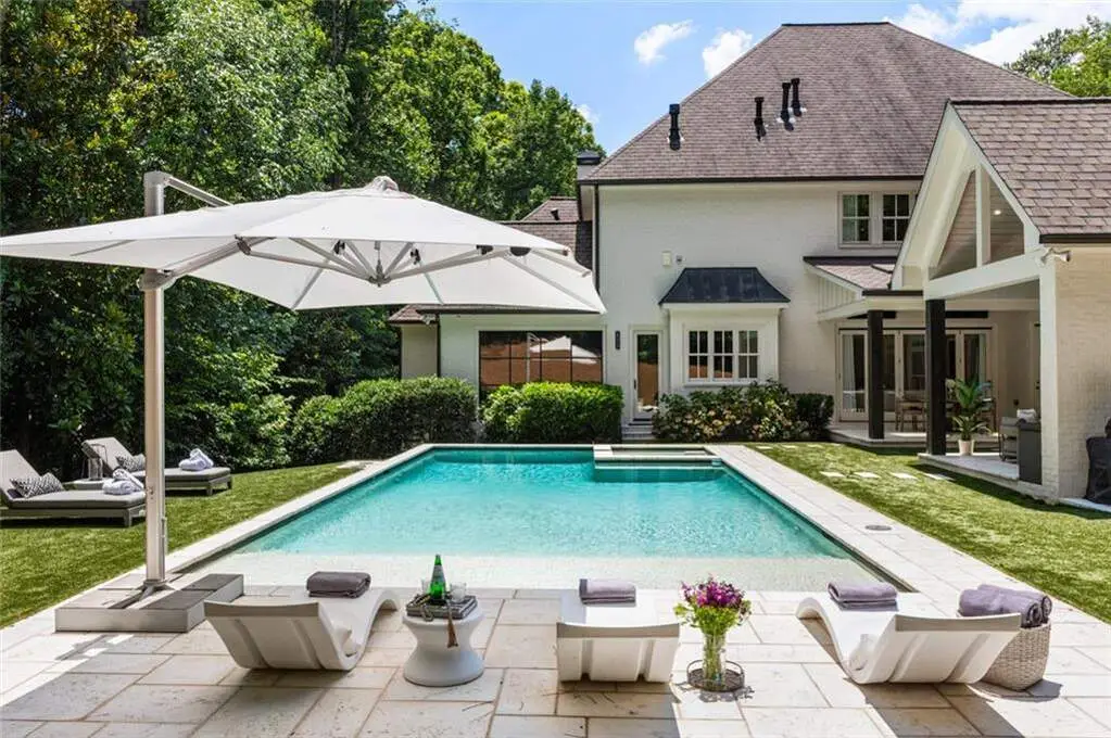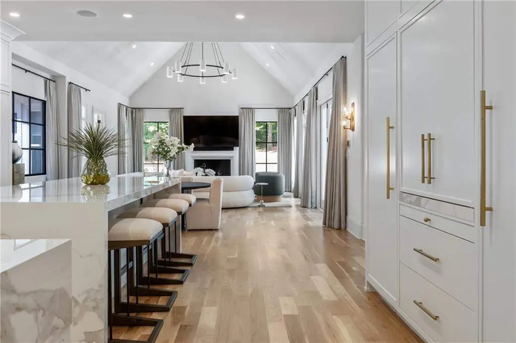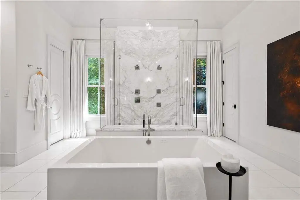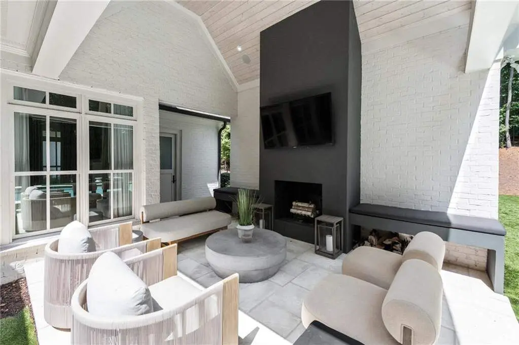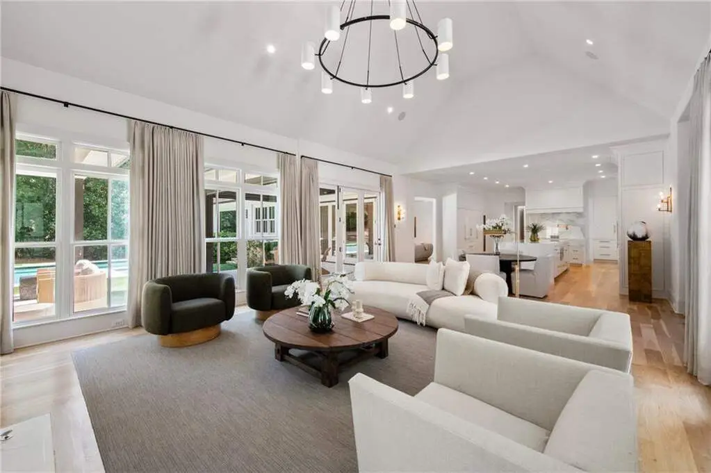 Tucked behind private gates on an expansive 2.1-acre estate in the prestigious Buckhead neighborhood, this exquisite residence is a stunning example of timeless design and refined living. Every element of the home has been thoughtfully curated to blend classical architecture with modern luxury. A dramatic two-story foyer greets you with a sweeping curved staircase and floods of natural light, setting the tone for the sophistication within. To one side, a richly appointed study showcases bespoke floor-to-ceiling millwork and a striking view of the private front landscape. On the other, the formal dining room impresses with detailed trim work, soaring ceilings, and elegant proportions ideal for both intimate gatherings and large-scale entertaining. The main living room offers a harmonious balance of grandeur and comfort, featuring a tray ceiling, a bold stone fireplace, and a wall of windows that seamlessly merge indoor and outdoor living. Adjacent is the chef's kitchen, a true centerpiece of the home, anchored by a stunning marble waterfall island and outfitted with top-tier appliances concealed within custom cabinetry. A burnished brass pot filler, sleek vent hood, and wine refrigerator complete this space designed for both form and function. Flowing naturally from the kitchen, the light-filled family room is a haven for relaxed living, with vaulted ceilings and expansive windows that frame views of the beautifully landscaped walk out turf backyard and open gracefully to an outdoor veranda with automated screens. The main-level primary suite is a serene retreat with a vaulted ceiling and wooded vistas. Its en-suite bath evokes a boutique spa experience, featuring a sculptural stone soaking tub, a dramatic glass-enclosed marble shower, dual vanities with ambient lighting, and his-and-hers dressing rooms finished in rich custom cabinetry. Upstairs, five well-appointed bedrooms each feature private en-suite baths. A separate guest suite includes its own living space and bathroom, offering a versatile area perfect for extended stays, children's activities, or a private lounge. The home also includes an elevator that serves all levels, leading to an impressive terrace level designed for indulgence and leisure. Highlights include a glass-front, climate-controlled wine cellar, a professional-grade home theater, a full fitness suite with a mirrored studio for dance, barre, or yoga, and an additional living area complete with a full kitchen and guest accommodations. Outdoors, this estate continues to elevate the lifestyle with a resort-style saltwater pool and tanning shelf, expansive flat lawn, and dual covered pavilions featuring a wood-burning fireplace and vaulted wood ceilings ideal for alfresco dining and year-round enjoyment. A gated area offers the perfect space for pets or play. This is a rare opportunity to own a truly bespoke residence in one of Atlanta's most sought-after addresses an estate that defines elegance, privacy, and timeless sophistication.