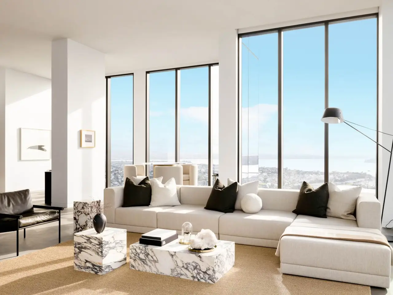 - Floor-to-ceiling glass with city and sea views