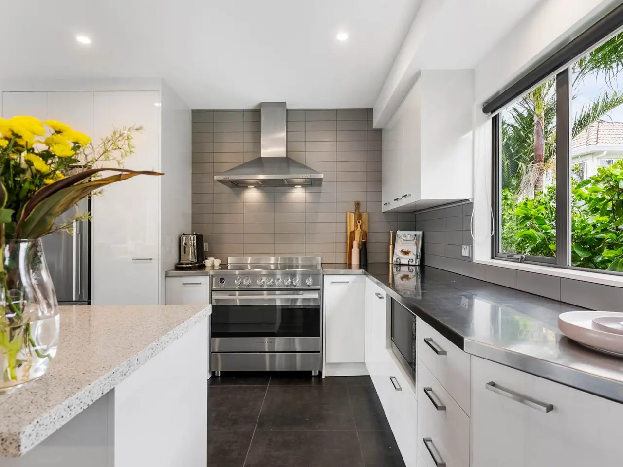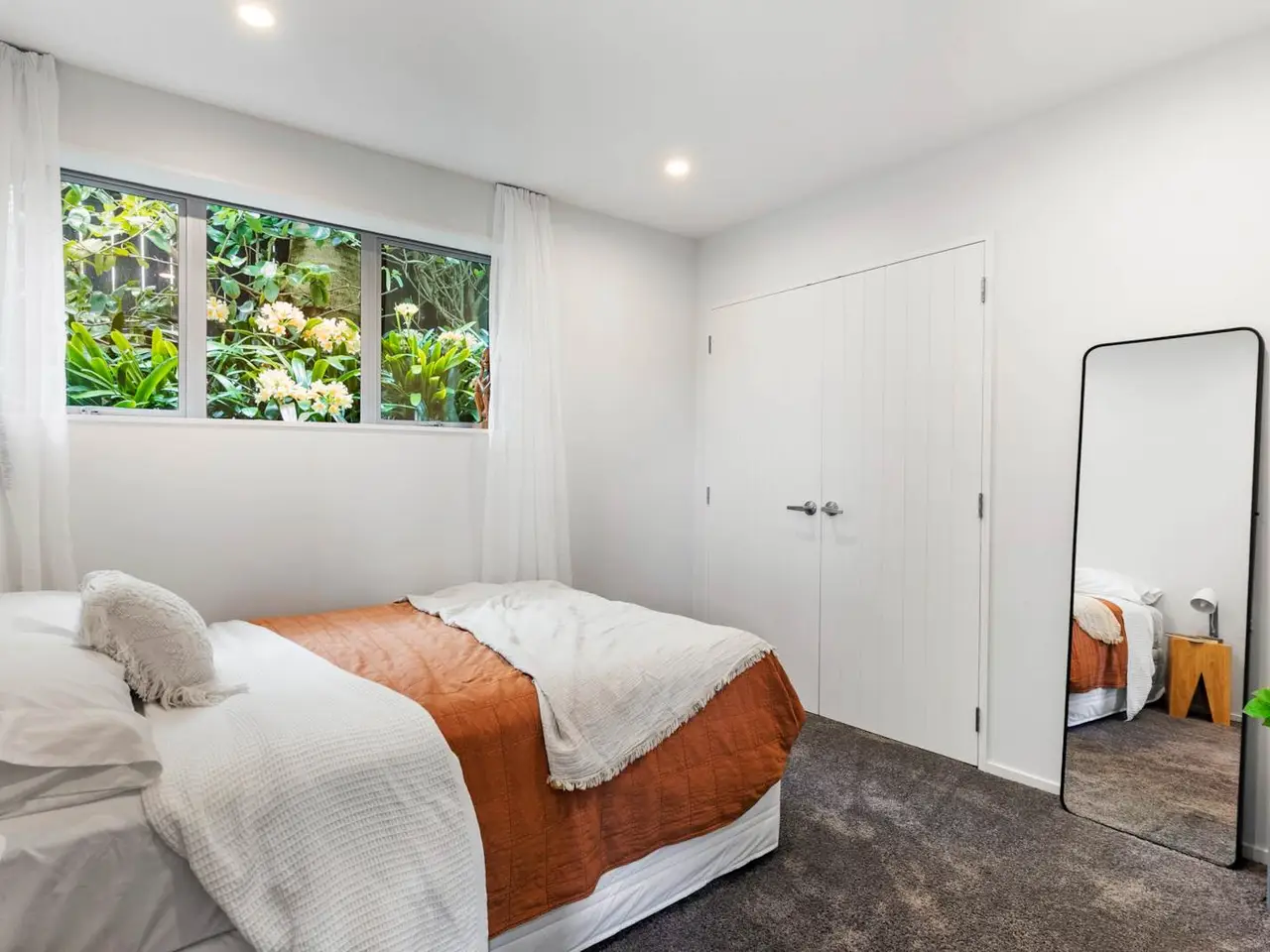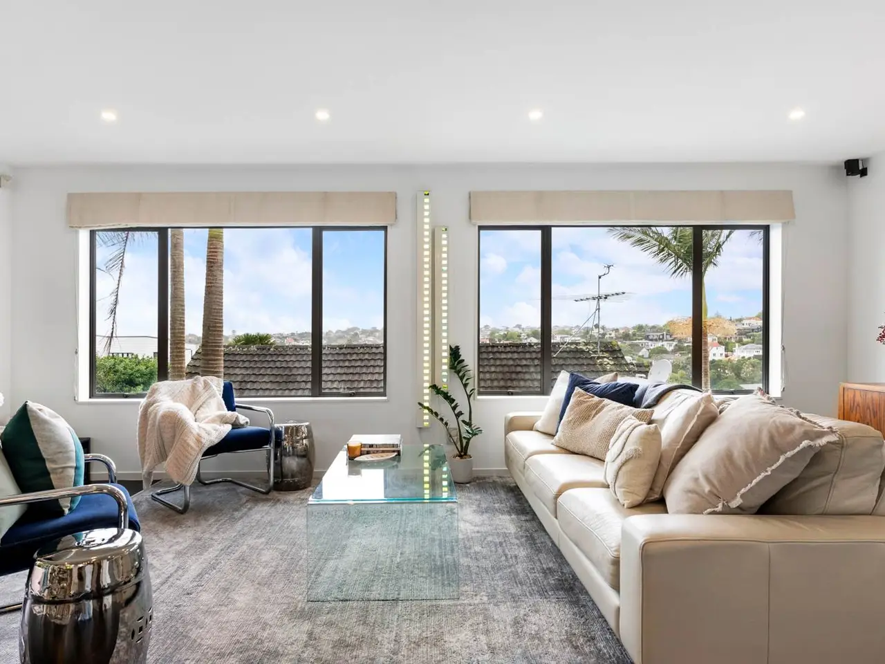 Tucked privately on a rear section, this lofty brick and weatherboard residence enjoys tantalising glimpses of the Waitemata Harbour, and the surrounding urban landscape. Towering Nikau palms and lush tropical foliage create a private, tranquil setting within an exclusive coastal enclave, just an easy walk to Mission Bay's iconic shoreline, cafés, and beaches.A thoughtful 211sqm (approx.) floor plan positions all north-facing living on the upper level, capturing abundant natural light, expansive urban vistas, and shafts of water views. Aluminium joinery enhances comfort throughout generous open plan living and dining areas that connect seamlessly through bifold doors to a substantial covered loggia with built-in seating. The contemporary kitchen features stainless steel appliances, stone-topped island, and ample storage, creating an ideal hub for everyday living and entertaining.Carpeted double bedrooms include a serene upper-level main suite with heat pump, monochrome ensuite, and extensive built-in wardrobes. A fifth bedroom downstairs offers versatility as a second lounge, complemented by a large family bathroom with sleek black fixtures, freestanding bath, and modern vanity. Two powder rooms, one on each level, enhance convenience. The carpeted internal-access double garage incorporates laundry and storage, with additional off-street parking and low-maintenance garden pockets ideal for alfresco dining. Close to city commuter routes, Orakei School, in-zone Selwyn College, and Eastridge's shops and eateries, this secluded coastal haven delivers relaxed, resort-style living just moments from the beach. Auction: 34 Shortland Street, City on Wednesday 19 November 2025 at 10:00AM (unless sold prior)