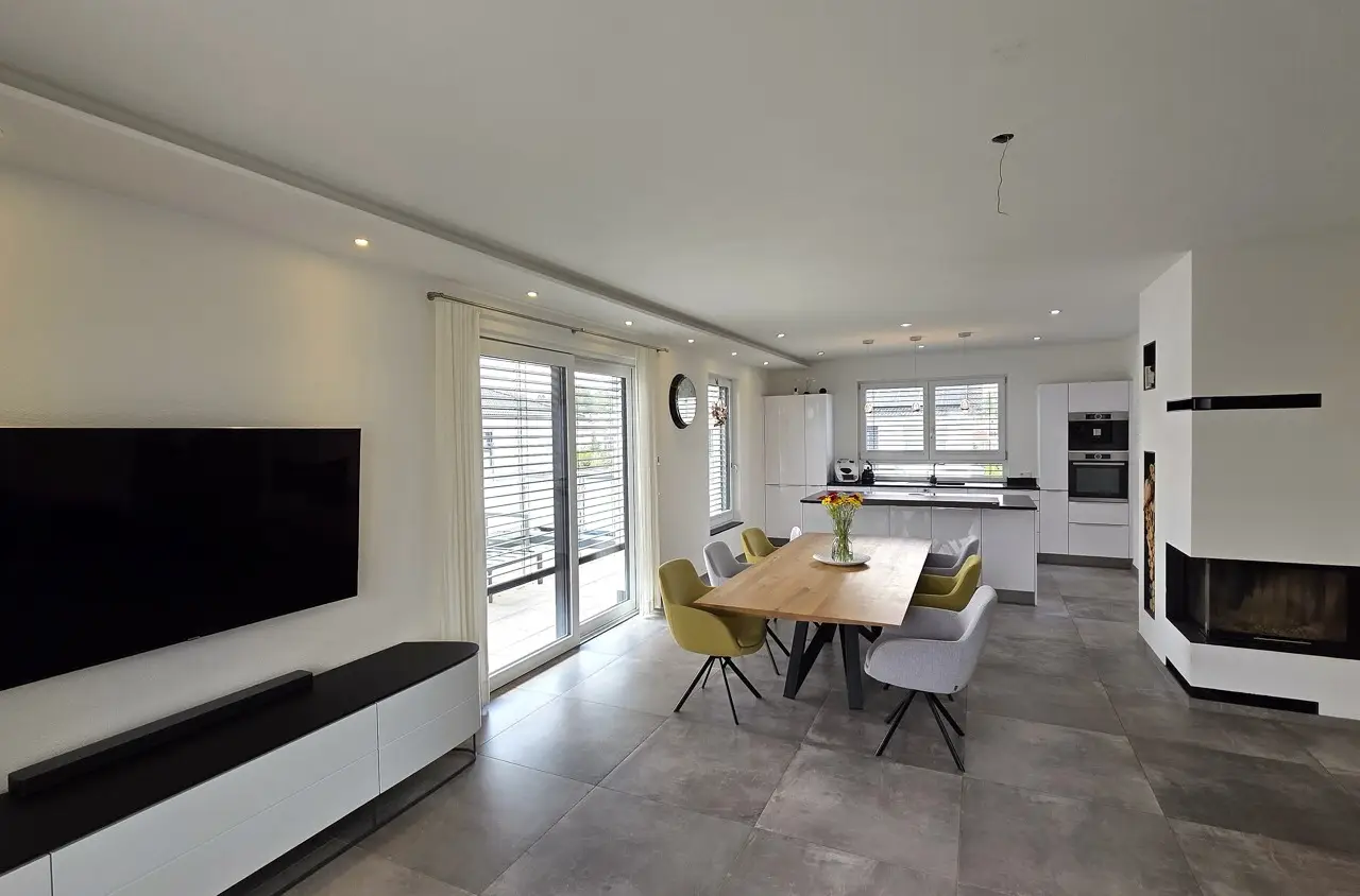 This high-quality domicile impresses with its spacious room concept and is ideal for families and discerning living requirements. With a total of five bedrooms and a living space of around 220 square meters, the property impresses with its well thought-out room layout, modern technical equipment and its extremely attractive location in Bad Waldsee. The entrance area is open and inviting. From here, you can access several spacious rooms that can be used flexibly as children's rooms, home offices or guest rooms. There is also a bathroom on this level as well as a utility room with space for a washing machine, dryer and additional storage space. The adjoining garage provides dry access directly into the house. The heart of the house is the central living area, which is accessed via a modern staircase. It opens up to the spacious, open kitchen, equipped with high-quality fixtures and fittings and modern electrical appliances. An elegant wood-burning stove lends the spacious living and dining area a cozy atmosphere. From the kitchen and living area, the path leads into the lovingly landscaped garden. Spacious terrace areas invite you to relax and socialize. Further bedrooms and a luxuriously equipped bathroom await you on the same level. The master bedroom also has an adjoining dressing room. Throughout the house, elegant floor coverings, large windows and innovative building services ensure a modern and comfortable living experience. The photovoltaic system with an output of 9.66 kWp installed in 2021 makes a significant contribution to sustainable energy supply. This not only lowers energy consumption, but also permanently reduces operating costs. A spacious double garage and several outdoor parking spaces are available for vehicles. The location of the house scores points for its proximity to shopping facilities, schools, nurseries and a wide range of leisure activities. Thanks to the good transport links, you can reach both the city center and the surrounding regions quickly and easily. This property combines contemporary living comfort with modern furnishings and a well-balanced room layout. Come and see the numerous quality features of this house for yourself during a personal viewing. If you have any questions or would like to arrange an individual appointment, please do not hesitate to contact us at any time.
