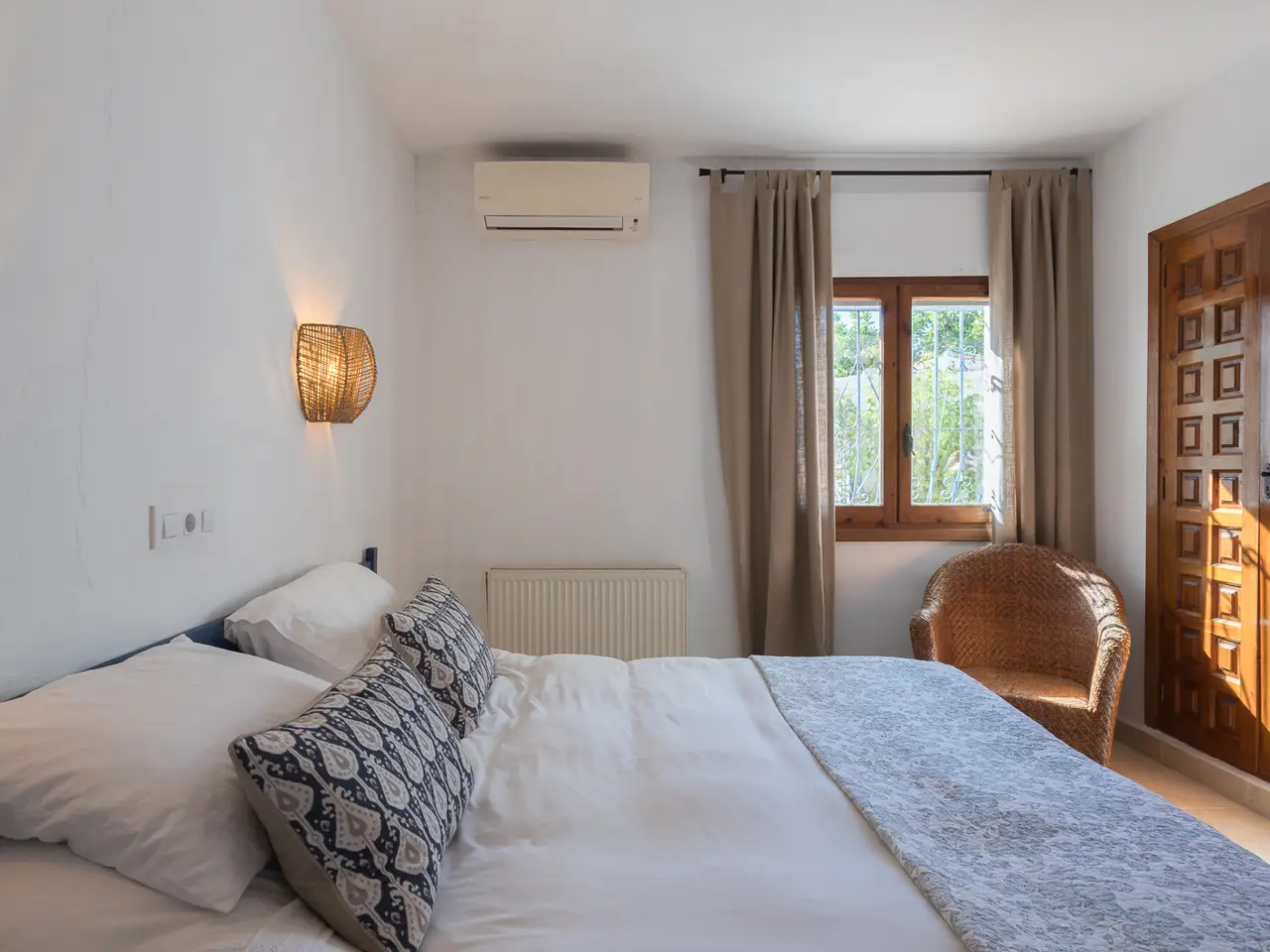 Traditional 1980s-style house with views of Montgó mountain, located in the quiet Balcón al Mar residential area, Jávea (Alicante) Spain. The main floor comprises a charming living-dining room with views of Montgó, a wood-burning fireplace, an equipped open-plan kitchen, a west-facing glazed terrace (naya) perfect for enjoying beautiful sunsets, three double bedrooms (the master with an en-suite bathroom), and a full bathroom. Also on this floor is an open terrace with a barbecue area. On the lower level, at pool level, there is a separate studio with a bedroom open to a small sitting area and the kitchen, plus a bathroom. The house is very functional, as both the main floor and the studio are accessible from the street with almost no steps. The garden features a private and pleasant pool area with tropical plants, and the plot includes ample parking for more than four vehicles. There is also a closed garage for one vehicle. Air conditioning is installed in all bedrooms and the living-dining room.