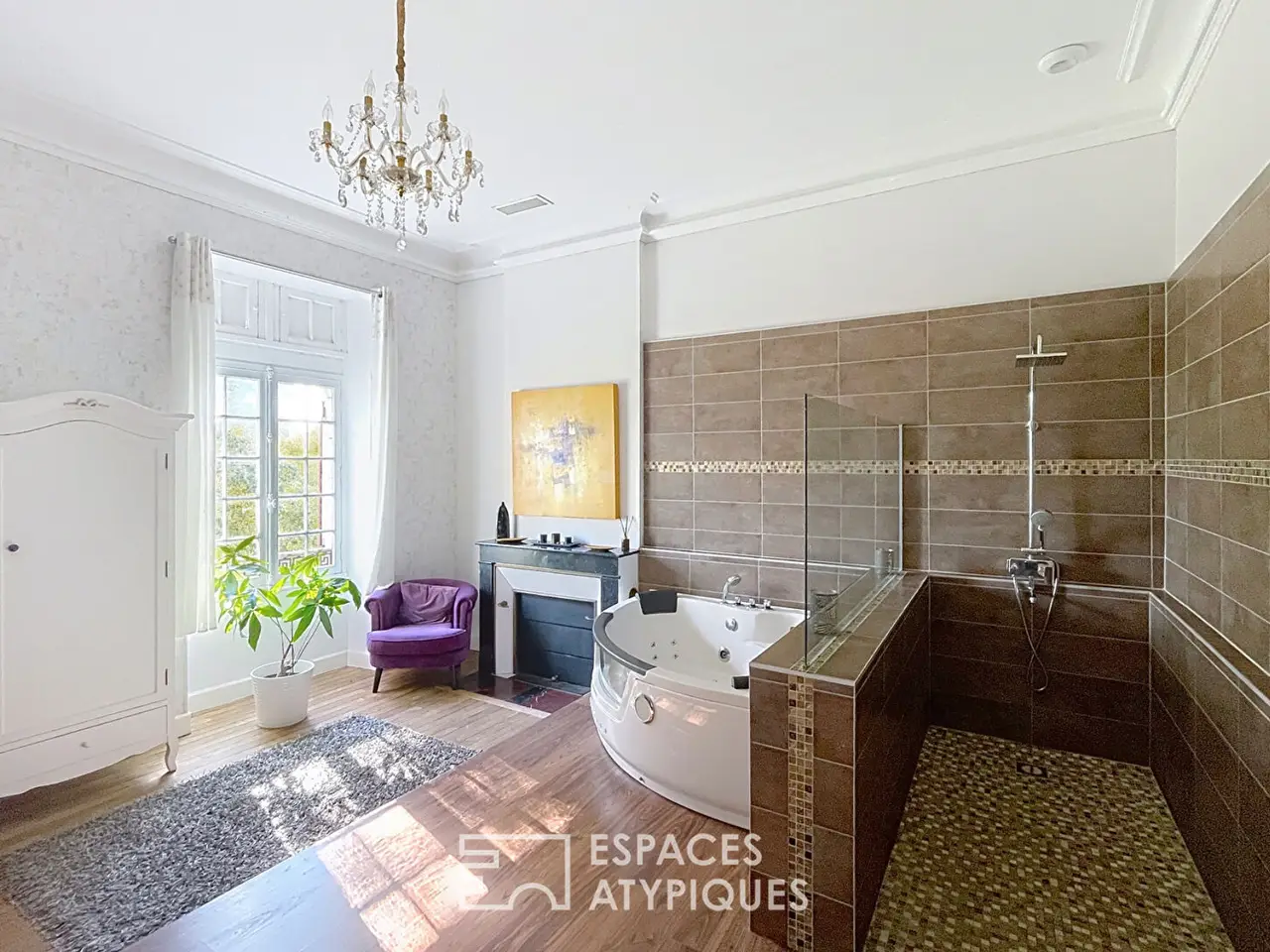 An exceptional setting where old-world charm and modern comfort blend perfectly.As soon as you enter, a majestic stone staircase welcomes you, opening onto a series of bright reception rooms, highlighted by sumptuous period architectural elements. A contemporary kitchen blends harmoniously into this ensemble, while two bedrooms and an independent space comprising a living room, a bathroom, a bedroom and a dressing room offer multiple possibilities, ideal for private or professional use.An elegant solid oak staircase leads to the first floor, fully air-conditioned and equipped with automatic lighting. This level offers six bedrooms, including a sumptuous master suite with a spa bathroom, as well as two additional shower rooms.The generous volumes are completed by a vast 200 sqm attic, offering remarkable development potential, and a large healthy cellar. Outside, the landscaped park and its swimming pool create a true haven of serenity.Located near the bastides and their seasonal entertainment, this property also benefits from a strategic location, just 40 minutes from Bordeaux and the ocean. Combining elegance and functionality, this residence is suitable for both family life and professional projects, such as guest rooms or event planning.A rare opportunity to acquire an exceptional property in a bucolic and preserved setting.DPE in progress.Caroline Montane (EI) Commercial Agent 06 95 44 09 60 RSAC number: 510 235 591 Bordeaux.REF. BORDEAUX-1918EABXAdditional information* 12 rooms* 8 bedrooms* 2 bathrooms* 2 shower rooms* Floor : 1* 1 floor in the building* Outdoor space : 8500 SQMEnergy Performance CertificateEPC blank or in progressAgency feesThe fees include VAT and are payable by the vendorMediatorMediation Franchise-Consommateurswww.mediation-franchise.com29 Boulevard de Courcelles 75008 ParisInformation on the risks to which this property is exposed is available on the Geohazards website : www.georisques.gouv.fr
