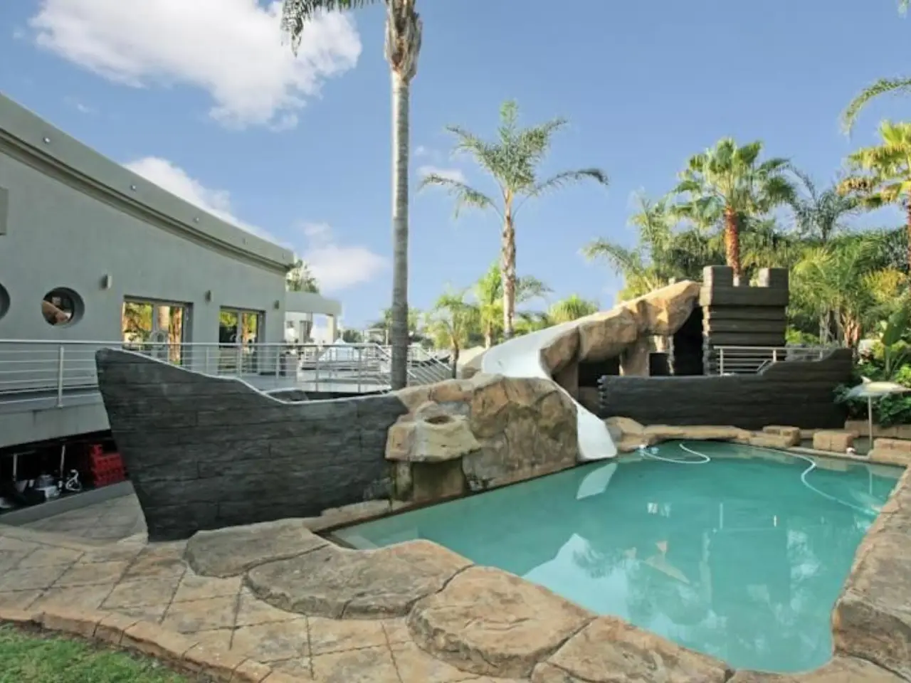 Complete with its own lighthouse providing panoramic views of the surrounding countryside, this splendid mansion is a one-of-a-kind collector's item for those who love all things nautical. Situated on a ridge overlooking plush Bedfordview, this lavish home is more than reminiscent of a Monte Carlo luxury yacht, with its beautifully-appointed staterooms and opulent entertainment areas, two "sparkling" pools with patio abounnds "Titanic theme" cafe with night club. All the decor, furniture and features have been specially designed and custom-made to further enhance this nautical impression. The triple-storey main residential home contains five bedrooms and four bathrooms, four reception rooms, a gourmet kitchen, two studies, two cinema rooms with surround-sound, an indoor pool and bar with wine cellar, a private gym and four garages. Special features include hot-tubs in three of the en suite bathrooms, separate balconies off each bedroom and a spiral staircase, as well as bespoke water features and murals. This part of the home is also connected by a specially-engineered suspension bridge to a glamorous private restaurant (with rights), nightclub and entertainment venue that seats 52 people. The second section of this super-home contains a guest suite with its own kitchen and cinema, as well as a catering kitchen with sushi bar, cigar lounge and lower-level theatre with a custom-designed night-sky ceiling. Other eye-catching features include a three-metre tropical fish tank, a DJ mixing station, full-size pool table and-áa large open air patio upstairs with a hot-tub, sauna and pizza oven.-áThree more garages and private staff accommodation further complete this picturesque residence with more entertainment opportunities in the form of a miniature-golf course, a mini-soccer field, several meditation ponds and the iconic 15m lighthouse providing 360-degree views over the city. The owners of this exceptional property will enjoy a tranquil lifestyle and peace of mind thanks to state-of-the-art security provisions. It is also fitted with central air-conditioning and an integrated music system, together with back-up generators with sufficient capacity to power the vessel. This residence also offers the opportunity to purchase all the furniture.