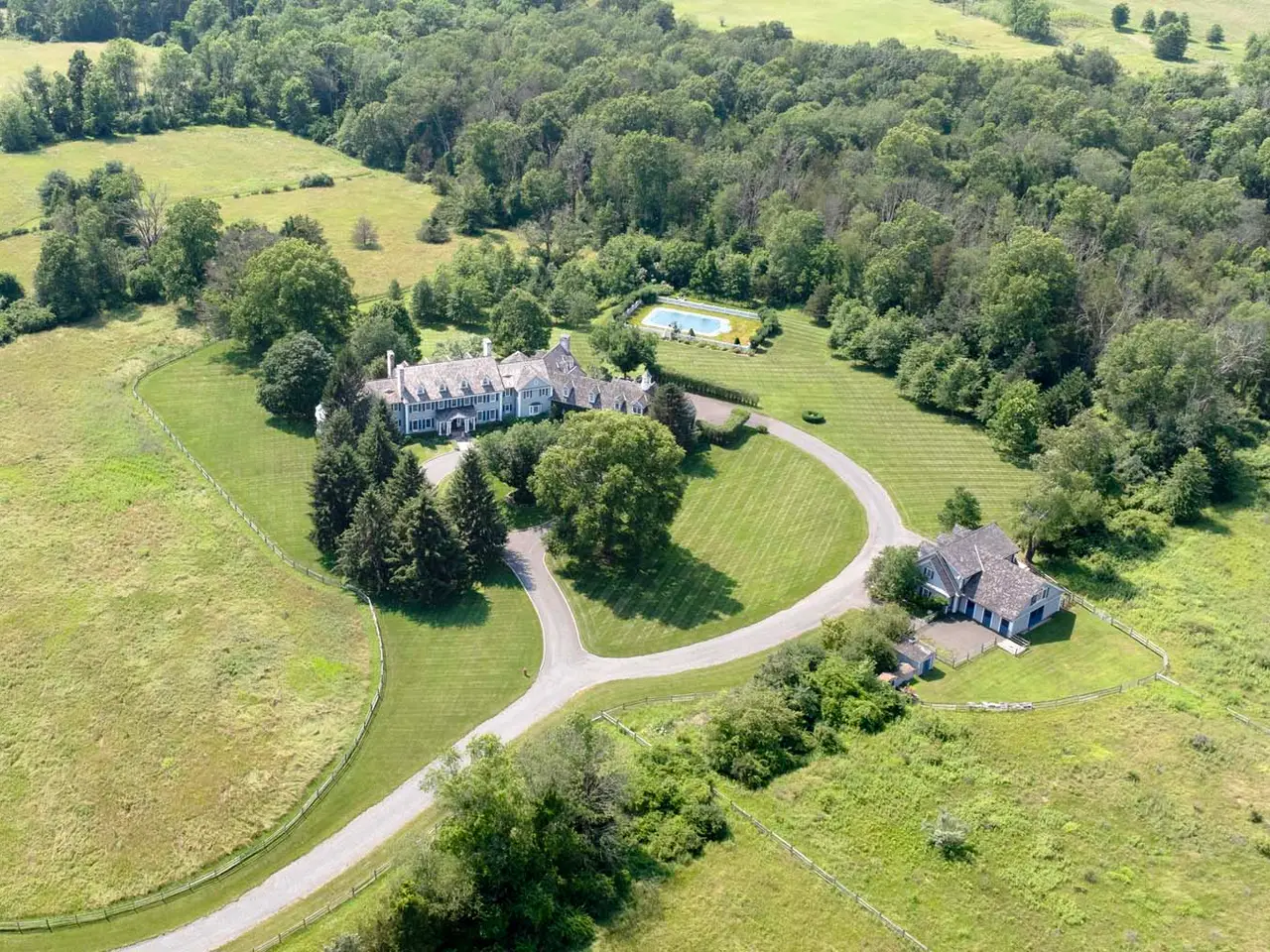 Exquisitely-Detailed Colonial Revival Estate on 43± Acres in Bedminster Set on 43± open, rolling acres in Bedminster Hunt Country, an exceptional gated Colonial Revival estate with equestrian facilities is set along one of the township's most desirable lanes. Featured in NJ Design magazine, the sophisticated interiors create a relaxed ambiance characterized by rich colors and remarkable millwork. The expansive seven-bedroom, eight full bath and two half-bath main residence is enriched by a three-stall horse barn featuring an attached three-car garage with a two-bedroom apartment above and an adjacent bonus room with kitchenette and full bath. Outside the main house, a generous patio and dual-covered side porches overlook sublime views of the acreage, while a pool tucked beyond a charming arbor and white picket fencing is lushly landscaped. Set far back from the road at the end of the long drive, this gracious property provides absolute privacy. Classic design elements within the layout include seven intricately mantled fireplaces, oak wood floors, arched doorways, traditional moldings and woodwork, stunning architectural details, unique built-ins, custom-painted rooms, exposed ceiling beams, two wet bars, a rear staircase and covered porte-cochère access to the home's three-car garage. Hiland Hall Turner Architects oriented the residence on the acreage to take advantage of morning sunlight in the front rooms and colorful sunsets in rear-facing spaces. A grandly styled layout invites epic entertaining as well as quiet times inspired by natural beauty viewed from numerous glass doors and oversized windows. A vestibule entry leads to the front-to-back foyer fitted with painted oak floors, a curving staircase and sightlines into some of the principal rooms. These include a formal living room anchored by an ornately mantled fireplace, a wood-paneled library featuring a fireplace and a connecting mahogany wet bar, and a dining room designed with built-in china cabinets, a fireplace, windowed seating niche and hand-painted wallpaper. An expansive fireside game room is finished in artful trim throughout. Nearby is a home office and formal powder room. The epicurean kitchen presents a center island with a prep sink, Franke farmhouse sink, custom cabinetry and a sun-splashed dining area with a domed ceiling featuring a hand-painted cloud mural. A collection of high-end appliances includes a Viking range, Sub-Zero refrigerator, Bosch dishwasher and wine refrigerator. Adjacent to the kitchen is a secondary office space and a butler?s pantry. The floor plan continues into a great room set under towering vaulted ceilings accented by reclaimed wood beams. Natural light spills into this space from fixed upper windows and French doors to the porch, while a floor-to-ceiling stone fireplace is a handsome focal point. This part of the home is completed by a mud room with storage options, informal powder room, staircase to the finished lower level, secondary stairs to the bedroom level, and access to the porte-cochère and garage. Upstairs, a captivating window seat in the landing overlooks tranquil grounds. A primary suite begins in the vaulted ceiling bedroom featuring a fireplace, sitting area, built-ins and access to the extra-large primary balcony. An oversized dressing room with wardrobe organizers and two walk-in closets provide ample storage. The spa-like primary bath has a heated floor and includes a jetted soaking tub, separate water closet with a toilet and bidet, an oversized shower and double vanity. Four additional en suite bedrooms each connect to a full, private bath, and a laundry room is a smart addition. Over the garage, a finished guest area contains a kitchenette, large bedroom, full bath and amazing countryside views. The third level was renovated in 2020 and offers a bedroom, full bath, sitting area and roomy cedar closet. The walkout lower level is accessible by stairs in both the entrance foyer and mud room area. Of special note is the Tuscany-inspired wine cellar which is temperature-controlled and provides storage for over 1,500 bottles. The beamed-ceiling tasting room has a gas fireplace, terra cotta floors and a wrought iron chandelier. This level also has a home theater/media room with a wet bar, refrigerator and popcorn machine; a huge playroom; a home gym with glass doors to the yard; a full bath; infrared sauna and mechanical systems including a whole-house generator. A detached three-car garage is designed with an adjacent horse barn offering three beautifully finished stalls, a kitchen, bath, storage room and access to a turn-out field. The barn's second level has a two-bedroom apartment and a separate bonus room, ideal for guests or staff. Originally built in 2000 and thoughtfully updated through the years, this architecturally-nuanced residence is finished in whitewashed brick, gray clapboard and a cedar shake roof. Its Bedminster location in Somerset County is celebrated for open green spaces, winding country roads and legendary estates, yet is only about an hour from Manhattan and approximately 45 minutes from Newark Liberty International Airport.
