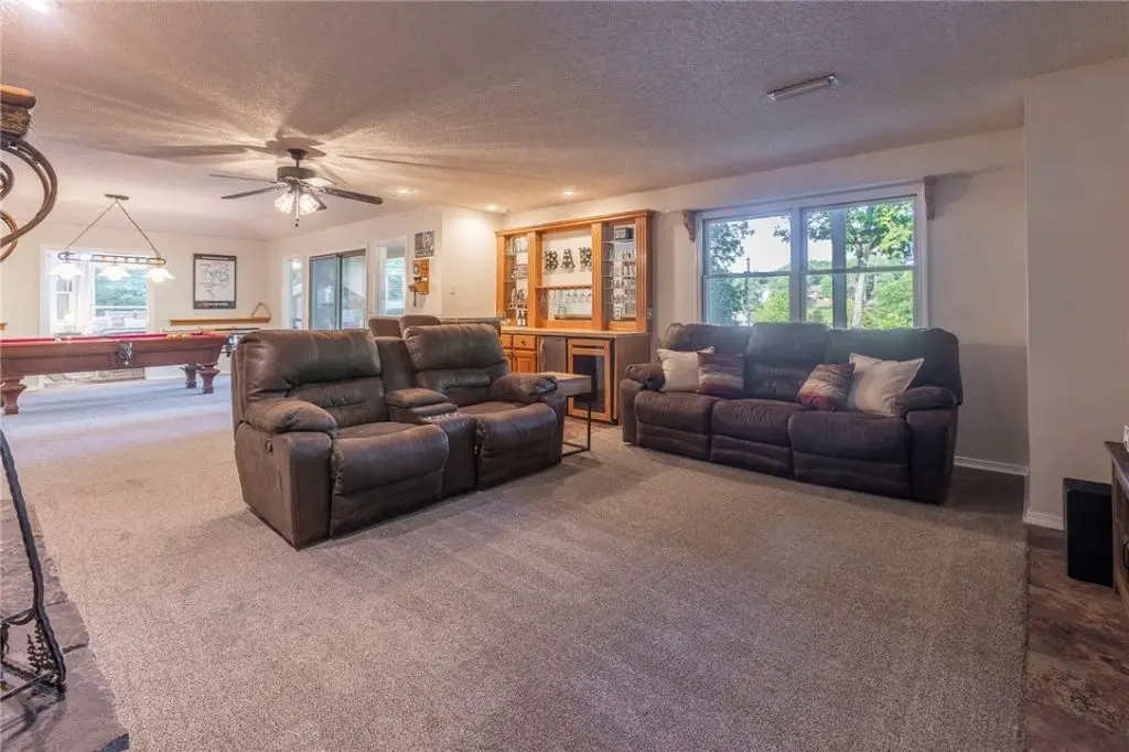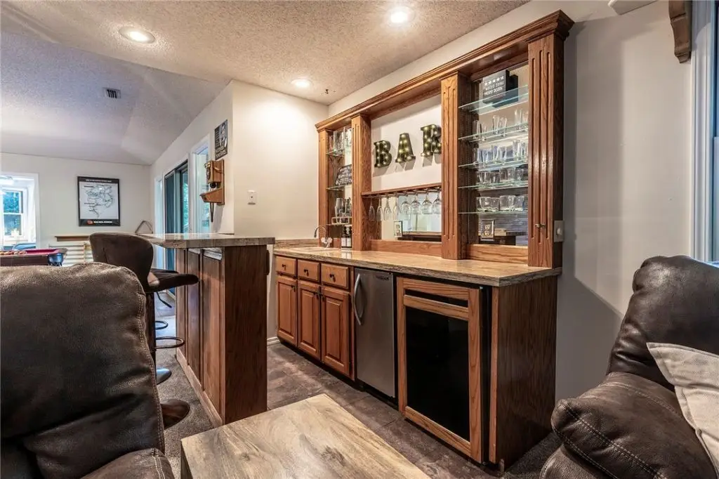 Park-Like, Secluded Lake-Front Living! 1.66 double lot with killer views and a private dock and covered boat lift. The oversized kitchen features granite counters, a double oven, gas cooktop, coffee station and massive amounts of storage. Throughout the upstairs, enjoy expansive lake views with 3 double doors accessing the deck and screened in porch. The upper living area has a propane fireplace while the lower level has a wood burning fireplace. In the primary bedroom + bath you'll find a private deck area, two walk-in closets, gorgeous marble double vanity, soaking tub, tiled shower and another walk-in closet. The laundry room has a sink with granite counters and even MORE storage. Downstairs you'll find 2 bedrooms, one full bath, and another living room/game room - the pool table conveys- and a wet bar to entertain your guests! Ice machine, sink + mini fridge in the downstairs bar convey as well. Brand new HVAC system in Jan 2024, Hot Water Tank 2019. New dishwasher in 2025. Lower level shop area + so much more!