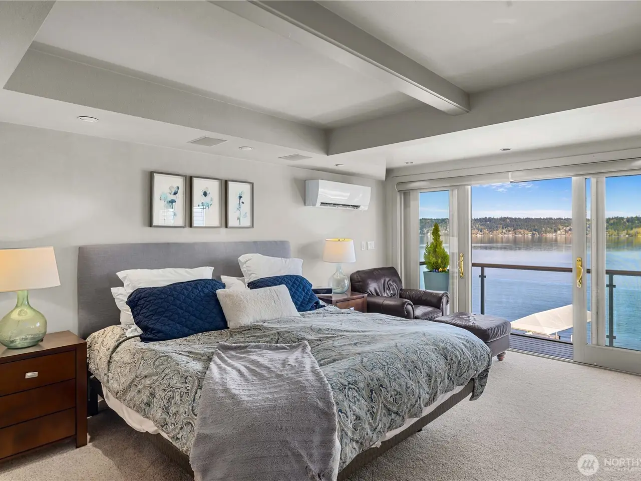 Tucked on a quiet lakeside lane with 90 feet of private Lake Sammamish shoreline, this NW contemporary retreat is a study in light, style, and serenity. Two-story windows and skylights fill the home with natural light, from the great room to the airy sunroom where lake breezes drift through the open NanaWall. Swim off the expansive dock, cast a line in the cove, or retreat to the cozy theater with wet bar. Evenings invite sunset dinners on the full-width deck, followed by a soak in the secluded hot tub tucked amidst lush landscaping. Upstairs, the serene primary suite offers storm-watching solitude and sweeping views. Extensively updated and thoughtfully designed - with rare 8-car parking - this is active waterfront living, beautifully refined.