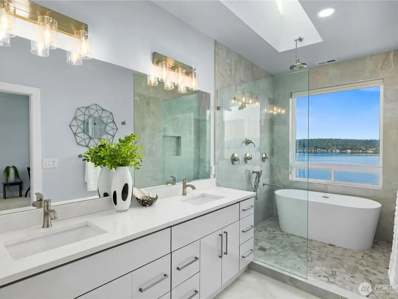 Perched above Lake Sammamish, this 2023 reimagined contemporary captures panoramic views—moonlight on glassy waters, eagles soaring and ski boats tracing silver ribbons below. A serene coastal palette of hardwoods, white cabinetry and soft blue accents echoes the lake beyond. Open living flows to view-filled decks for seamless indoor-outdoor living. Two primary suites—one on the main, one above with spa-inspired wet room—offer retreats of luxury, joined by lakeside bedrooms where every window frames water. A flat fenced yard with firepit, abundant parking, and added storage beneath the deck enrich daily life. Approved plans for a 670 SF ADU above the garage add future flexibility. A rare blend of design, versatility, and breathtaking views.