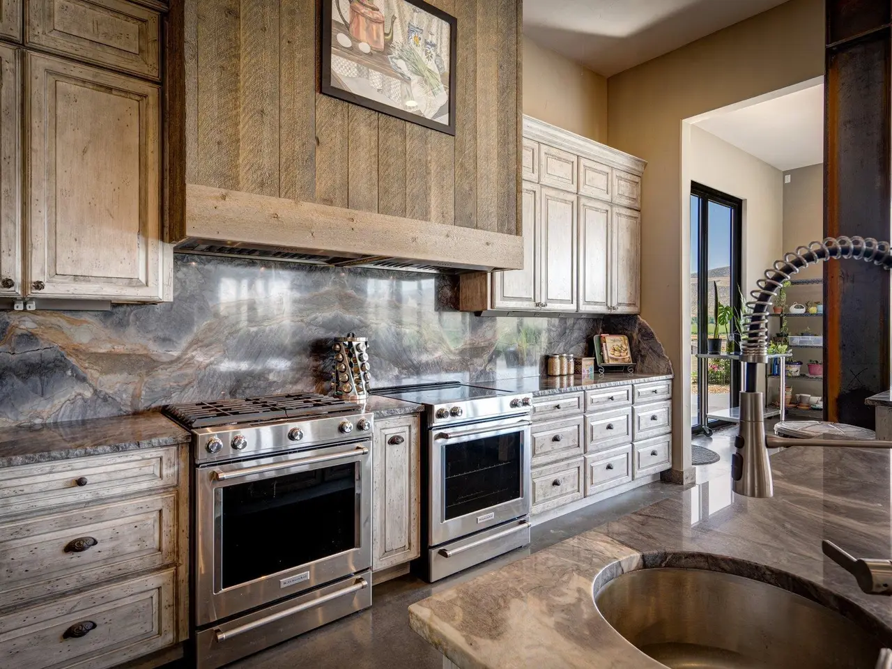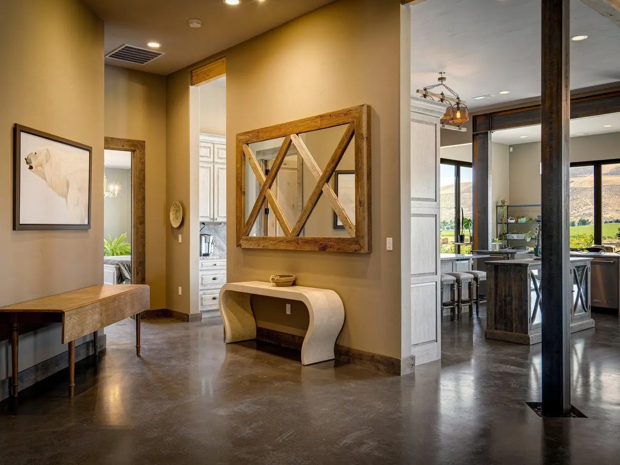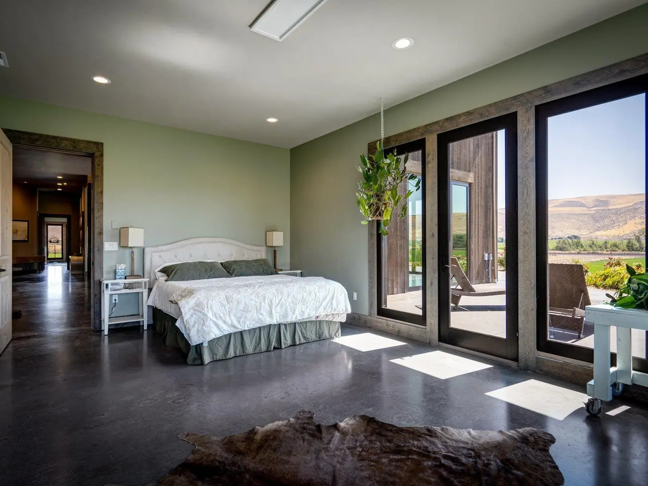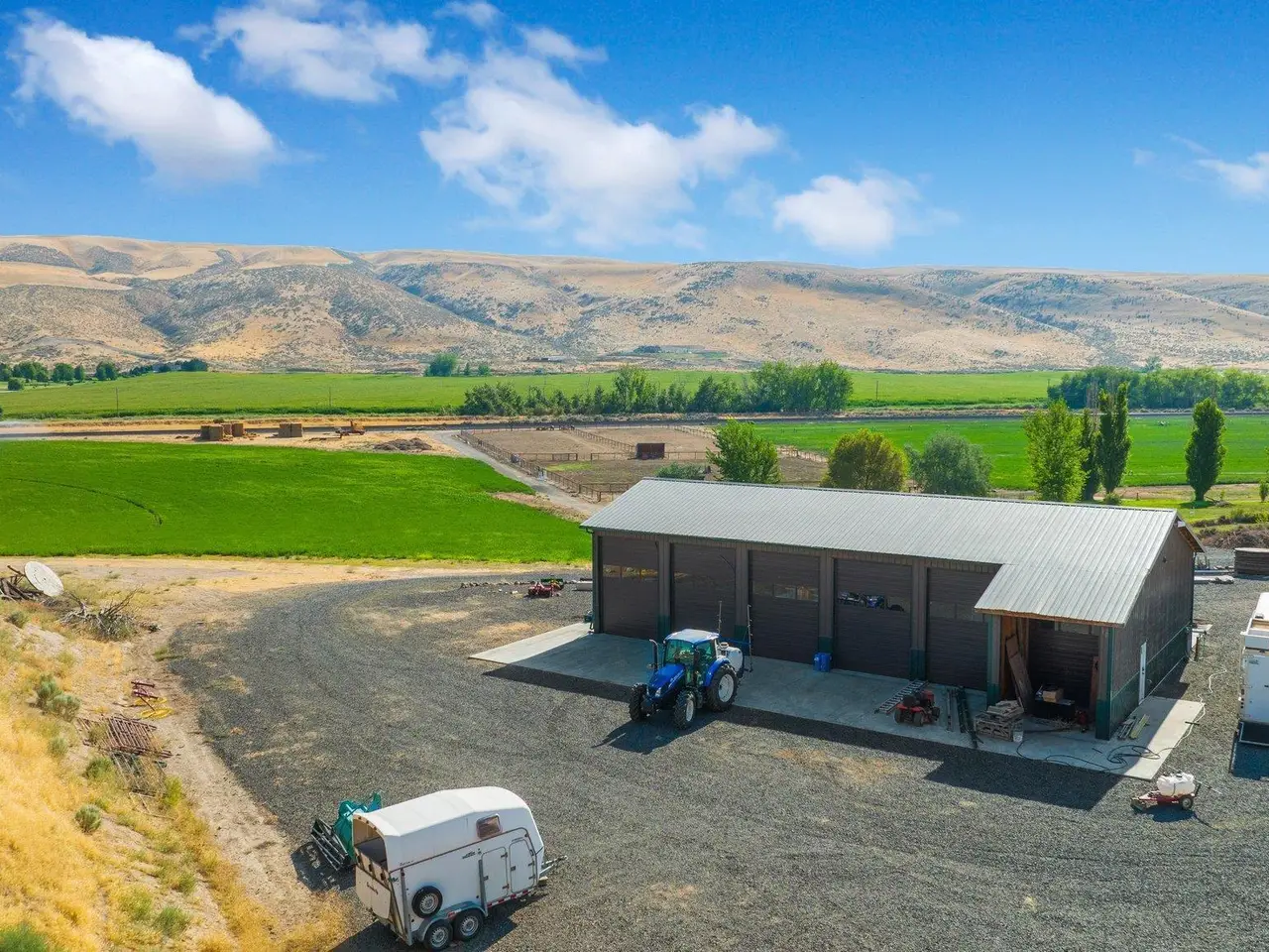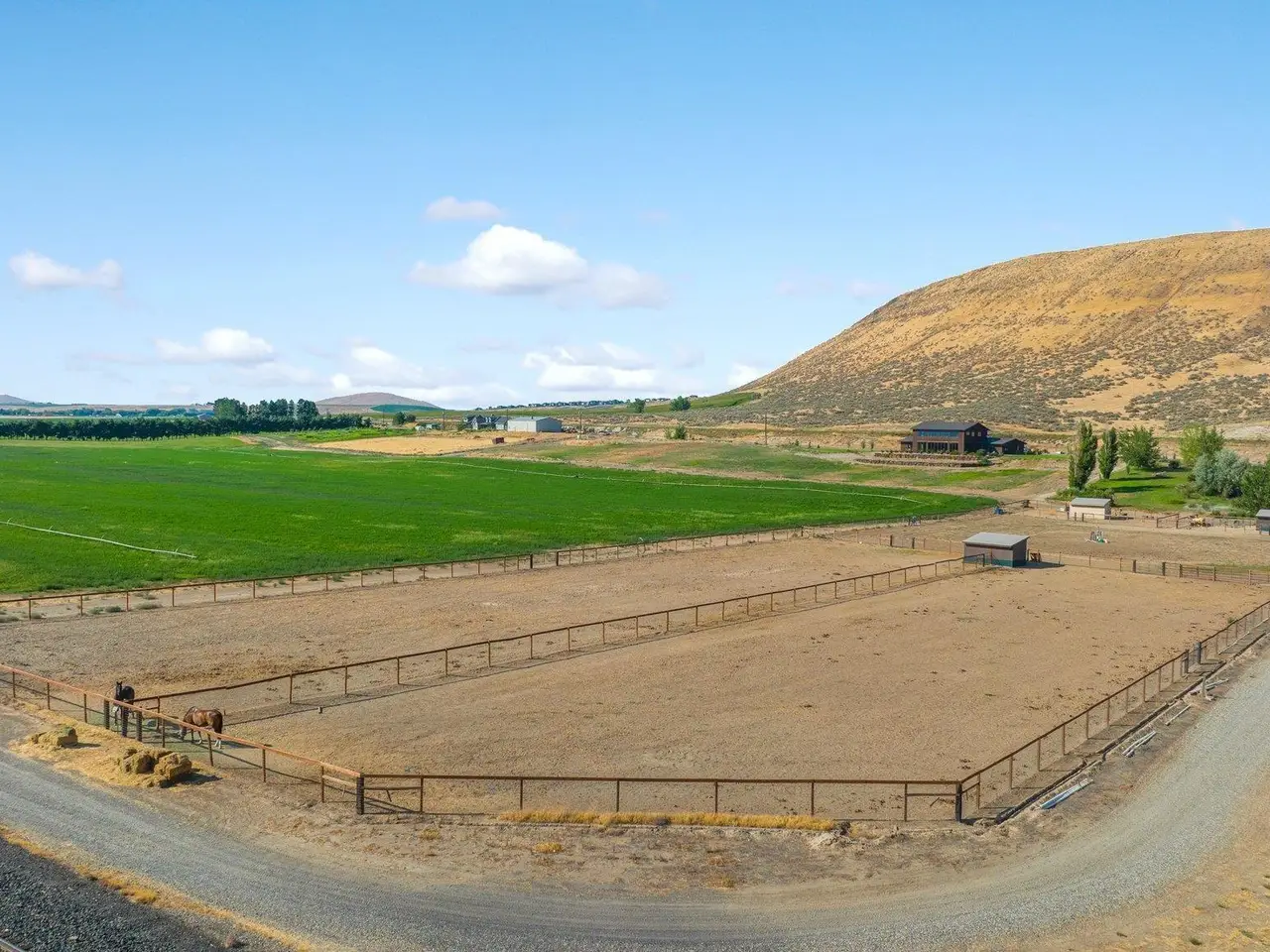Embrace the rustic charm of country living on this expansive view property that encapsulates the heart and soul of farm life. A span of approximately 46 acres offers both a haven for a myriad of farming and equestrian pursuits, and luxurious countryside dwelling. Surrounded by unparalleled 360-degree views of Badger Canyon is the 7,500 square foot estate home, exuding rustic elegance and offering a seamless blend of character and comfort. The main level spans 5,000 square feet, with an unfinished upper level adding another 2,500 square feet. Two separate two-car garages provide 1,250 square feet of automotive heaven. Unlock a world of indoor-outdoor living with over sixty linear feet of floor-to-ceiling glass panoramic doors and an expansive wrap-around concrete patio. Crafted from Montana Timber Products Ranchwood circle sawn cedar siding, the home effortlessly blends into the surrounding landscape. Step inside and discover the blend of natural elements and modern amenities that make this home so extraordinary. A custom Schonbek crystal chandelier suspended from the twelve-foot ceilings adds elegance and serenity, while the exposed timber and iron beams and hand-stained finished concrete flooring evoke a sense of timelessness and strength to the expansive open-concept design. The kitchen is a chef's dream, with custom soft-closed cabinetry and book-matched backsplash all topped with Brazilian Zumaia quartzite. A commanding seven-foot dual exhaust hood takes center stage, harmonizing with stonework and cabinetry. Designed for culinary enthusiasts and entertaining, the kitchen offers two of everything with dual islands, gas and electric ranges, dishwashers, and refrigerators, and can easily accommodate an entire family of chefs. Explore the 36'x72' workshop, featuring five bays including one pull-through, offering abundant space for diverse uses. Fully insulated and heated, with a RV water and electric hookup on site, and supported by two 200-amp service boxes. The land itself features 24 acres under a pivot, with ten acres in wheel lines, and an additional five acres in solid sets, all in alfalfa. At the heart of the farm, approximately three acres are a dedicated equine facility, featuring five-foot pressure treat and no-climb fencing, a 220'x210' watered riding arena, and a feed and tack shed. For the horses, there are two large turnout areas and four 50'x50' paddocks, each with water, electricity, and matted shelters. Make an appointment today to see the endless possibilities firsthand.