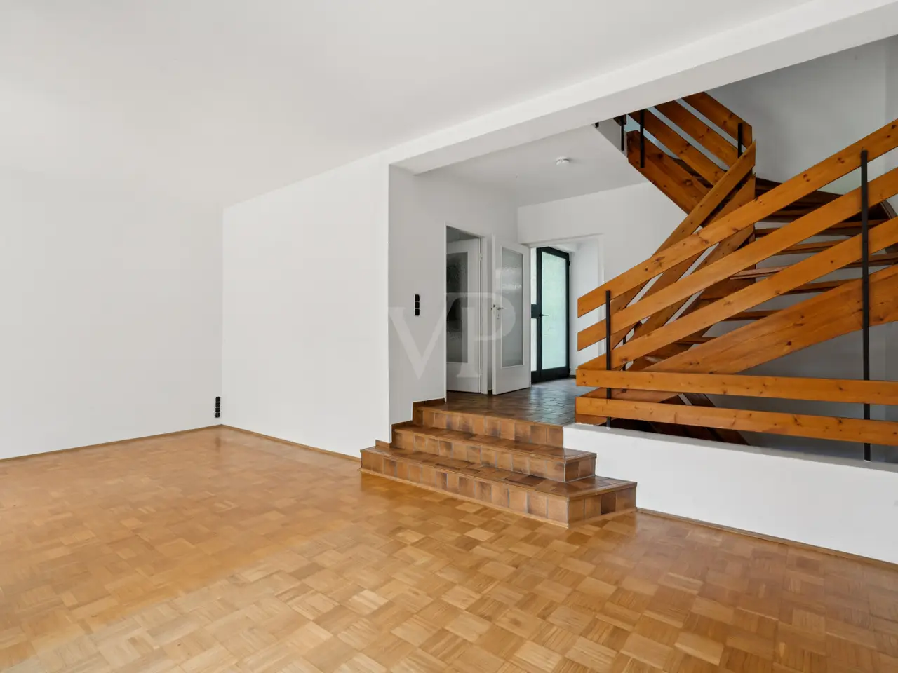 Detached house with great potential and sunny garden terrace A charming mid-terraced house is for sale, ideal for families or couples looking for a new home with great design potential. The house is located in a quiet side street in a sought-after area of Schmargendorf, surrounded by green gardens and dense vegetation. The location offers pleasant privacy, ideal for families and anyone who appreciates peace and quiet. The property was built in 1977 and has a living space of approximately 102 m². It is situated on a plot of around 241 m². The house, which is in need of renovation, offers an excellent basis for individual design and modernization. On the first floor of the house there is a bright living and dining area with parquet flooring, which receives plenty of natural light through large window fronts and conveys an amazing feeling of space thanks to its room height of approx. 3.01 m. From here, you have direct access to the spacious south-west-facing garden terrace, which is equipped with an awning and invites you to spend relaxing hours outdoors without being too much in your neighbor's field of vision! The garden is densely overgrown and still offers several design options! The well-maintained fitted kitchen is equipped with high-quality Siemens electrical appliances and allows you to enjoy a pleasant cooking experience. Blinds on the first floor ensure a pleasant indoor climate and security. The upper floor houses three bedrooms, one of which offers direct access to an inviting balcony with impressive garden views. The other two rooms can be used as a children's room, study or guest room. There is also a bathroom with a bathtub and bidet. The house has a full basement and therefore has plenty of storage space and potential uses. The hobby room (not included in the living space) is particularly noteworthy in this context with a ceiling height of approx. 2.28 m and is ideal for accommodating your guests! The oil central heating was renewed in 2015 and has a 5000-liter tank, which ensures an efficient heat supply. The property is part of a homeowners' association (WEG) with a total of eight owners, with the monthly rent amounting to €330.23. The house also has a garage with enough space for a vehicle. Please note that the property is in need of renovation, but this gives you the opportunity to design it according to your personal ideas. With its great potential, this property offers an excellent opportunity to create a home entirely according to your own wishes. It is suitable for both handy buyers and families looking for a customizable home in an appealing neighborhood. Feel free to arrange a viewing to see the possibilities of this property for yourself.