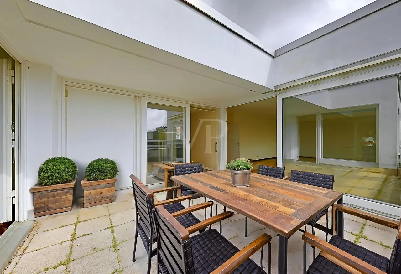 Spacious top-floor living with sunny south-facing terrace This charming top-floor apartment (5th floor) can be easily reached by elevator. It is located in a well-kept apartment building from 1969 and, with approx. 130 m² of living space, offers a spacious and comfortable home in the immediate vicinity of Kurfürstendamm. The apartment impresses with its central location and at the same time with its remarkable tranquillity! It has three rooms and impresses with its well thought-out room layout. The centerpiece is the open-plan living and dining area with access to the south-facing sun terrace - ideal for relaxing hours outdoors or social gatherings. Particularly noteworthy is the approx. 40 m² living room, which impresses with its brightness and far-reaching views. The quiet bedroom, facing north, offers pleasant coolness on warm days and serves as a perfect retreat. A separate, walk-in closet is directly adjacent. Another room can be used flexibly as a children's room, guest room or study - according to your needs. Two modern bathrooms provide additional comfort: one with a shower, the other with a bathtub - ideal for a quick start to the day or a relaxing bath in the evening. The kitchen is generously proportioned and offers plenty of space for your culinary ideas. A modern district heating system ensures even and energy-efficient heat distribution in all rooms. Undoubtedly the highlight: the spacious terrace. It offers numerous possibilities for individual design - whether for relaxing, gardening or for cozy evenings with friends. The location scores points for its excellent transport links and proximity to shopping facilities, schools and a wide range of leisure activities. The surrounding area offers a pleasant living atmosphere with an excellent infrastructure and short distances to all everyday amenities. Additional features include a private cellar room and practical communal areas such as a bicycle and drying room. There is also plenty of storage space within the apartment. It is possible to rent a parking space. The apartment was last modernized in 2020 and is in an attractive condition, but in need of renovation. Are you looking for a new home with plenty of space, two bathrooms and a sunny outdoor area in an absolute top location? Then come and see for yourself during a viewing on site. We look forward to your inquiry!