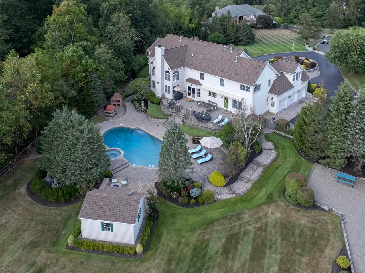 An Exceptional Residence in Basking Ridge Tucked at the end of a serene cul-de-sac and surrounded by lush, mature landscaping, this distinguished five-bedroom residence offers both privacy and sophistication. Designed for seamless living and entertaining, the sunlit interior features generously scaled rooms, thoughtful design, and an elegant flow throughout. At the heart of the home, a stunning kitchen with top-tier appliances and ample gathering space opens directly to an expansive two-tiered patio. Here, a pool house, outdoor fireplace, and sparkling pool create the perfect backdrop for effortless indoor/outdoor entertaining. The first floor also provides flexibility with a potential bedroom or private office paired with a full bath. Upstairs, the luxurious primary suite boasts a sitting area with a cozy gas fireplace, dual walk-in closets, and a spacious bath with soaking tub and abundant natural light. Three additional bedrooms and a spacious exercise room complete this level. The newly renovated, walk-out lower level impresses with a sprawling recreation room, custom bar, full bath, and potential guest suite, offering exceptional space for both relaxation and entertaining. Ideally located just minutes from downtown shops, restaurants, and Midtown Direct trains, this residence offers a perfect blend of country tranquility and everyday convenience, close to top schools, world-class golf, parks, and equestrian facilities.