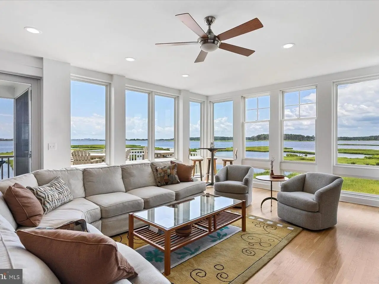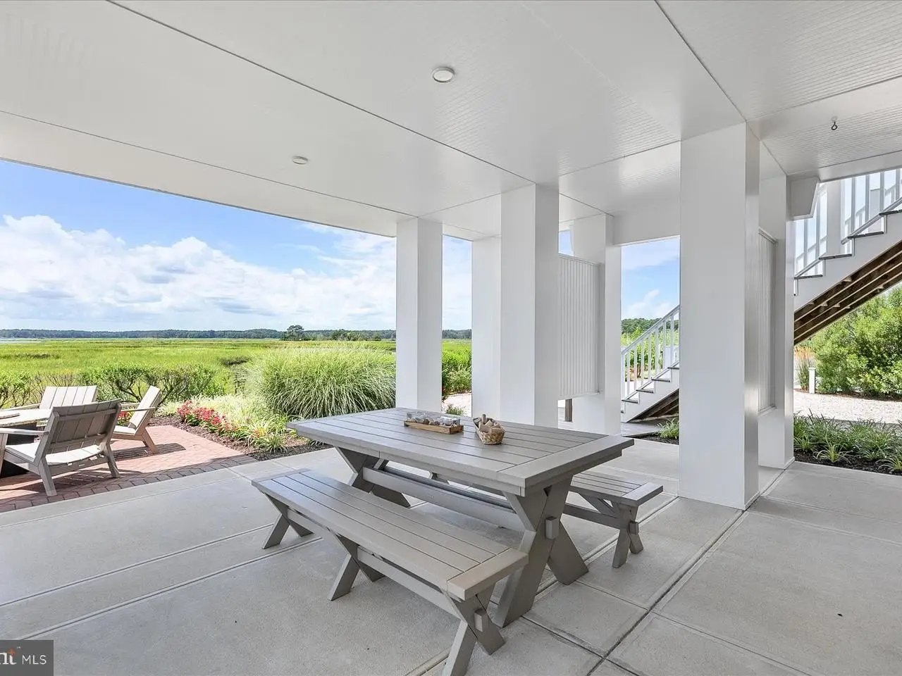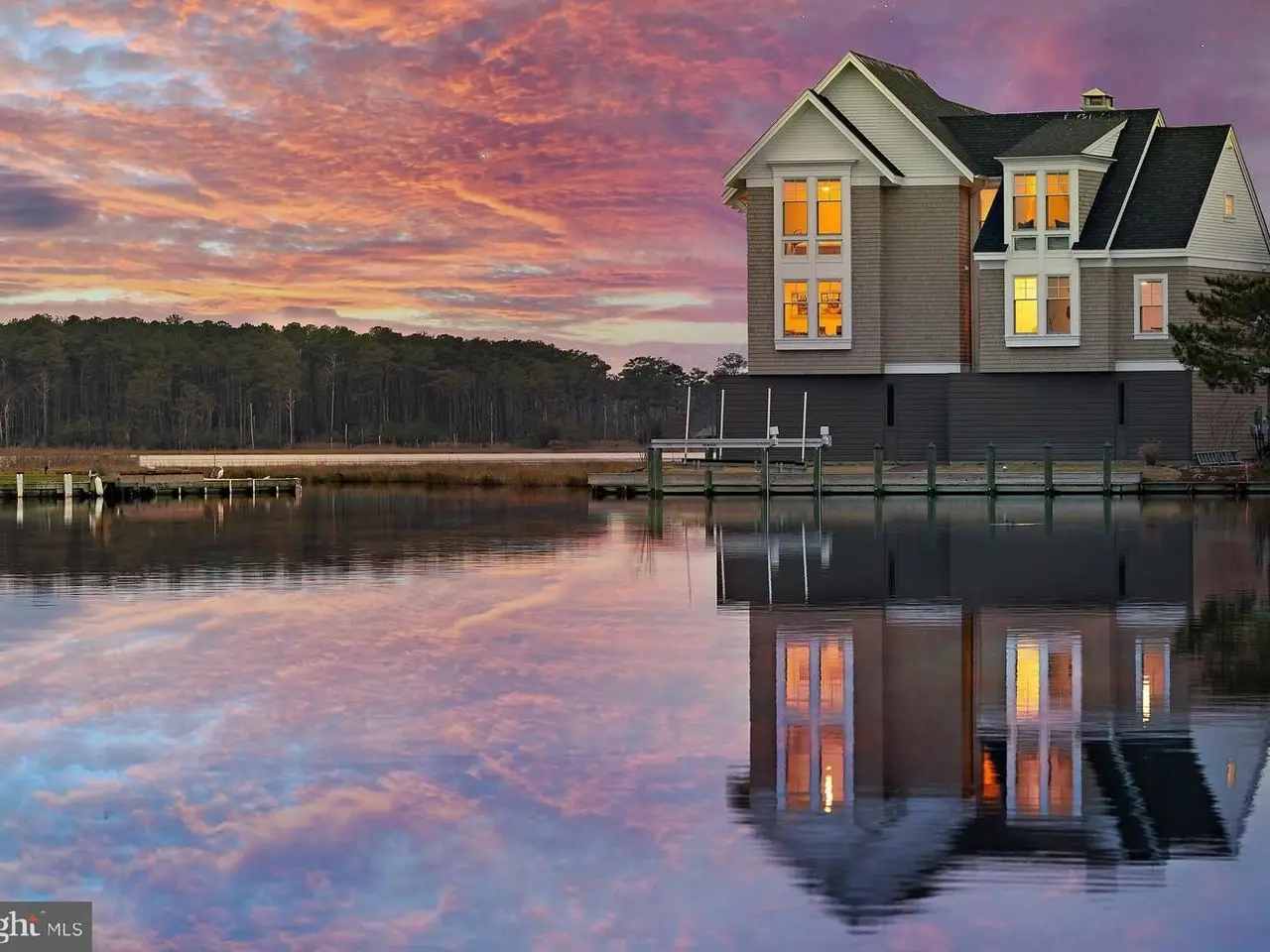 Take in unparalleled panoramic bay views from every room of this sophisticated modern beach home, ideally located on one of the most sought-after bayfront properties with water on three sides of the home. Complete with a private 50-foot dock, boat lift, and double jet ski lift, this exceptional residence was impressively designed, featuring high-end finishes and craftsmanship throughout. The expansive great room, with floor-to-ceiling windows on two sides, effortlessly frames sweeping views of the water and seamlessly blends the living, dining, and gourmet kitchen spaces. A large work island, bar with seating, and premium appliances elevate this culinary and entertaining space with easy access to a screened porch and open deck with views that are unable to be duplicated. The main level also offers a cozy family room, two guest bedrooms, and a full bathroom, along with a convenient powder room for guests. Upstairs, the bayfront primary suite is a tranquil retreat with its own private waterfront deck. Three generously-sized guest rooms each feature en-suite bathrooms, ensuring ample space and privacy for visitors. On the ground level, a spacious workshop and covered patio provide the perfect setting for crab feasts and relaxation, while the brick paver patio offers an ideal spot for evening bonfires by the water. The outdoor shower with a changing area makes clean-ups after a day on the beach or boat a breeze, and a two-car garage plus second one-car garage provide ample storage and convenience for all your vehicles, beach gear, kayaks, canoes, boating accessories, and bikes. Additional highlights include an elevator shaft for future conversion, geothermal hvac, and a location that's impossible to duplicate-situated on a peninsula with sweeping views of the bay and wetlands, yet just moments from the beach. Homes of this caliber, in such a prime location, are a rare offering.