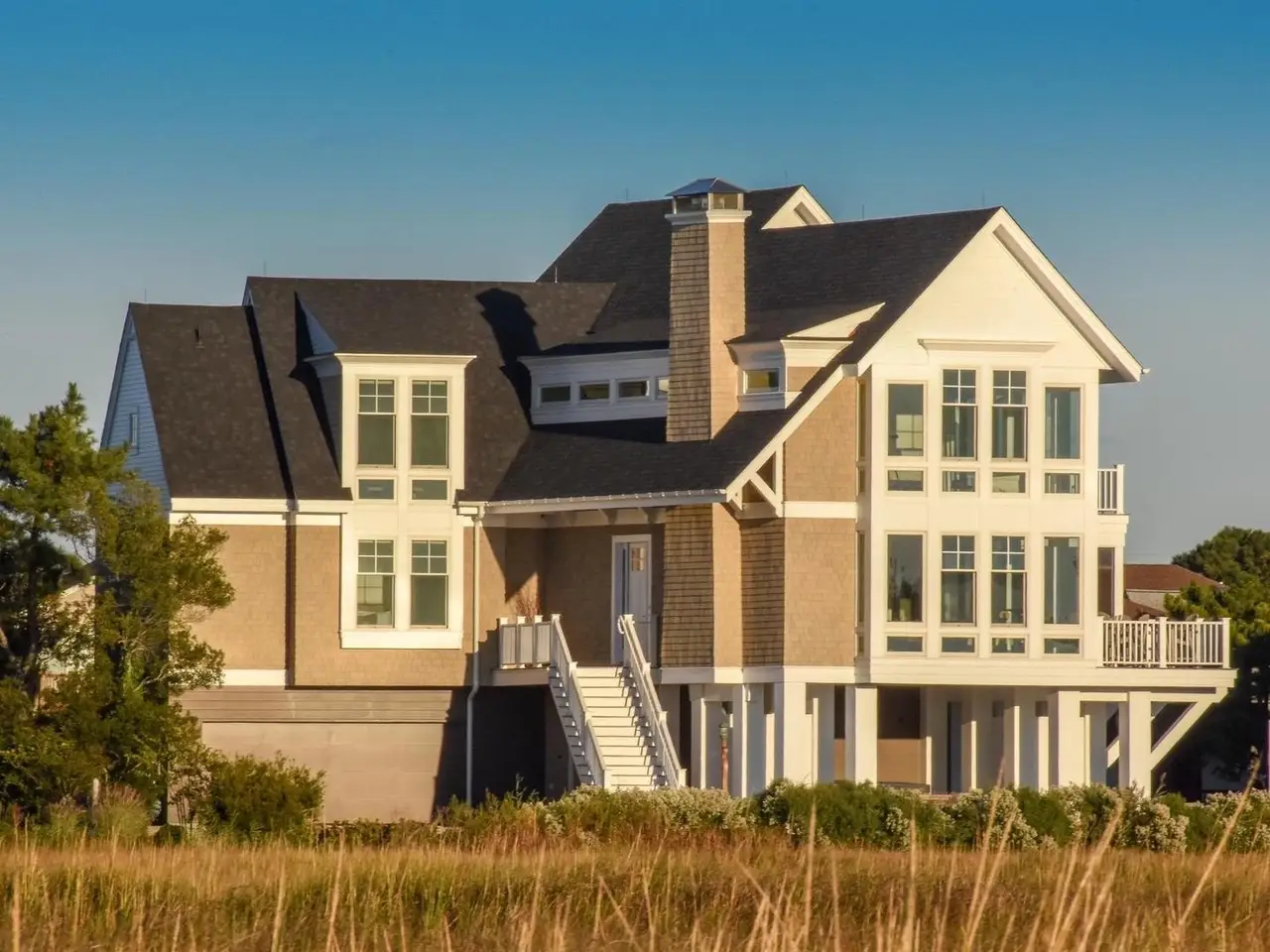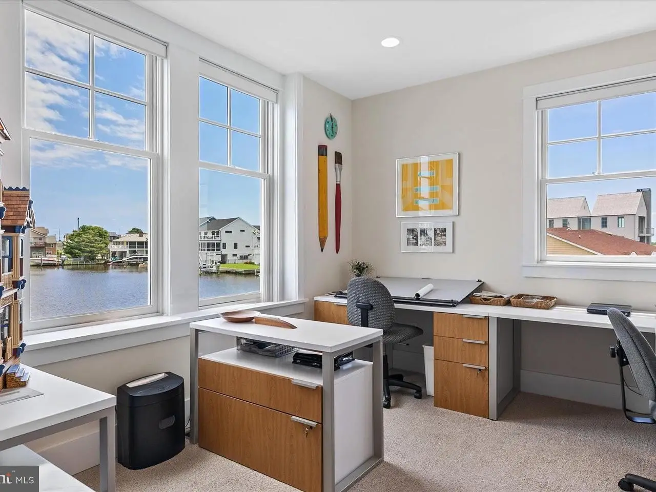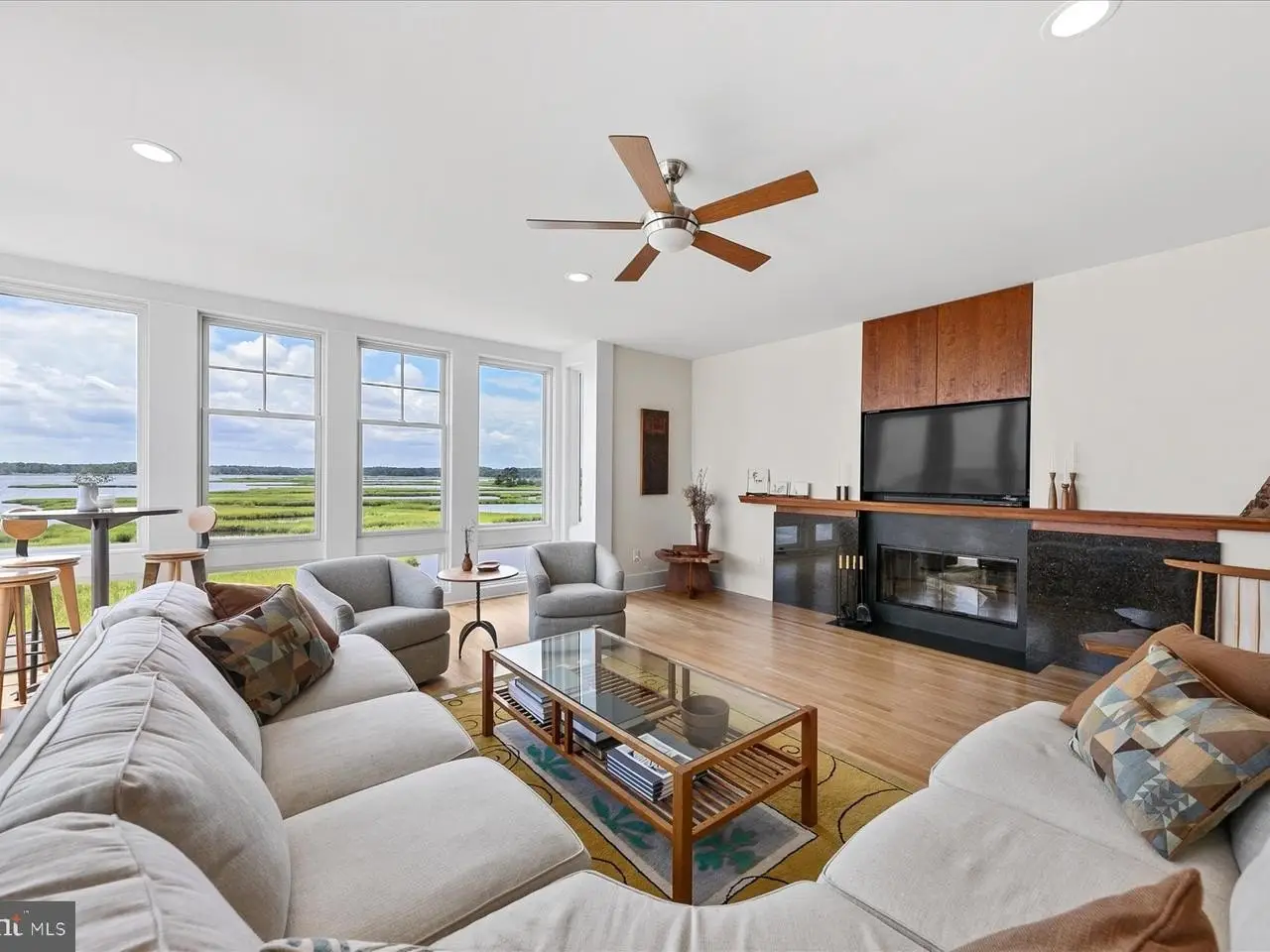 Take in unparalleled panoramic bay views from every room of this sophisticated modern beach home, ideally located on one of the most sought-after bayfront properties with water on three sides of the home. Complete with a private 50-foot dock, boat lift, and double jet ski lift, this exceptional residence was impressively designed, featuring high-end finishes and craftsmanship throughout. The expansive great room, with floor-to-ceiling windows on two sides, effortlessly frames sweeping views of the water and seamlessly blends the living, dining, and gourmet kitchen spaces. A large work island, bar with seating, and premium appliances elevate this culinary and entertaining space with easy access to a screened porch and open deck with views that are unable to be duplicated. The main level also offers a cozy family room, two guest bedrooms, and a full bathroom, along with a convenient powder room for guests. Upstairs, the bayfront primary suite is a tranquil retreat with its own private waterfront deck. Three generously-sized guest rooms each feature en-suite bathrooms, ensuring ample space and privacy for visitors. On the ground level, a spacious workshop and covered patio provide the perfect setting for crab feasts and relaxation, while the brick paver patio offers an ideal spot for evening bonfires by the water. The outdoor shower with a changing area makes clean-ups after a day on the beach or boat a breeze, and a two-car garage plus second one-car garage provide ample storage and convenience for all your vehicles, beach gear, kayaks, canoes, boating accessories, and bikes. Additional highlights include an elevator shaft for future conversion, geothermal hvac, and a location that's impossible to duplicate-situated on a peninsula with sweeping views of the bay and wetlands, yet just moments from the beach. Homes of this caliber, in such a prime location, are a rare offering.