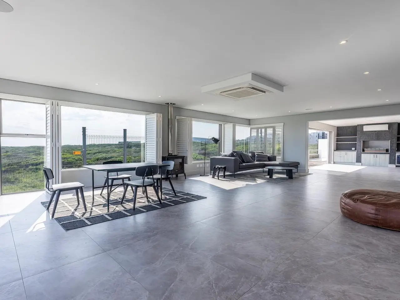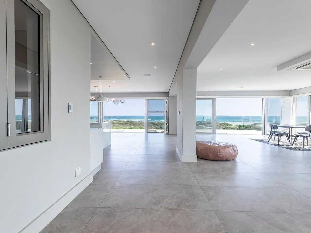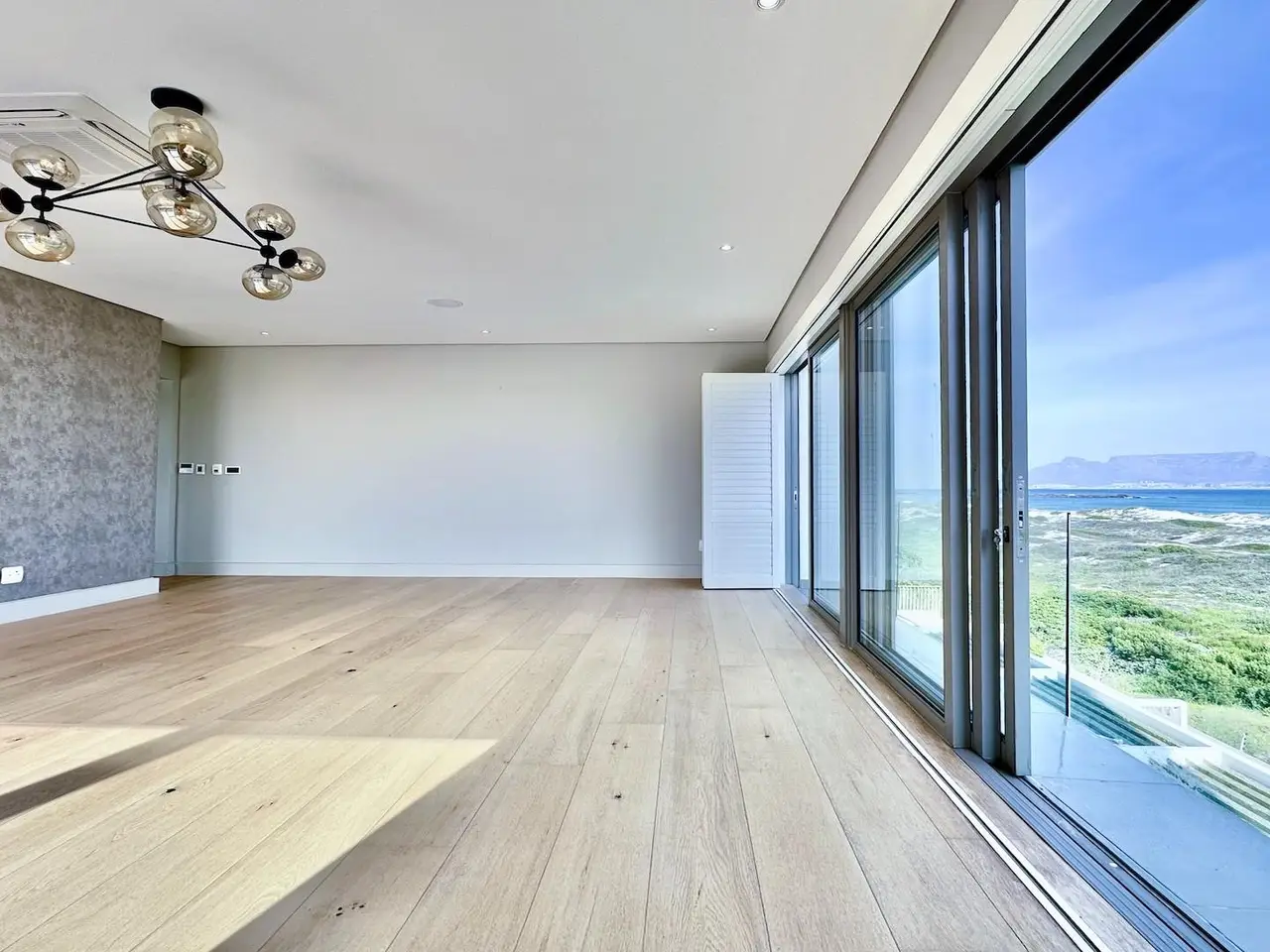 Positioned within the exclusive Water's Edge Beach Estate, this extraordinary 860m² architectural masterpiece offers a lifestyle of unparalleled luxury and space. This is more than a residence; it's a front-row seat to the breathtaking beauty of the Atlantic Ocean, iconic Table Mountain, and historic Robben Island. Spanning three magnificent levels and serviced by a private luxury lift, the home features five palatial en-suite bedrooms, each a sanctuary of comfort and privacy. The home's core is a spectacular open-plan entertainment area, where the living, dining, and a gourmet kitchen merge seamlessly with the natural beauty of the outdoors. The kitchen is a chef's dream, appointed with state-of-the-art appliances and a discreet, separate scullery. For seamless indoor-outdoor living, a dedicated braai room opens to a seaside vista over the protected fynbos greenbelt, perfect for elegant alfresco dining. Lower Level: • Home Gym: A dedicated space for your private fitness routine. • Versatile Rooms: Two expansive, adaptable rooms perfect for a state-of-the-art home cinema, a sophisticated cellar and bar, a games room, or a private home office. • Guest Bathroom: Servicing the lower level with style. • Two Quiet Bedroom Suites: Providing exceptional privacy for guests or family. • Operations Room: A functional space for the home's technical needs. Ground Floor: • Expansive Living Areas: A vast, fluid space designed for grand entertaining and intimate gatherings. • Seamless Transition: Wall-to-wall glass sliding doors open to a sun-drenched seaside deck with a jacuzzi. • Gourmet Kitchen: Featuring a private scullery and pantry, designed for both functionality and elegance. • Indoor Braai Area: An integrated lounge and dining space that blends indoor comfort with outdoor views. • Guest Bedroom Suite: A private, ground-floor suite. • Guest Bathroom: Conveniently located for guests. • Direct Garage Access: A double garage provides secure and easy access. First Floor: • Master Suite: An opulent master retreat with a dressing room, private terrace and sweeping, panoramic ocean and mountain views. • Shared Terrace: A private terrace is shared between the two bedroom suites on this floor, offering a secluded space to enjoy the stillness of nature and beach views. • Second Bedroom Suite: A luxurious suite with access to the terrace overlooking the greenbelt and ocean. Embrace a lifestyle where the untamed beauty of the ocean meets the refined elegance of a world-class residence.