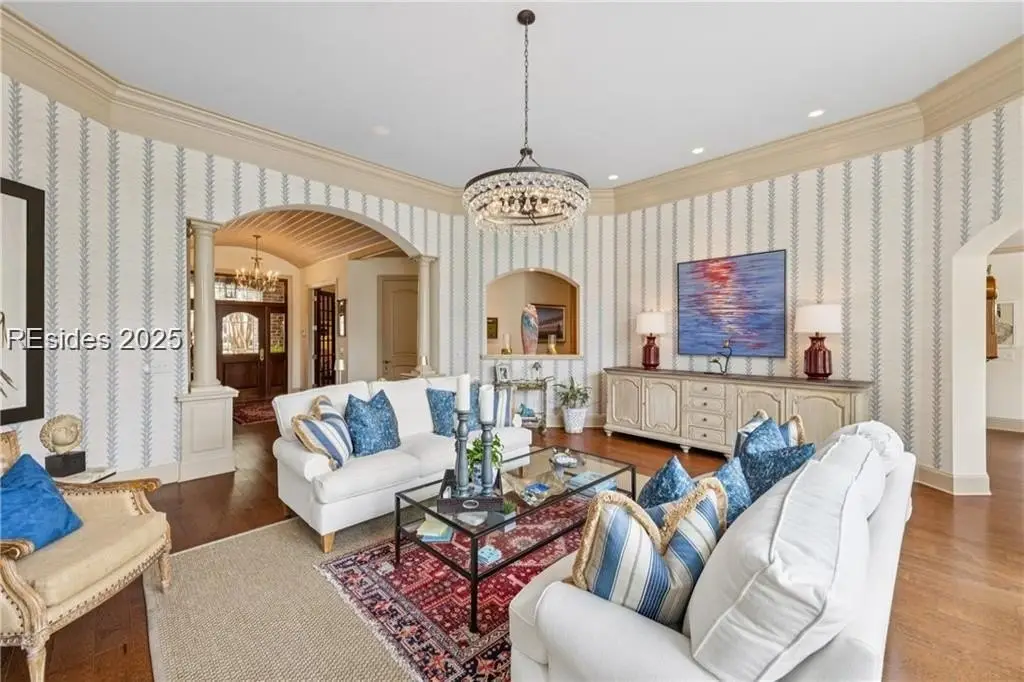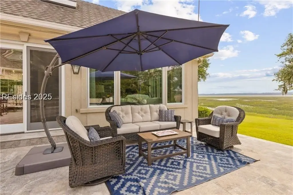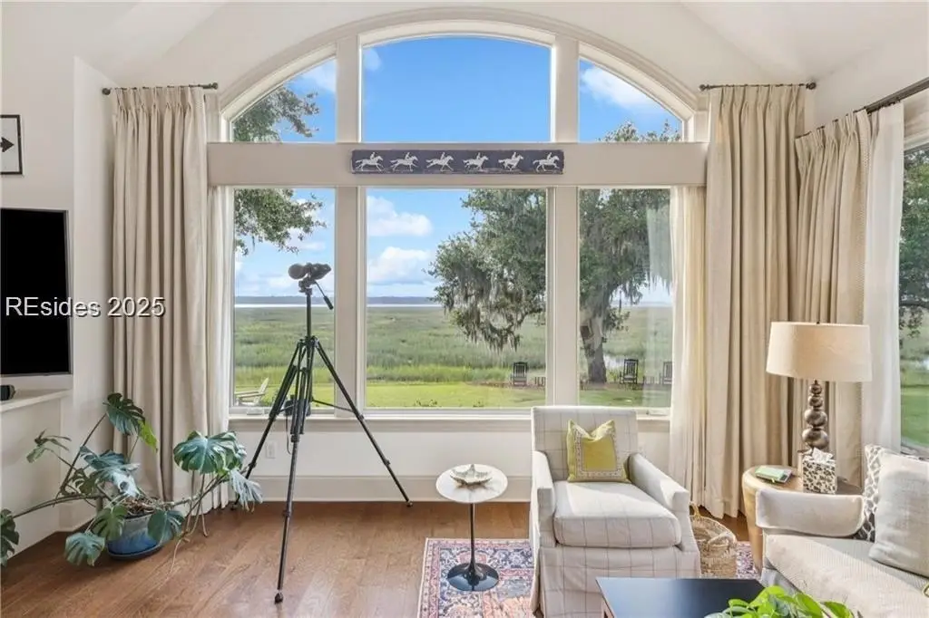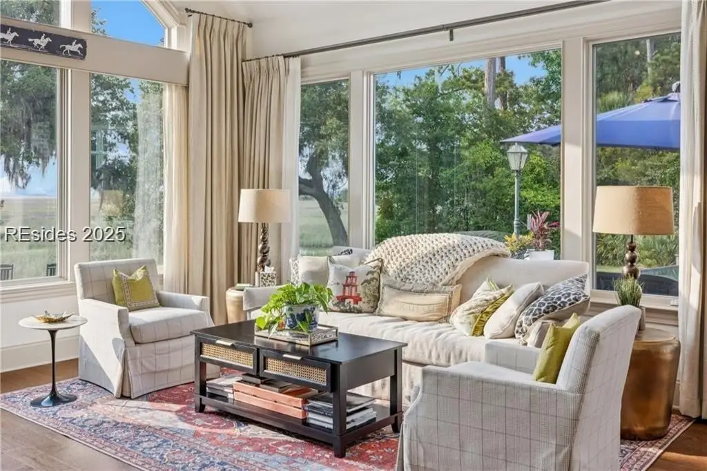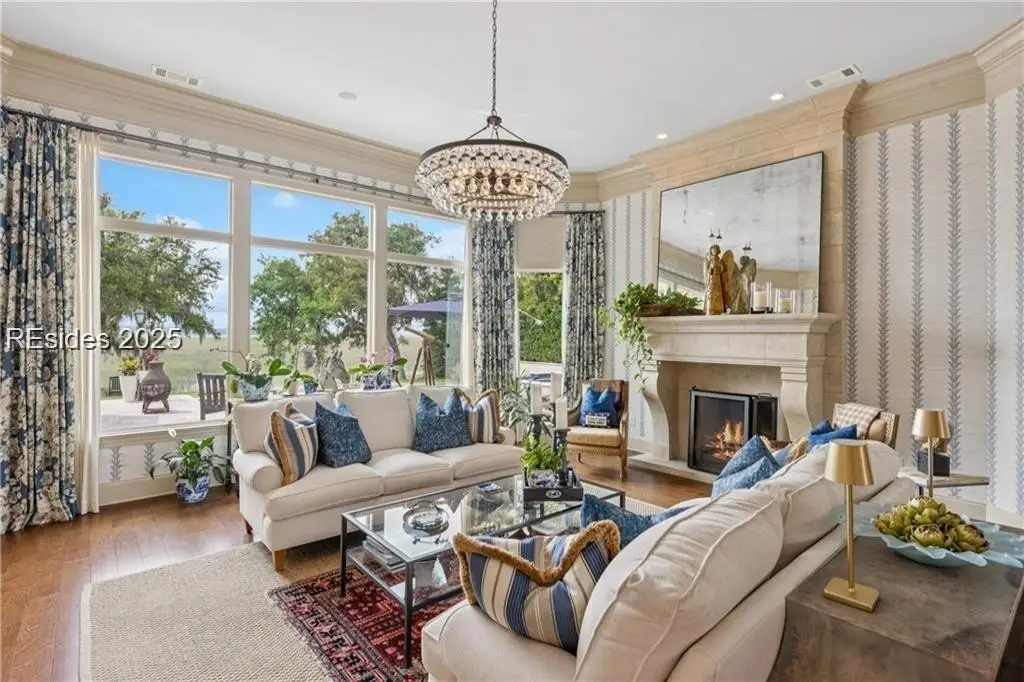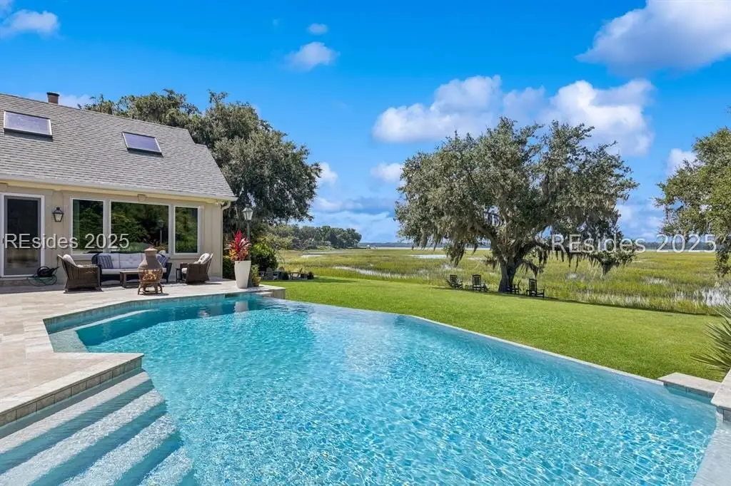 Spectacular marsh-to-river views framed by live oaks in this beautifully updated custom home. Enter through a gated garden into soaring 12’ ceilings, abundant light, and elegant living spaces. The chef's kitchen boasts a Wolf range, 4 ovens, Sub-Zero fridge, wine fridge, 10' island, 2 dishwashers, and more. First-floor primary suite has dual walk-in closets and a private laundry. Bonus room, custom closets, second laundry, new carpet (2023), HVAC (2020), pool heat/cool pump (2024), UV window film, custom built-ins, fire pit, and more. It's an ideal layout for entertaining and hosting family.