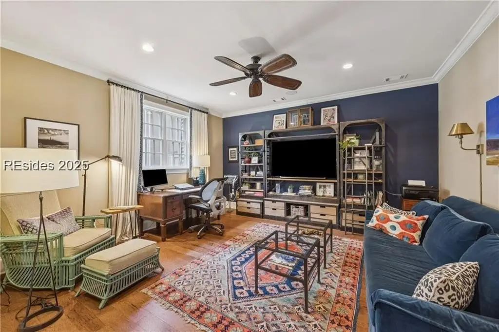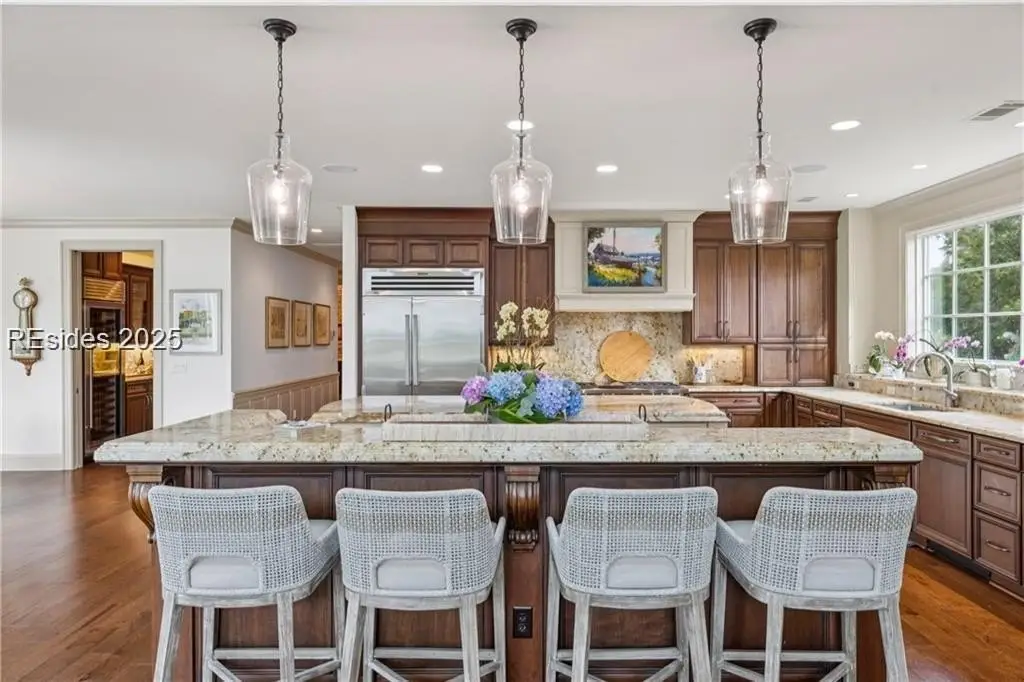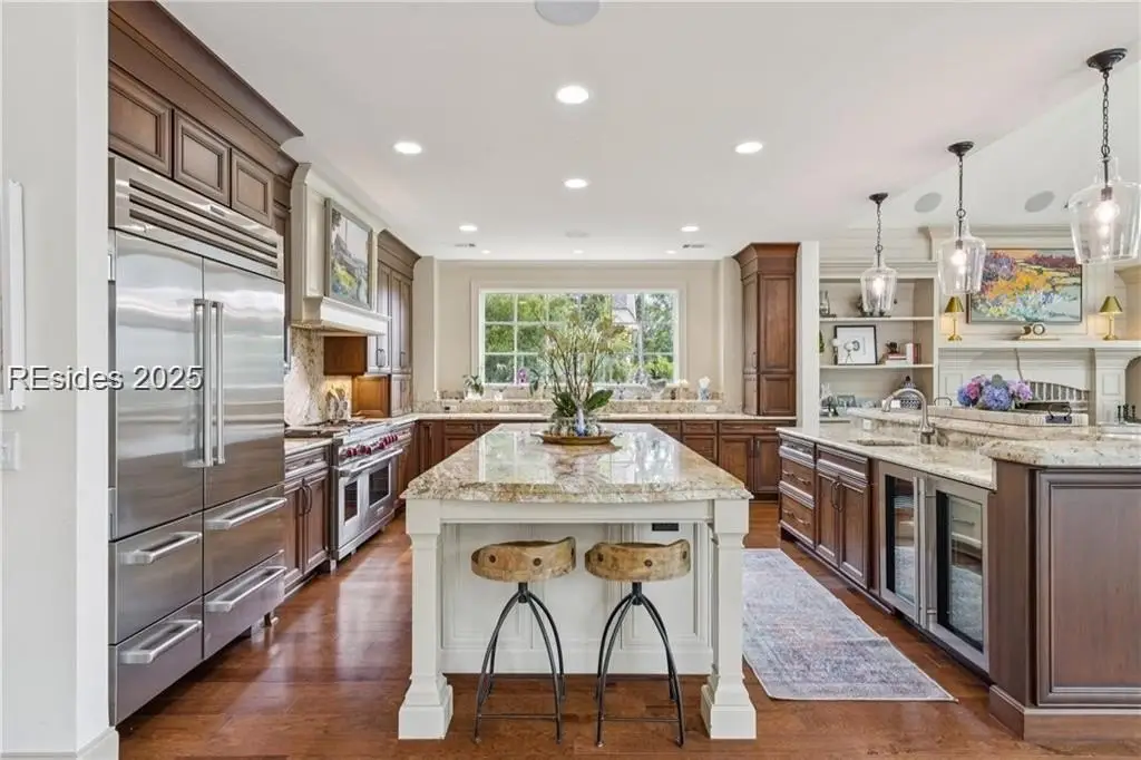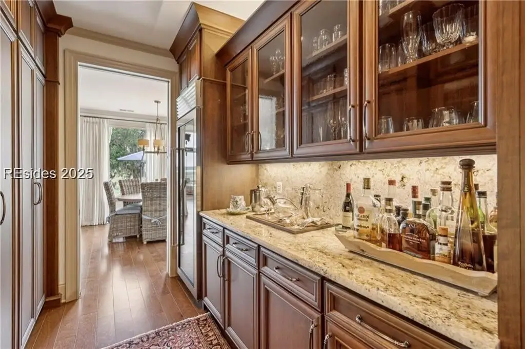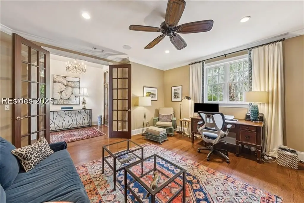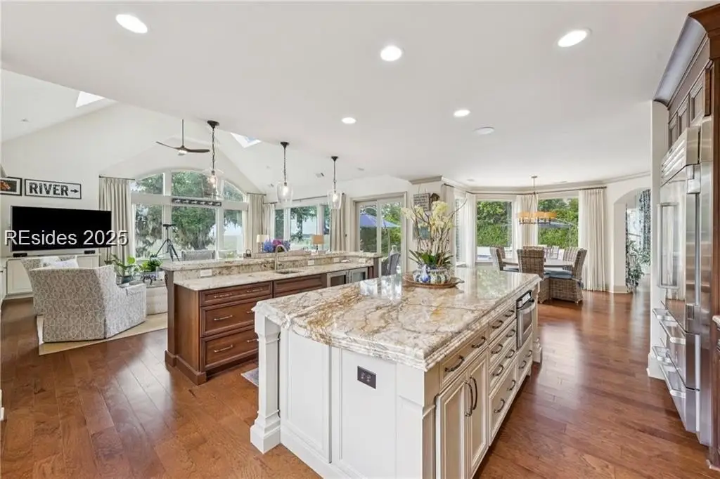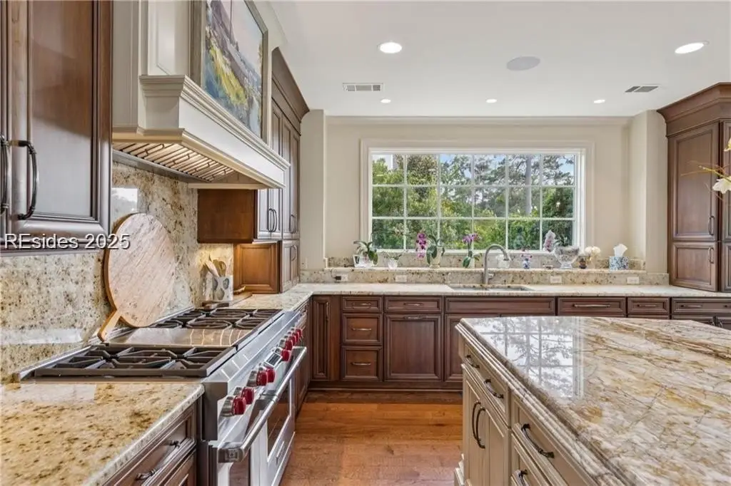 Spectacular marsh-to-river views framed by live oaks in this beautifully updated custom home. Enter through a gated garden into soaring 12’ ceilings, abundant light, and elegant living spaces. The chef's kitchen boasts a Wolf range, 4 ovens, Sub-Zero fridge, wine fridge, 10' island, 2 dishwashers, and more. First-floor primary suite has dual walk-in closets and a private laundry. Bonus room, custom closets, second laundry, new carpet (2023), HVAC (2020), pool heat/cool pump (2024), UV window film, custom built-ins, fire pit, and more. It's an ideal layout for entertaining and hosting family.
