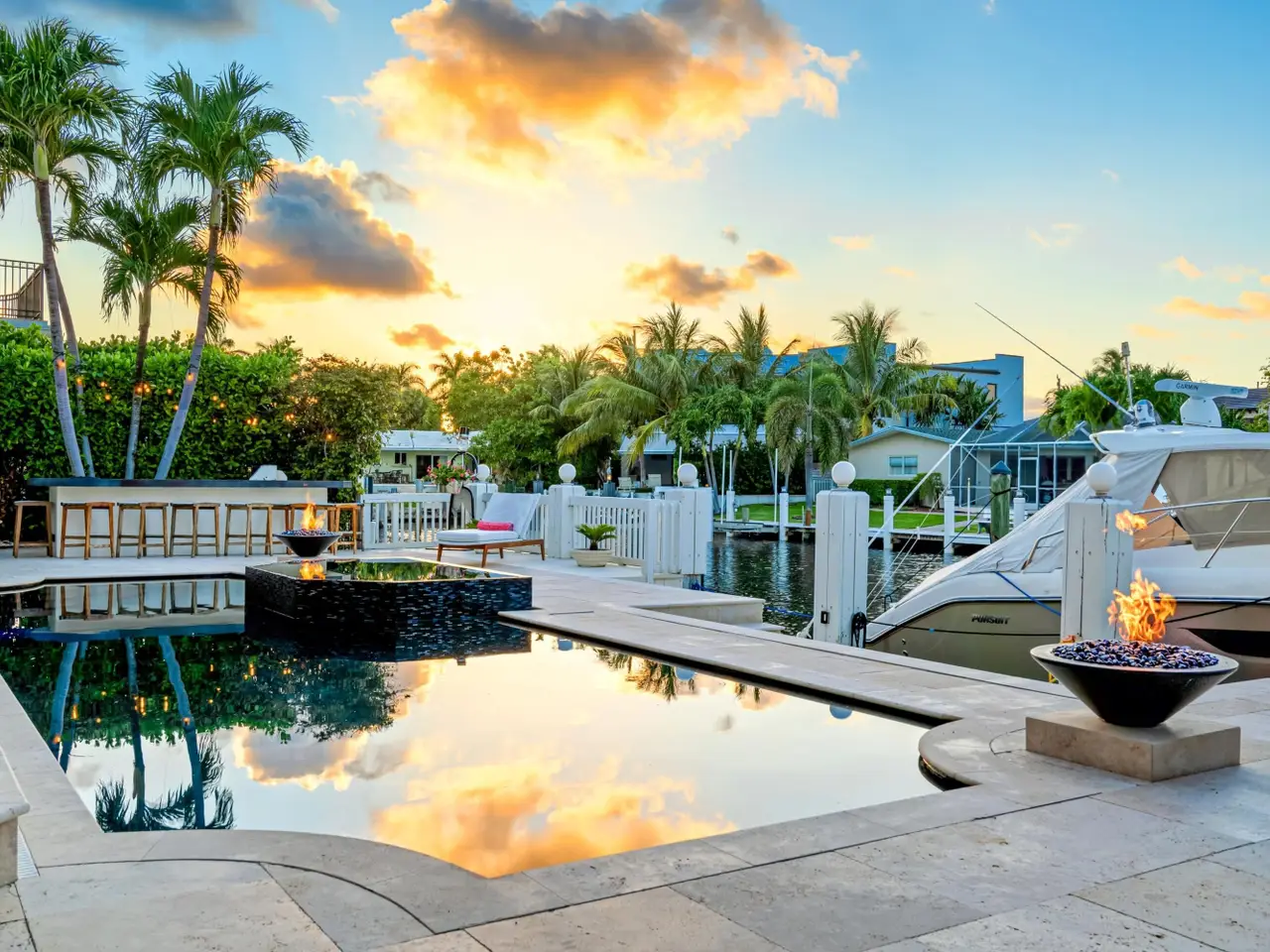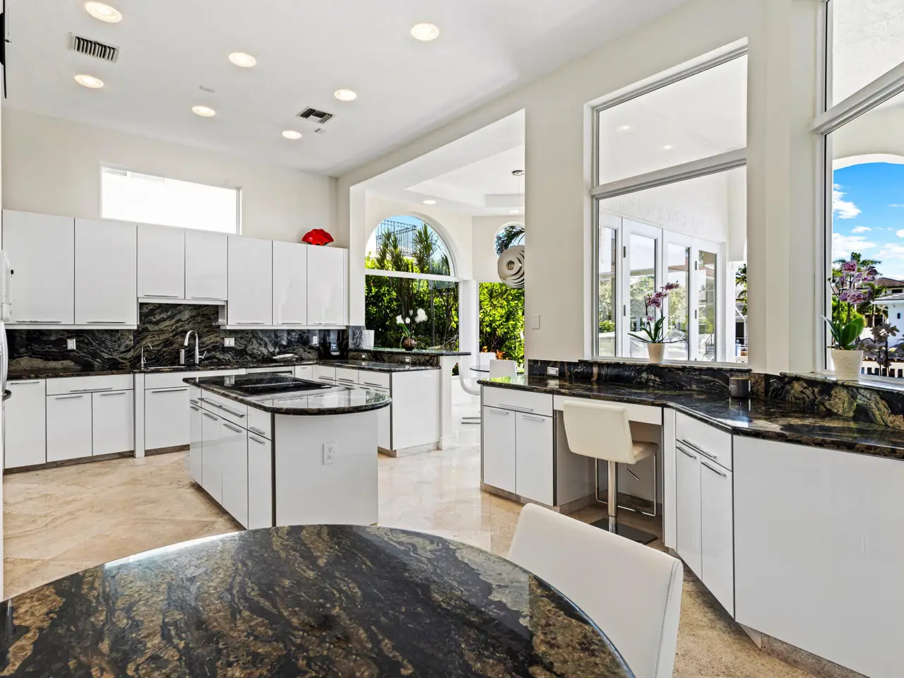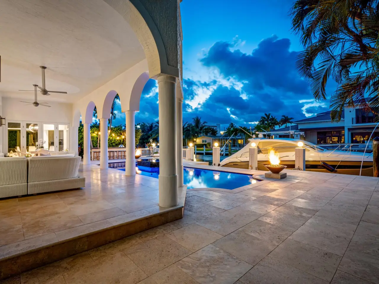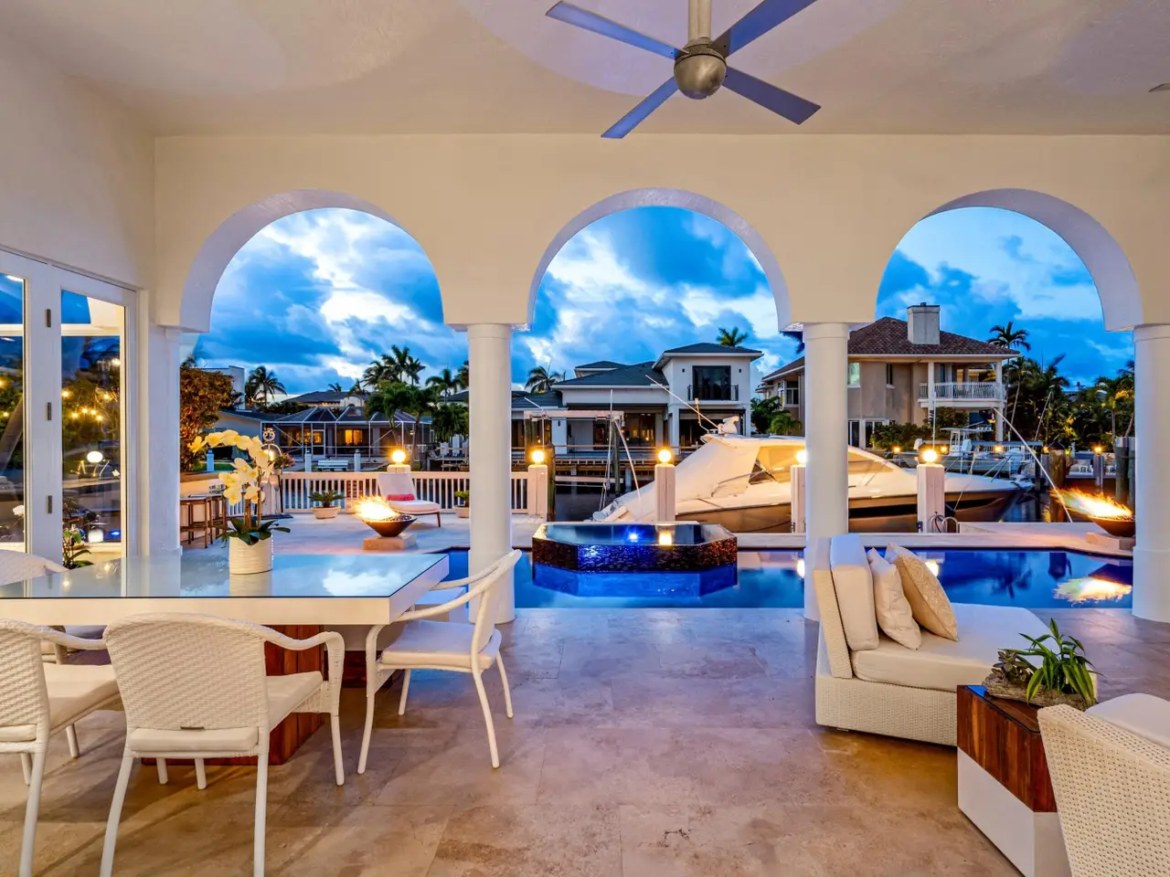 Luxe Boca Raton deepwater estate in the desirable Lake Rogers community fronts 80 feet on a deep-water canal with a dock offering easy ocean access, desirable for boaters. Interiors are peerlessly defined by grand architectural adornments, and the magnificent outdoor entertaining area centers on a sun-splashed pool with a spill-over spa bounded by an expansive patio with a wet bar and barbeque area.