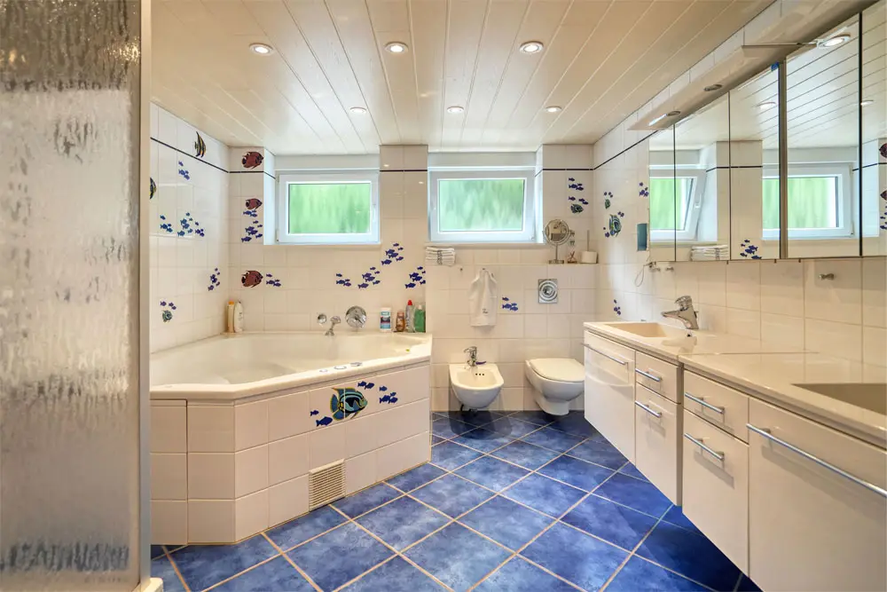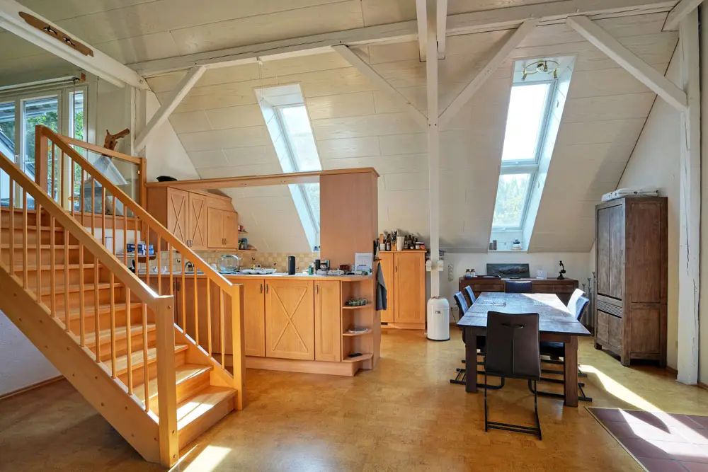 This building ensemble consists of two buildings whose origins date back to the beginning of the 19th century. The building on the left is the former barn, which was completely renovated and converted into a residential building around 2002. Great importance was attached to preserving the character of the barn. To this end, the supporting structure was largely preserved and made visible in large parts, and the roof was insulated with over-rafter insulation. The heart of the building is the room measuring over 100 m², which extends over the entire building area on two levels and comprises the living/dining and cooking area. The living area is complemented by a beautiful roof terrace that was cut into the roof. In the dining area there is a fireplace designed by an artist, which creates a lovely atmosphere. The building also includes a separate, spacious private area, which comprises a bedroom with dressing area and a large bathroom for the parents, two areas for the children, each with two rooms and a shower room, as well as a study or guest room and a utility area. The house on the right offers a living space of approx. 190 m² on two floors and is furnished in a style that is roughly equivalent to the 1970s. The roof was re-covered and insulated with high-quality clay roof tiles around 2010, and the façade was also fitted with a composite thermal insulation system. The house has a full basement. The plot of over 9,000 m² includes large lawns and various beautiful trees, as well as a tennis court, which has not been used for some time. Additional adjoining land can be purchased as an option. A car garage in the house, a further double garage and several parking spaces complete the offer. An energy certificate is not yet available.