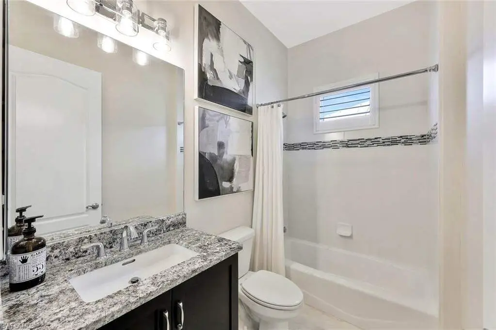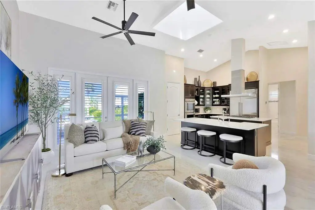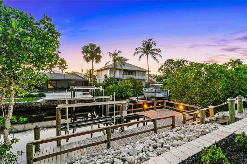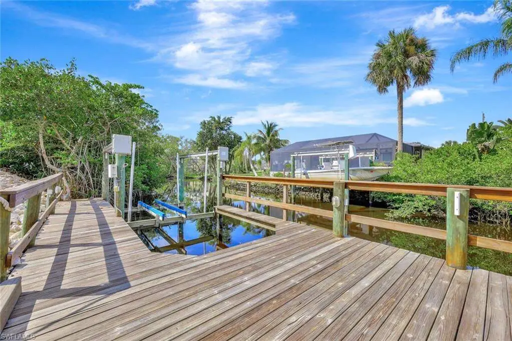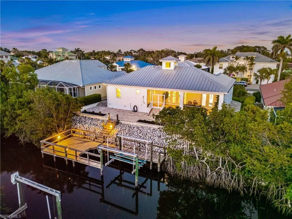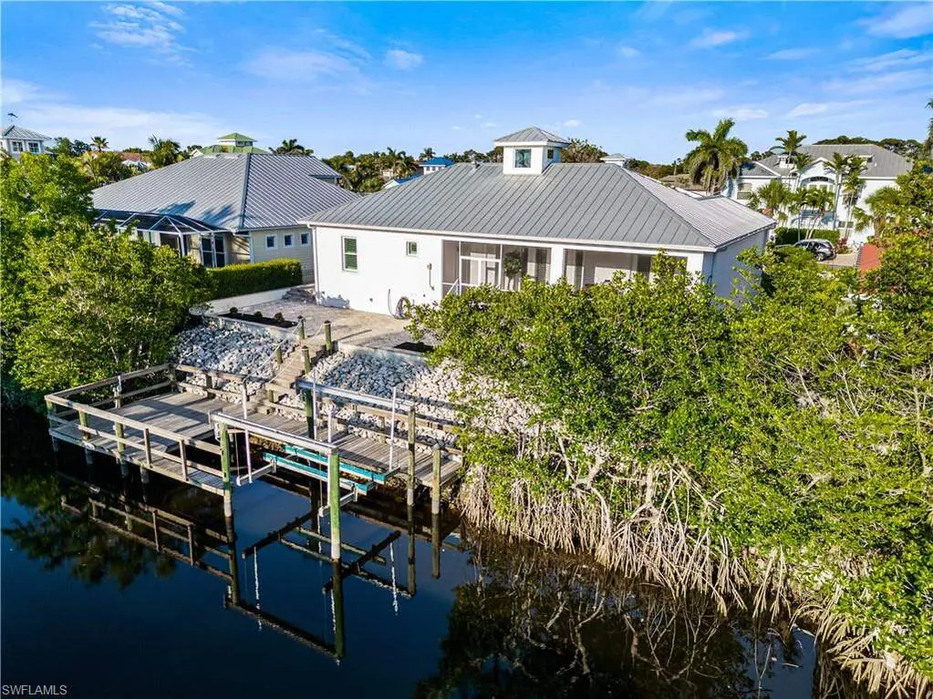 2014 BUILT GULF-ACCESS HOME-- HIGH & DRY WITH NO FLOODING IN ANY STORM, EVER! OFFERS INCREDIBLY RARE PEACE OF MIND DUE TO THE UNIQUELY HIGH ELEVATION, FLOOD ZONE X, POURED CONCRETE & METAL FRAMING CONSTRUCTION, ALL IMPACT GLASS WINDOWS, 500-GALLON BURIED PROPANE TANK, 2023 WHOLE HOUSE GENERATOR & 2014 METAL ROOF! This waterfront & coastal contemporary home is perfectly located only a 10-minute drive to the beach in a private, gated enclave of 40 "Olde Florida" style homes with very low HOA fees that include lawncare for easy maintenance! Walk right onto your boat in your backyard and be to the Gulf of Mexico in 35-45 minutes via the Imperial River (boasts an extended boat dock/ lift with new lift motors in 2023!) Plenty of room for the pool of your dreams (see attached renderings)*! Coveted Western exposure grants gorgeous natural light, breathtaking sunsets & prime sun over your future pool. This single-story home has a fantastic open floor plan with soaring 10-14 ft. ceilings & a sun-dappled cupola with transom windows. With gorgeous professional landscaping, 24" porcelain tile flooring throughout (no carpet), plantation shutters, solid core doors, stunning contemporary finishes & high-end furnishings negotiable separately, this immaculately maintained & pristine home is fully move-in-ready. The chef's kitchen offers solid maple cabinetry, granite counter tops & backsplash, a spacious pantry & Thermador Pro series stainless steel appliances including double wall ovens & a 6-burner gas cooktop. Perfect for waterfront entertainment with a 33' x 9' screened lanai plus a 23 x 15' pavered patio area beyond-pre-plumbed for an outdoor gas kitchen! Prime location near thriving downtown Bonita Springs with a brand-new food truck park, Sugarshack live music restaurant, many locally owned restaurants, festivals/events & new library. 10 minutes to SWFL's best beaches, 5 minutes to the Promenade and Coconut Point with dozens of dining options & across the street from a public golf course (Bonita Fairways).