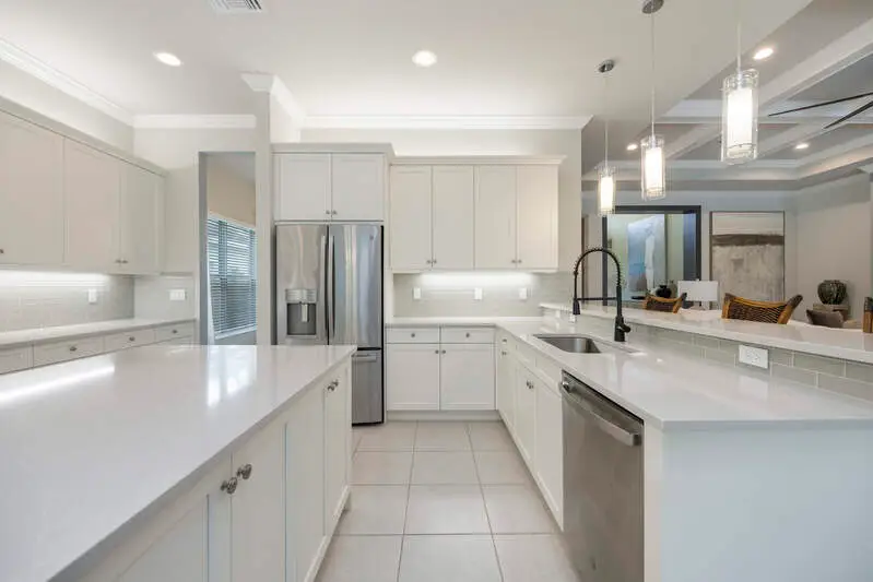 Built in 2020, this Carolina model is being offered turnkey furnished and showcases extensive upgrades throughout. Situated on a corner lot with a spacious side yard, this home is ideally located - close enough to walk to the clubhouse, yet far enough away to avoid the sound of the pickleball courts. Located in Flood Zone X, No Flood Insurance required. Features include Impact Doors and Windows, a 3-car garage with epoxy flooring, and a heated pool and spa. The outdoor kitchen is equipped with a grill, vented hood, wine cooler, and refrigerator, creating the perfect space for entertaining. Inside, the gourmet kitchen offers a gas cooktop, built-in microwave, quartz countertops, large pantry, and under/over cabinet lighting. Additional highlights include an upgraded washer and dryer, oversized laundry room with abundant storage, and custom closets throughout. Elegant finishes include a neutral color palette, crown molding, upgraded front doors, designer chandeliers, window treatments, blinds on every window, and shiplap/woodwork in the living, dining, and master bedroom. The formal dining room and separate breakfast area with coffee bar provide versatile dining options . The primary suite features a large soaking tub, separate custom glass shower, upgraded flooring, and custom closet systems. A custom living room wall unit, two smart TVs, and Bose sound bar are included. Exterior landscaping is enhanced with up-lighting under palms and trees, front and back. Valencia Bonita is a 55+ community with resort-style amenities, including a 45,000 sq. ft. clubhouse, pools, pickleball, tennis, fitness center, spa, dining, and more.