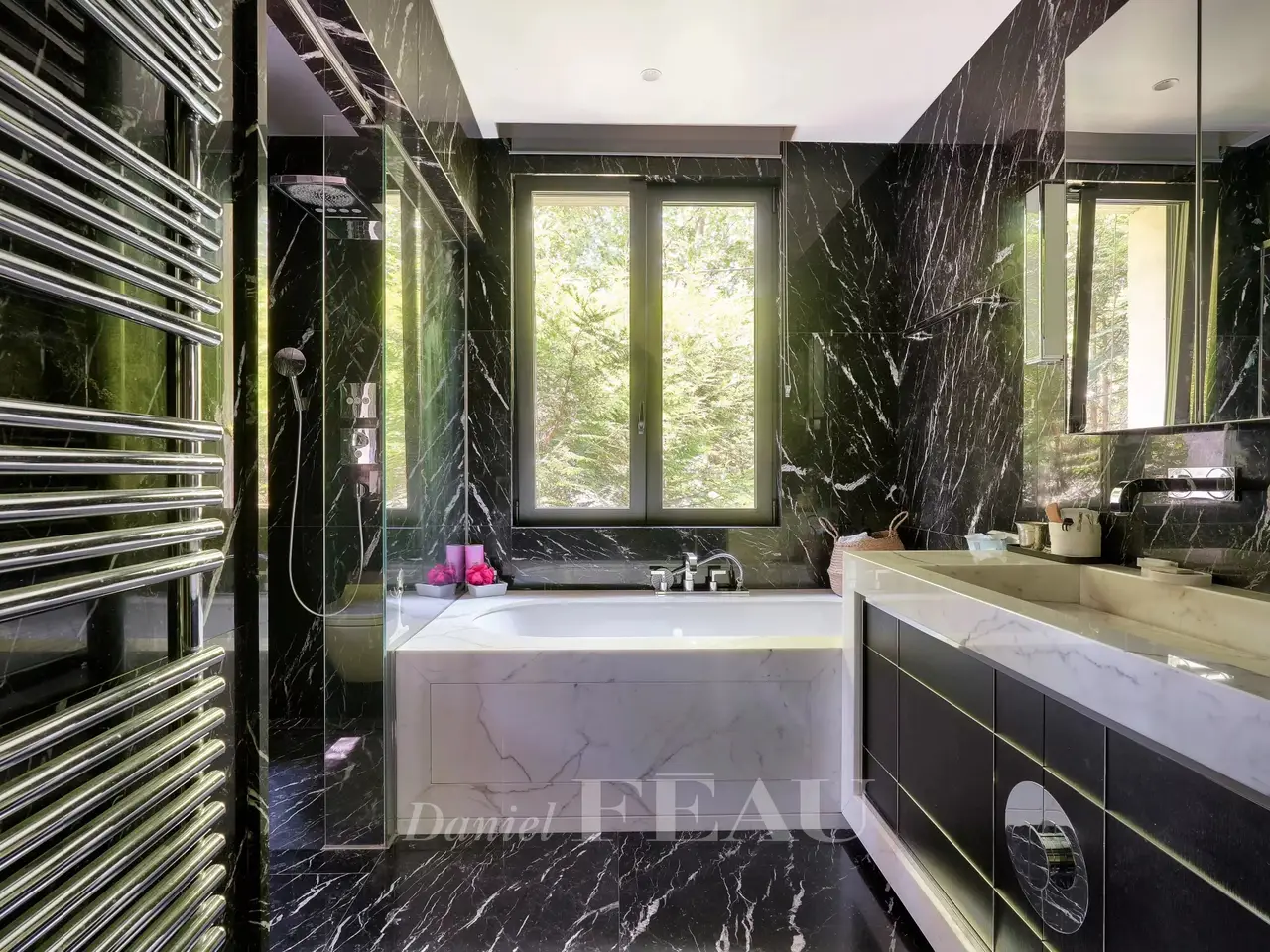 This architect-designed property set in 1700 sqm of leafy grounds with a heated swimming pool was renovated throughout in 2018. It includes an entrance hall with fitted storage space, a living/reception room bathed in sunshine, an equipped kitchen and dining room opening onto a terrace, a master suite with a bathroom and dressing room, a shower room and a utility room. The upper floor comprises three bedrooms (two opening onto balconies), a shower room and a separate wc. A spacious top floor room could create a study. With a maisonette and a studio apartment. Floor heating, alarm.