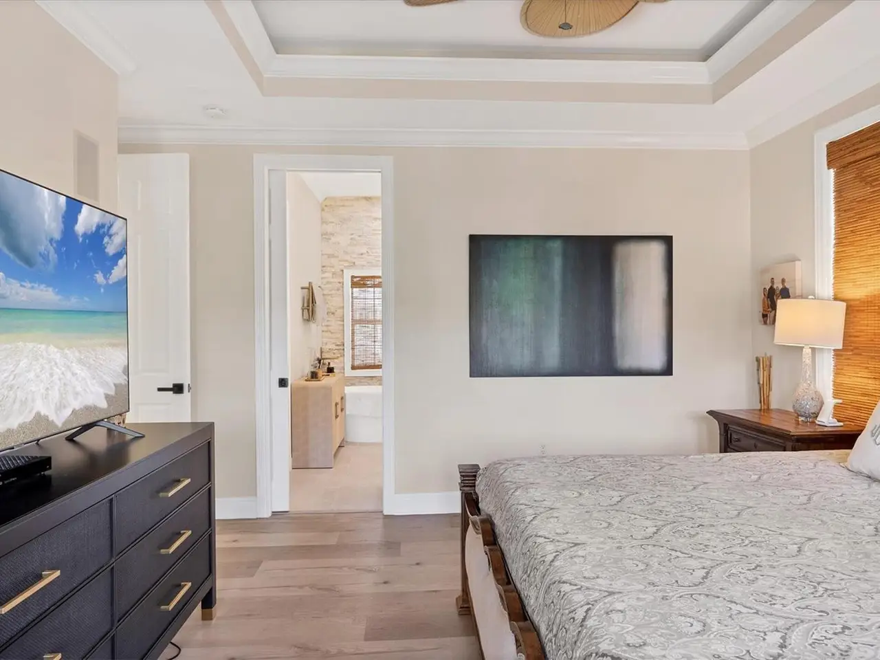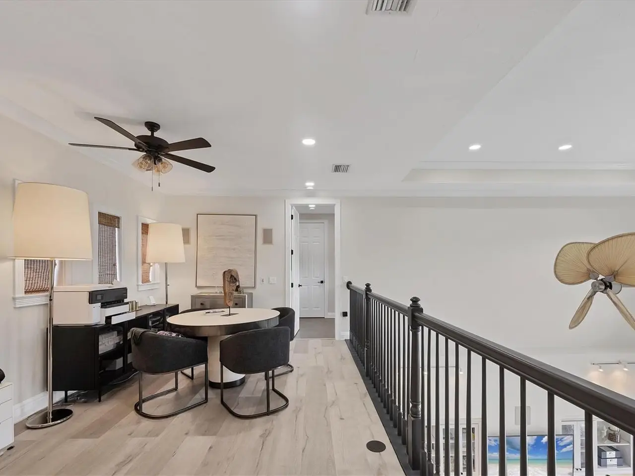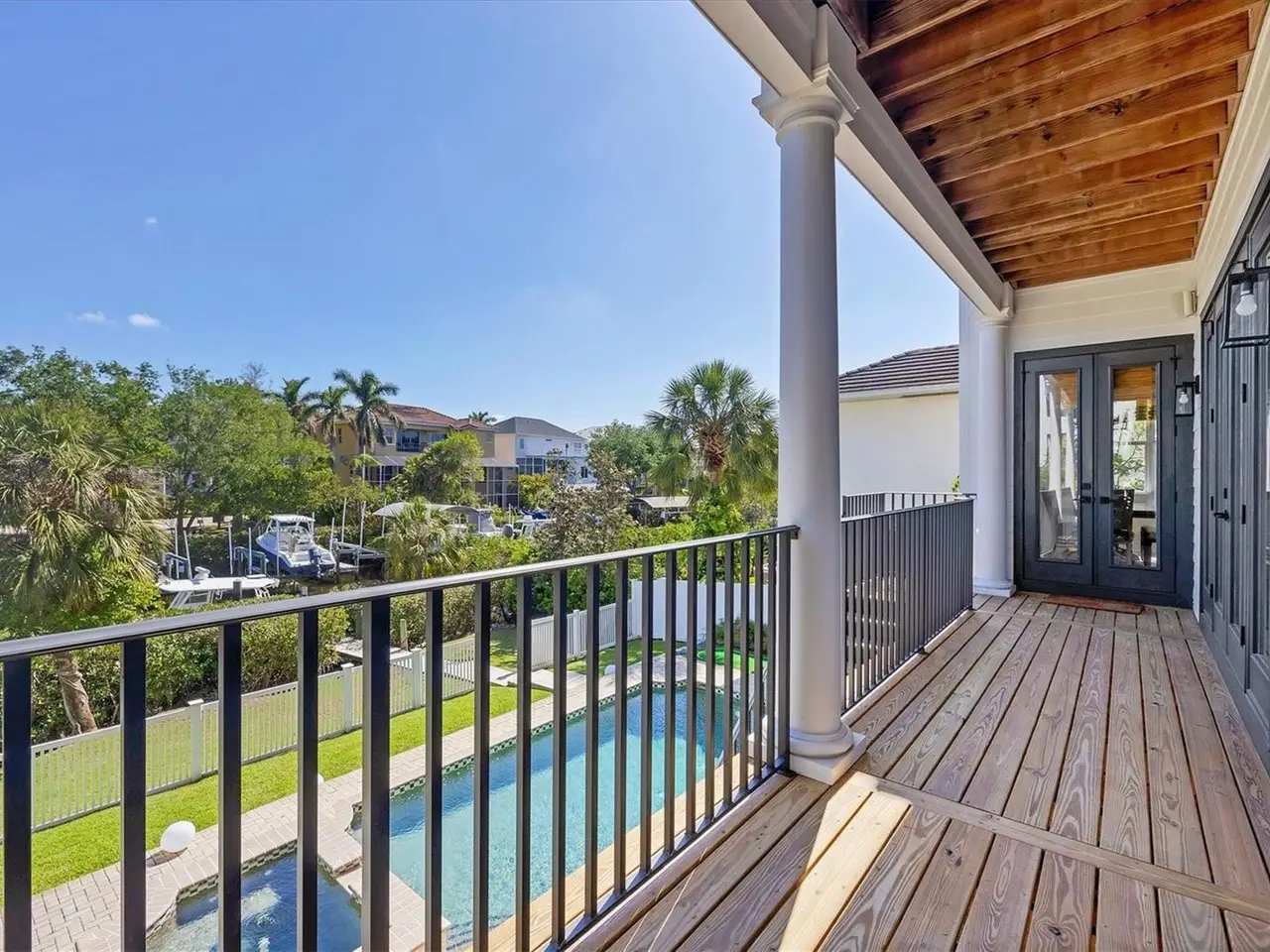 Key West-style custom-built 3-bedroom, 3.5-bath waterfront home located on deep water Crystal Canal in the gated community of Hawks Harbor. Metal roof and over $322,000 in renovations completed in 2022. Layout includes a soaring-ceiling family room, a lower-level flex space with two additional storage areas, and an upstairs loft ideal for a home office, sitting area, or game room. All bedrooms are ensuite. Kitchen features Zline and Decor appliances, Quartz countertops, stone backsplash, farmhouse sink, pantry closet, eat-in space, and a long island seating five. A whole-house water filtration system is included. The master suite includes French doors to a private balcony, step ceiling, walk-in custom closet, double sink with decorative fixtures, large walk-in shower with rain head and body sprays, garden tub, and a stone feature wall. Both secondary bedrooms feature tile flooring, walk-in closets, French doors to a balcony, and remodeled bathrooms with rain head and body spray showers. Laundry room includes Samsung washer/dryer, sink, and storage cabinetry. Outdoor amenities include a cozy front porch with composite decking, fenced backyard, spacious covered area, heated saltwater pool and spa with Pentair EasyTouch remote, putting green, Gardenia trees, grass yard with Invisible Fence. 23' new dock with water and electric plus a Jet Ski floating dock. Major systems: 2021 water heater; HVACs replaced in 2020, 2021, and 2022. Additional upgrades: luxury vinyl flooring, new interior and exterior paint, new front door, new main-level deck and stairs, new interior and exterior lighting including all new interior LEDs, new concrete sidewalk, impact glass, crown molding, paver driveway and walkway, wall/ceiling speakers, and freshly painted 26-foot-deep 2-car garage with ample storage. Conveniently located minutes from downtown Sarasota and IMG Academy, with close proximity to Sarasota Airport, restaurants, shops, St. Armands Circle, and Gulf beaches.