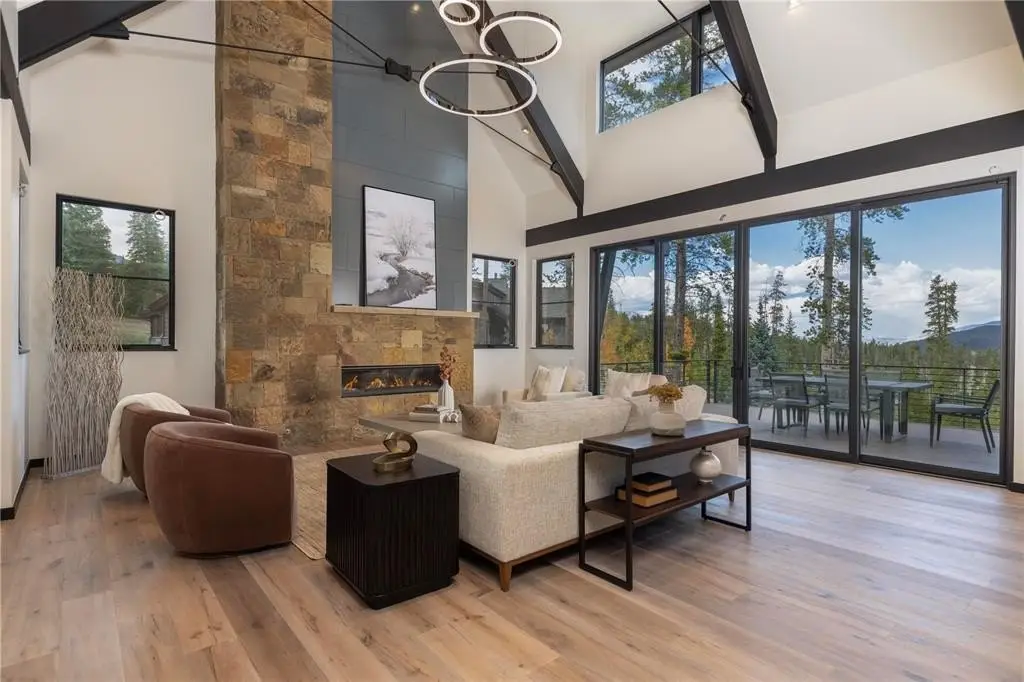 Welcome to this stunning new Allen/Guerra designed masterpiece nestled amidst the serene grandeur of the mountains and seamlessly integrated into the picturesque landscape of the prestigious, Jack Nicklaus signature Breckenridge Golf Course. This architectural treasure seamlessly blends mountain modern design with the picturesque beauty of its surroundings, offering an unparalleled living experience for those seeking a luxurious retreat. Large windows strategically placed throughout the home invite abundant natural light to flood the interior spaces, blurring the boundaries between indoors and outdoors and providing panoramic views of the protected mountain corridor. Step inside, and you are greeted by an open-concept layout that emphasizes spaciousness and fluidity. The interior design showcases custom steel beam work, stacked stone, unique sports bar, stunning glass wine room and multi-level outdoor living areas for everyone to enjoy.