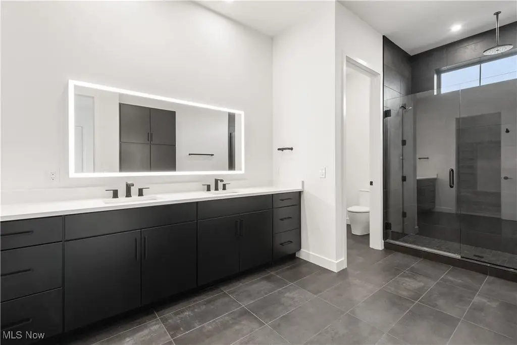 Luxury bath with tiled shower and frameless glass door