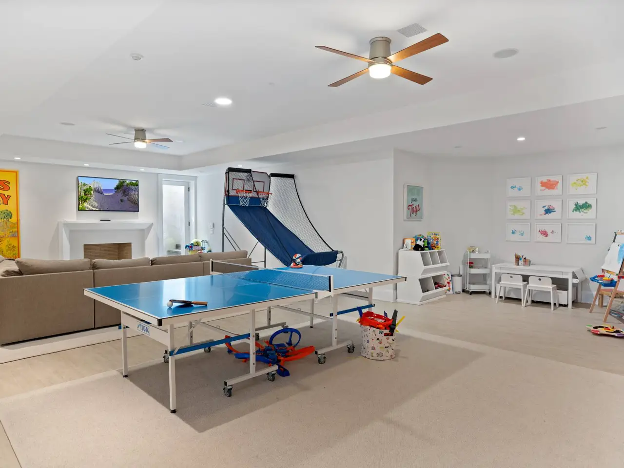 Recreation room with built-in bar and fireplace