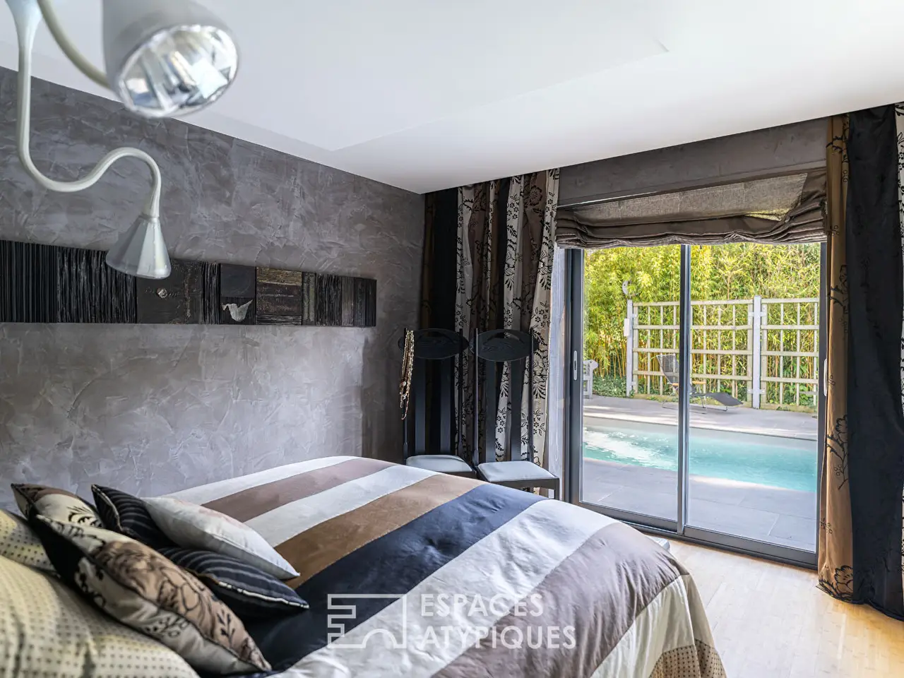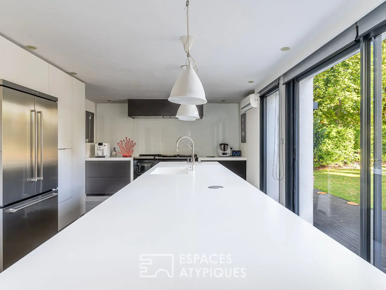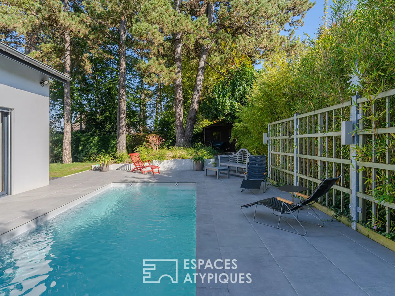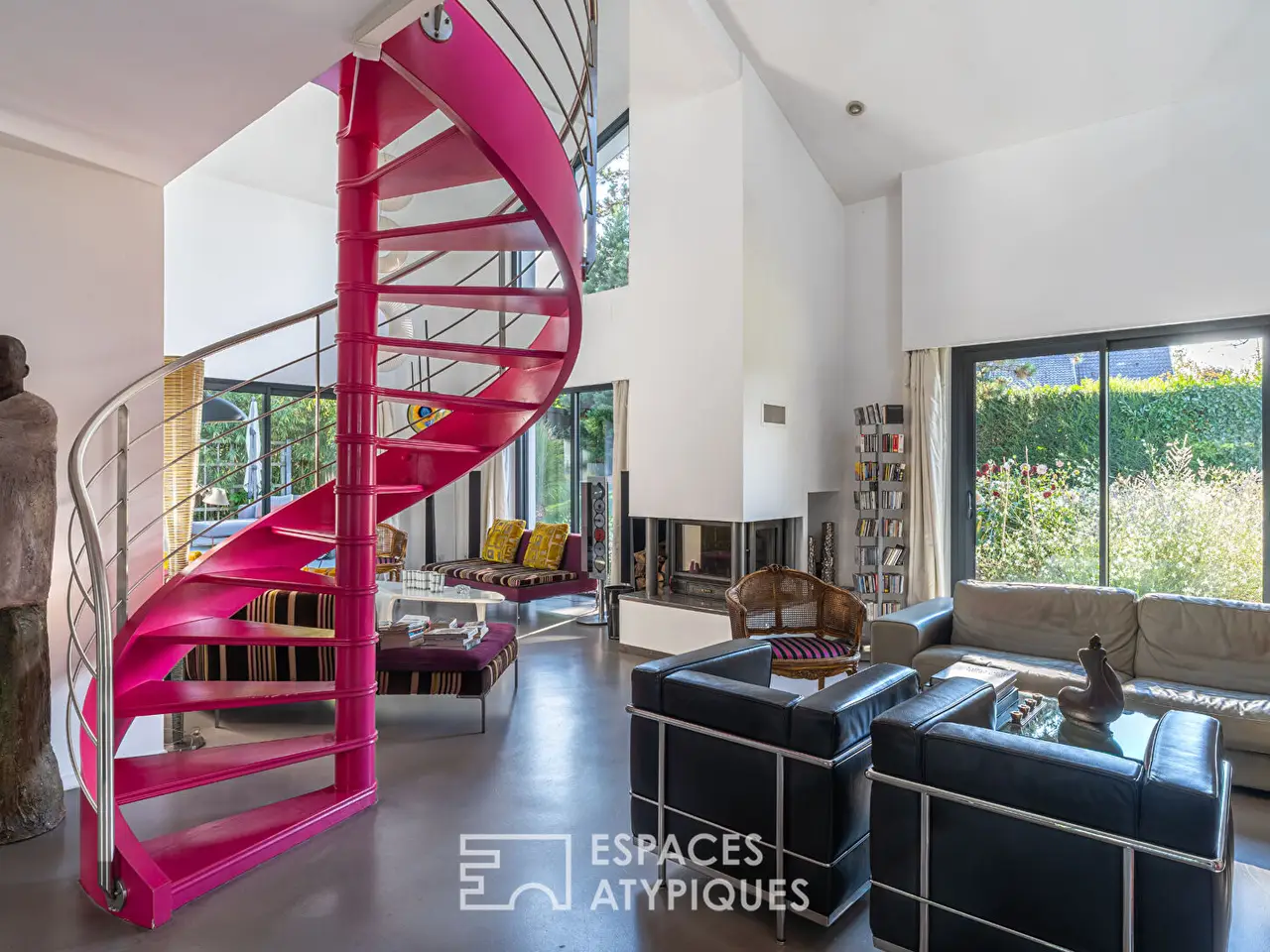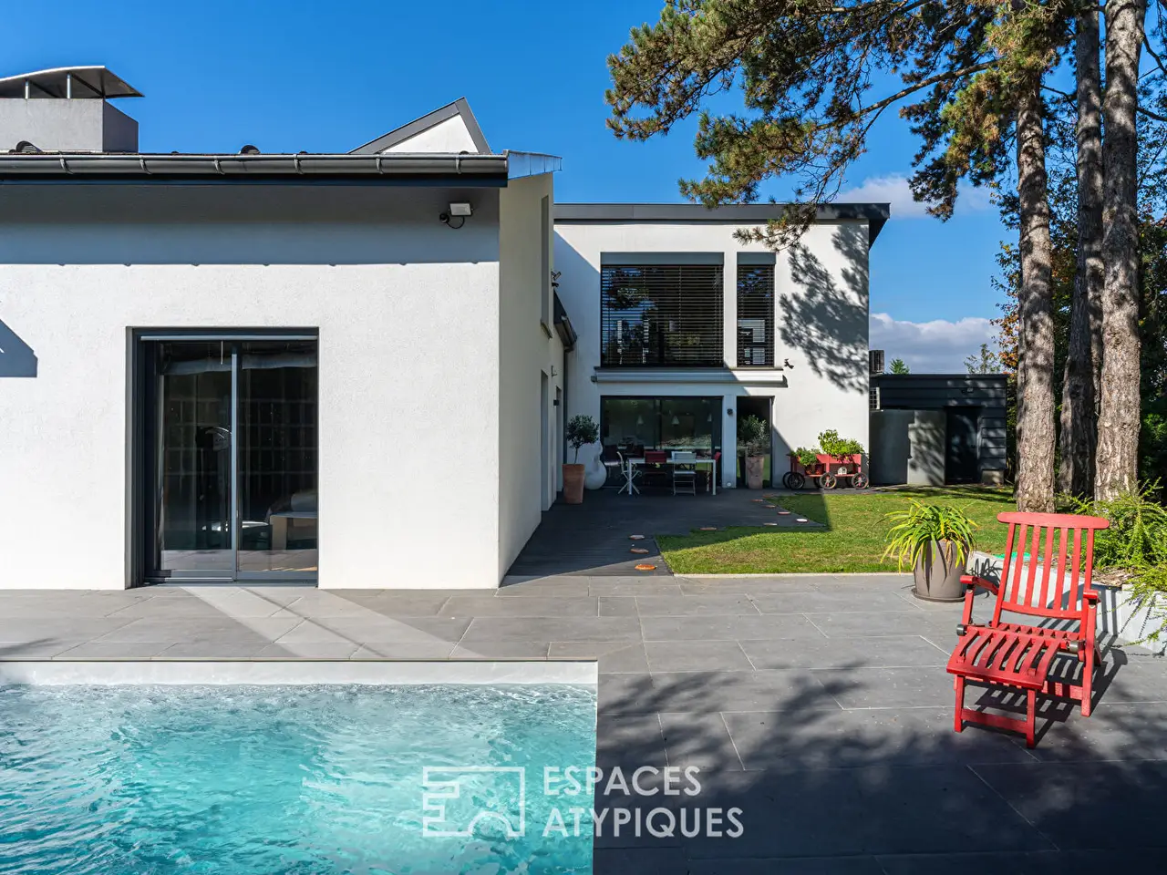 Nestled in the hills above Brunstatt, this architect-designed house offers 220 m2 of living space set in over 15 acres of landscaped grounds. Its remarkable proportions, swimming pool and peaceful location make it a property full of character, sheltered from view.The entrance opens onto a vast, light-filled living room, the true heart of the house. Its cathedral ceiling and large windows offer constant views of the greenery and a feeling of space. The living room, warmed by a triple-exposure fireplace, and the dining room are unified by a polished concrete floor that extends into the kitchen. The ground floor also features a master suite with a dressing room, bathroom, and bamboo flooring, allowing for comfortable single-level living. Upstairs, a large mezzanine serves as a reading and television area and leads to four bedrooms and a shower room. The house is completed by functional annexes with a double garage, a laundry room, a workshop, a gym, and a wine cellar.The outdoor spaces have been designed as an extension of the house. A beautiful terrace borders the 9×3 m swimming pool, set in a perfectly landscaped garden with two outbuildings. This privileged environment, promising absolute calm, benefits from quick access to all amenities. Shops, schools, and transportation are only a five-minute drive away.A successful combination of unique architecture and functionality, for a peaceful family lifestyle.Shops 5 minutes away by carSchools 5 minutes away by carBus stop 5 minutes away on footREF. 1664Additional information* 8 rooms* 5 bedrooms* 2 bathrooms* Outdoor space : 1550 SQM* Property tax : 3 172 €Energy Performance CertificatePrimary energy consumptiond : 170 kWh/m2.yearHigh performance housing*A*B*C*170kWh/m2.year36*kg CO2/m2.yearD*E*F*GExtremely poor housing performance* Of which greenhouse gas emissionsd : 36 kg CO2/m2.yearLow CO2 emissions*A*B*C*36kg CO2/m2.yearD*E*F*GVery high CO2 emissionsEstimated average annual energy costs for standard use, indexed to specific years 2021, 2022, 2023 : between 3260 € and 4470 € Subscription IncludedAgency feesThe fees include VAT and are payable by the vendorMediatorMediation Franchise-Consommateurswww.mediation-franchise.com29 Boulevard de Courcelles 75008 ParisInformation on the risks to which this property is exposed is available on the Geohazards website : www.georisques.gouv.fr