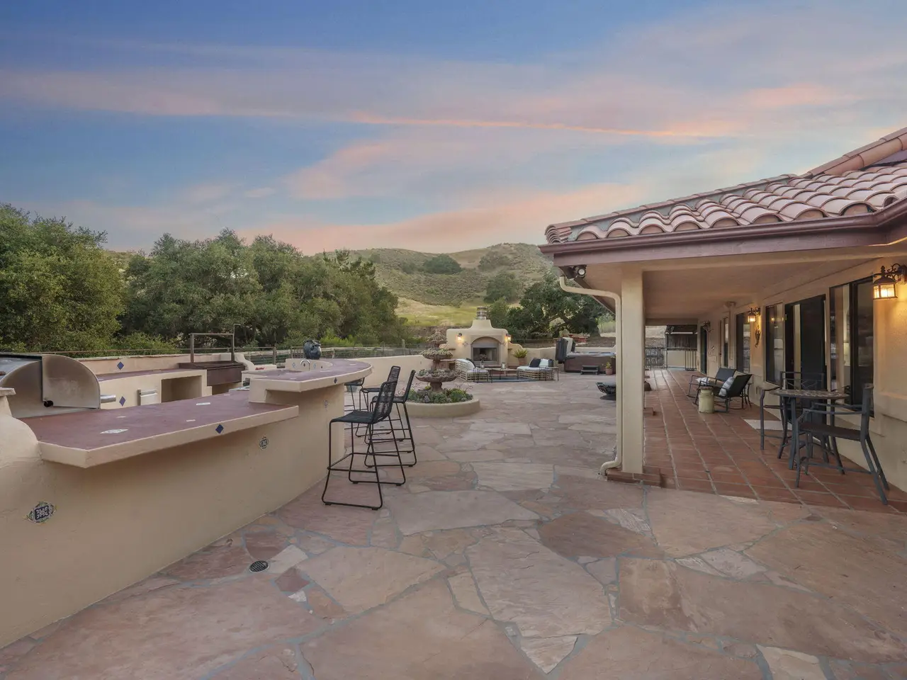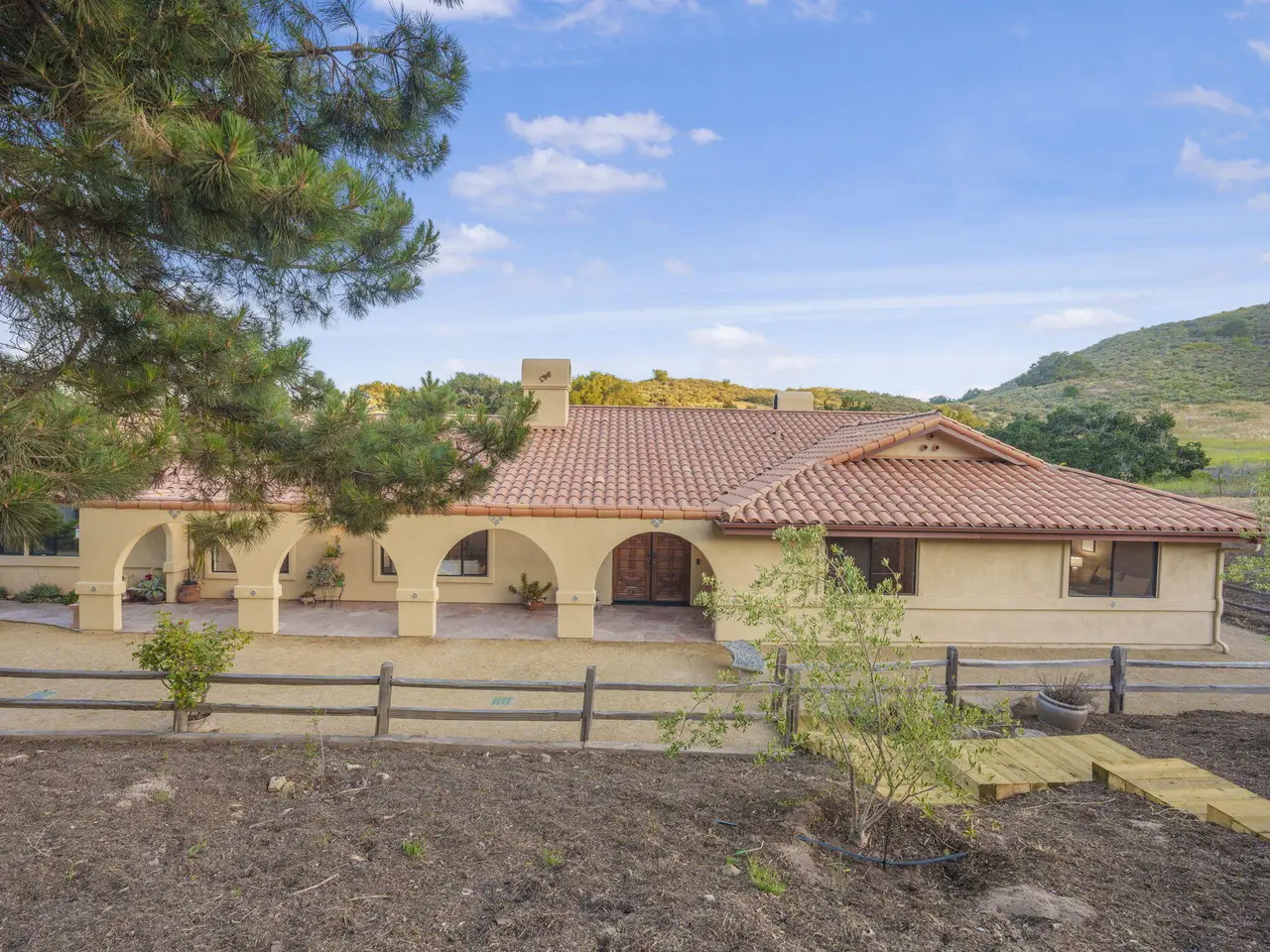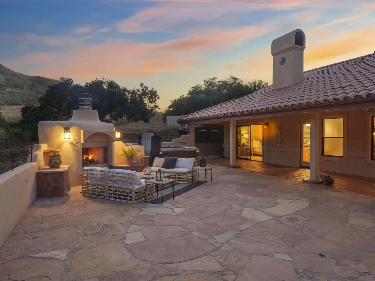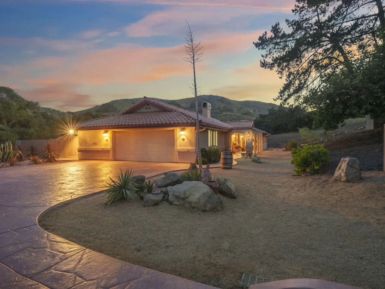 Exquisite craftsmanship and versatility define this custom Spanish ranch-style home on 5.78 tranquil acres in the gated Jonata Springs Ranch. Designed for those who love to entertain or dream of a small farm, horses, or multi-generational living, this property offers incredible indoor-outdoor flow and endless possibilities. The Arizona flagstone patio sets the stage for unforgettable gatherings, featuring a fully equipped outdoor kitchen, fireplace, and Bullfrog Jacuzzi overlooking peaceful hillsides--ideal for relaxing after a ride or a day in the garden. Inside, unique details abound: 100-year-old front doors, a one-of-a-kind signed entry light, and a stunning three-sided fireplace that warms the living area and great room. High beamed ceilings, Saltillo tile, and wood floors complement the open layout with dining area, wet bar, and spacious office. The home is wired for seamless work-from-home capability with Cat5e cabling and Ubiquiti Access Points. The chef's kitchen features knotty alder cabinetry, a stainless farmhouse sink, bar seating, and premium appliances all opening to the family room and patio. The primary suite offers a custom fireplace, spa-like bath, and direct access to the hot tub and outdoor shower, while two guest bedrooms provide comfortable accommodations for family or visitors. Even your fur babies are pampered with a dedicated climate-controlled dog room featuring automatic watering and direct yard access. A fully permitted 900+- sq ft workshop adds flexible options for hobbies, a studio, or future guest space. Residents of Jonata Springs Ranch enjoy 10+ miles of meticulously groomed, deeded equestrian trails and one of the valley's most reliable private water associations. Whether your dream is entertaining under the stars, keeping animals, or building a family retreat, this exceptional property offers the space, beauty, and freedom to make it yours. For additional Jonata Springs Ranch information visit jonatasprings.org