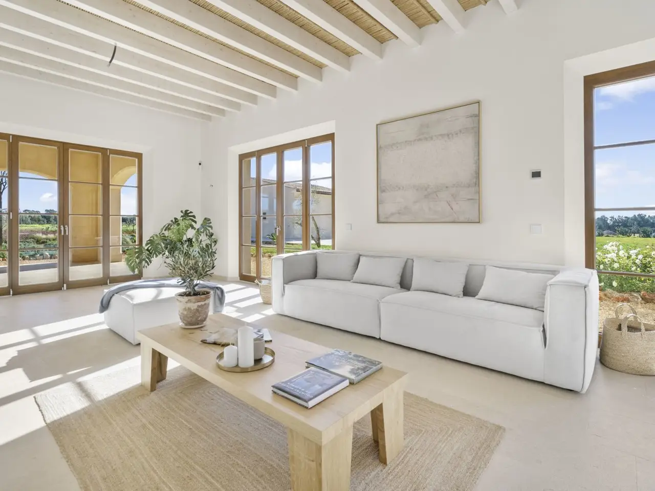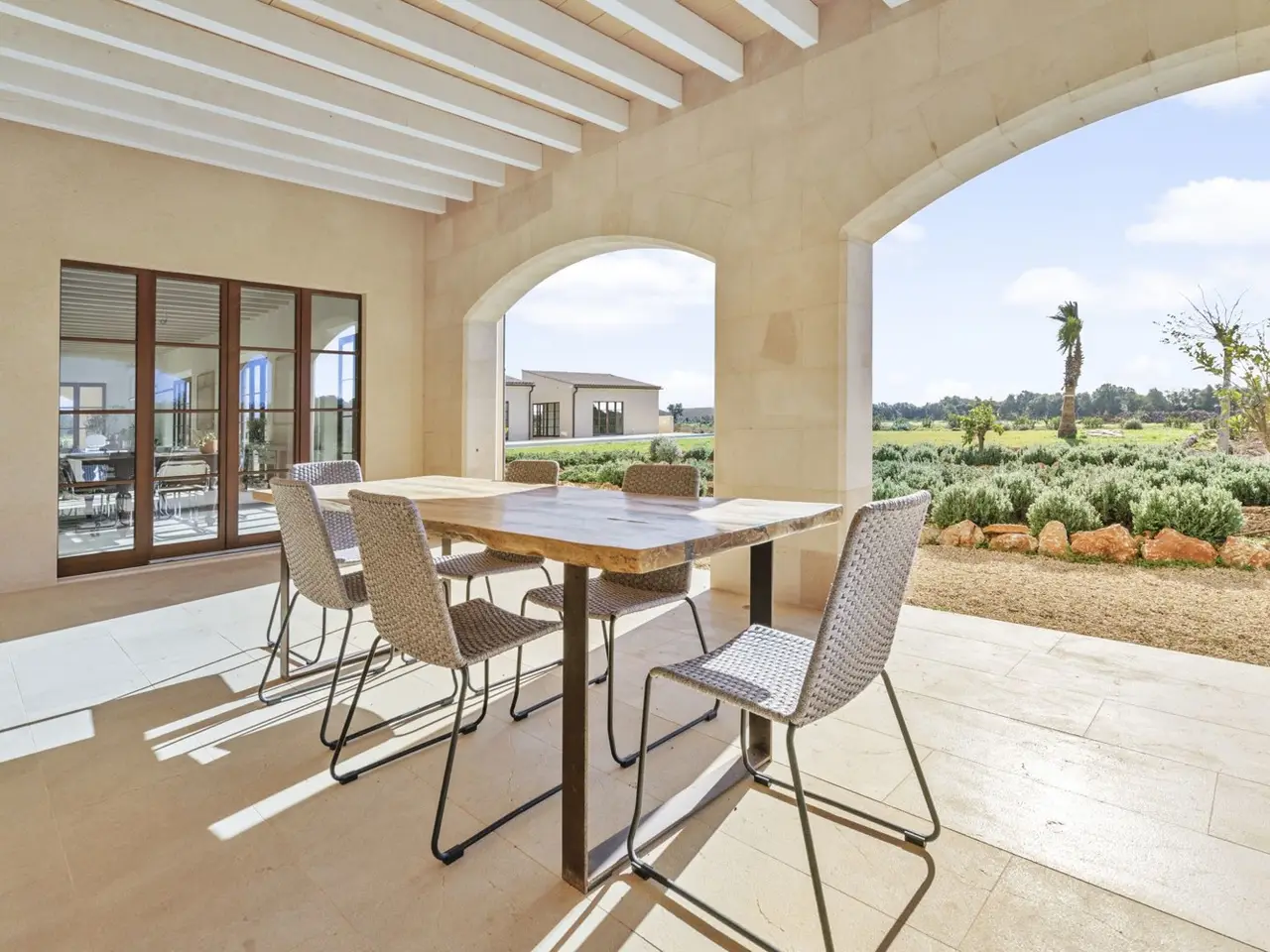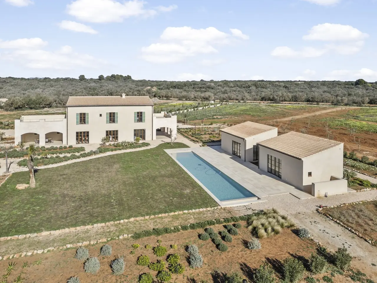 This modern new-build finca, completed in 2024, is situated on a plot of approx. 4.6 hectares between the natural beach of Es Trenc and the charming village of Campos. The property offers a total living area of around 485 m², divided into a main house and a separate guest house. With a special focus on the selection of first-class materials such as natural stone floors and wooden elements, combined with state-of-the-art technology, this finca presents itself as a first-class first-time-occupancy property. The main house has a spacious living and dining area with fireplace, a modern kitchen equipped with high-quality electrical appliances, a bedroom with en-suite bathroom and a study. On the upper floor there are three further bedrooms, each with its own en-suite bathroom. The offer is completed by a separate guest house, with its own entrance and a living and dining room with integrated kitchen, a bedroom with bathroom en-suite and its own terrace. The Mediterranean garden, which extends around the buildings, surrounds an impressive 20 × 4 meter pool with adjoining pool house, Finnish sauna and fitness area. There is also a further bedroom for guests. Further features include modern home automation, underfloor heating, air conditioning and various high-quality floor coverings. Around 2,000 m² of Merlot vines surround the buildings and enable a yield of around 1,200 bottles of red wine per year. The finca also focuses on sustainability and independence. A photovoltaic system provides environmentally friendly energy, while two 15,000 liter water tanks ensure the water supply. A 3-chamber sewage treatment plant and the use of rainwater for automatic garden irrigation are further aspects that increase the ecological value of the property. Located just a few minutes from the vibrant center of Campos and about a ten-minute drive from the famous Es Trenc beach, the property offers both seclusion and proximity to urban amenities.