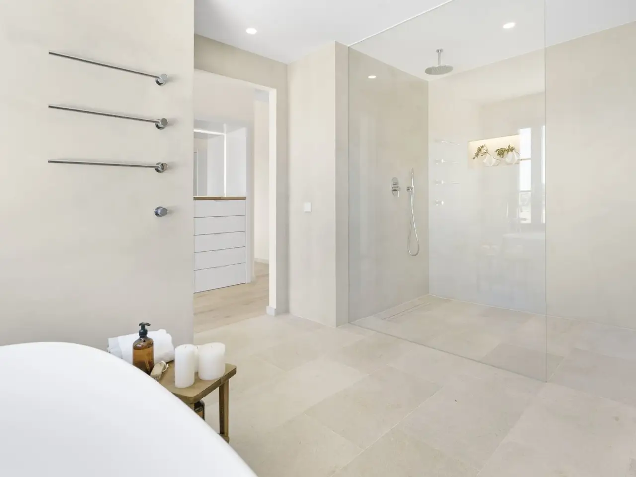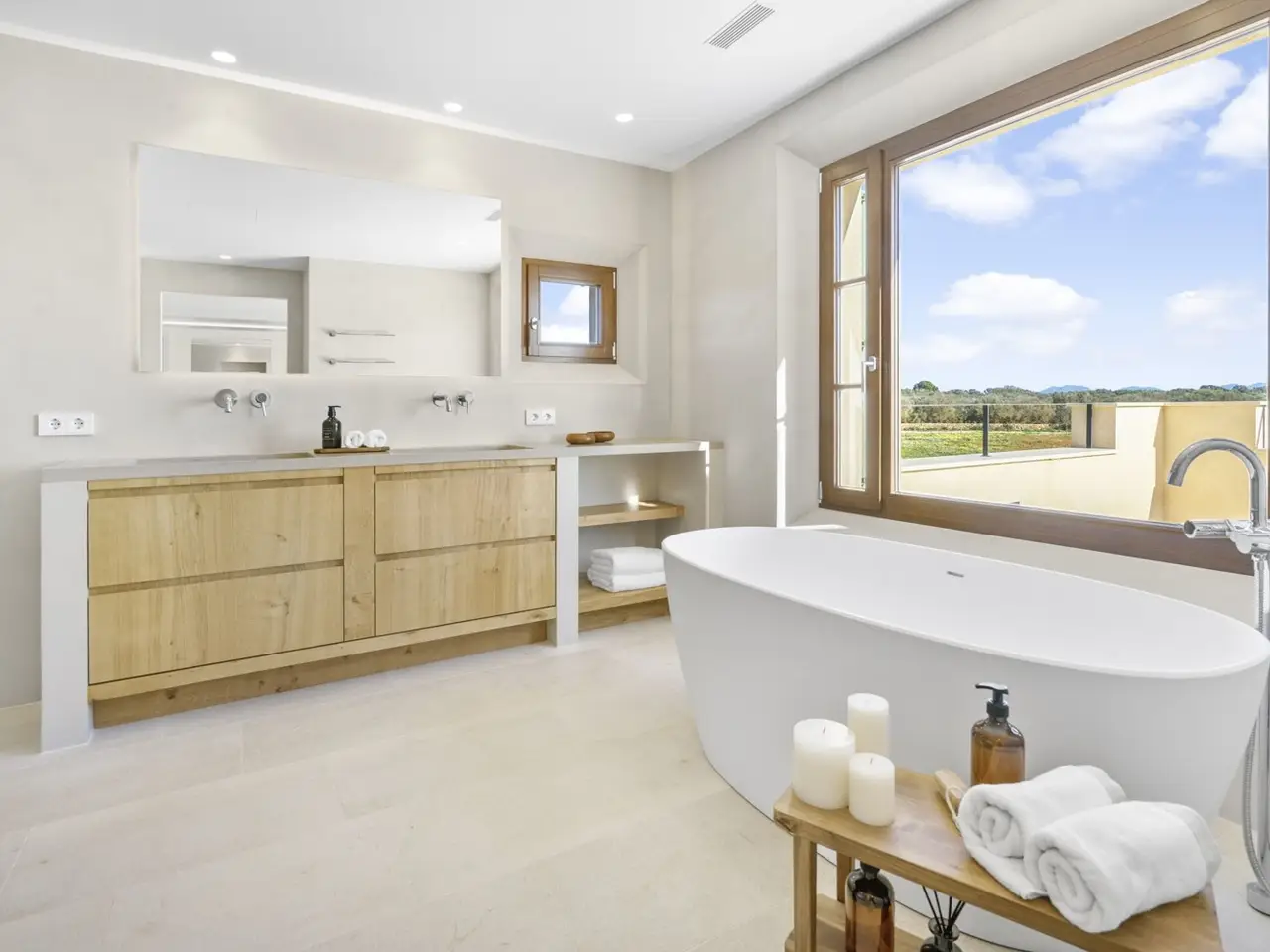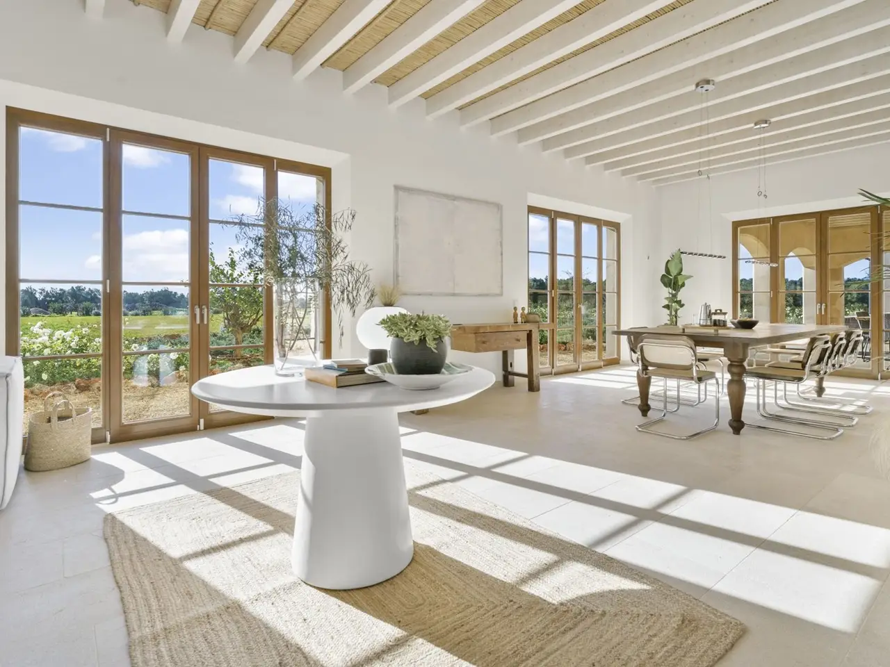 This modern new-build finca, completed in 2024, is situated on a plot of approx. 4.6 hectares between the natural beach of Es Trenc and the charming village of Campos. The property offers a total living area of around 485 m², divided into a main house and a separate guest house. With a special focus on the selection of first-class materials such as natural stone floors and wooden elements, combined with state-of-the-art technology, this finca presents itself as a first-class first-time-occupancy property. The main house has a spacious living and dining area with fireplace, a modern kitchen equipped with high-quality electrical appliances, a bedroom with en-suite bathroom and a study. On the upper floor there are three further bedrooms, each with its own en-suite bathroom. The offer is completed by a separate guest house, with its own entrance and a living and dining room with integrated kitchen, a bedroom with bathroom en-suite and its own terrace. The Mediterranean garden, which extends around the buildings, surrounds an impressive 20 × 4 meter pool with adjoining pool house, Finnish sauna and fitness area. There is also a further bedroom for guests. Further features include modern home automation, underfloor heating, air conditioning and various high-quality floor coverings. Around 2,000 m² of Merlot vines surround the buildings and enable a yield of around 1,200 bottles of red wine per year. The finca also focuses on sustainability and independence. A photovoltaic system provides environmentally friendly energy, while two 15,000 liter water tanks ensure the water supply. A 3-chamber sewage treatment plant and the use of rainwater for automatic garden irrigation are further aspects that increase the ecological value of the property. Located just a few minutes from the vibrant center of Campos and about a ten-minute drive from the famous Es Trenc beach, the property offers both seclusion and proximity to urban amenities.