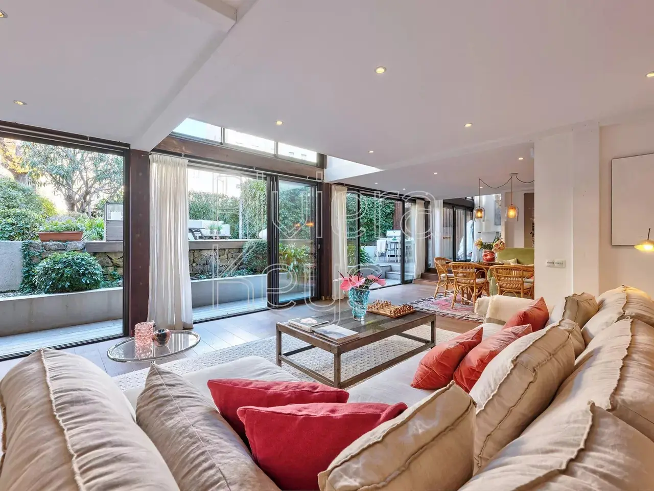 In the heart of Cannes, this unique two-storey villa, in perfect condition and with exceptional modern finishes, is located in the center of La Banane area with its shops and restaurants, while enjoying absolute calm. Set in a condominium, the detached house enjoys a 180 m² garden planted with trees, a rarity in the center of town, with a large terrace for relaxing or entertaining. Built over 2 levels of around 175 m², the property comprises on the garden level: a vast reception room with living-dining room, a fitted kitchen, a large bedroom with shower room and wc, and a guest toilet. Upstairs there are three further bedrooms, each with en suite shower room and view over the garden, and a small room that could be used as an office or extra bedroom. Prime location, within walking distance of the Croisette beaches, the Palais des Festivals and the train station. You're sure to fall in love with this prestigious property, combining elegance, comfort and serenity.