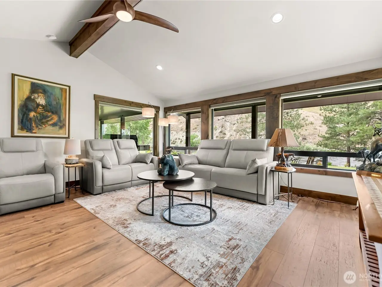 Riverfront Estate on 10.50 Acres: Delight in over 1,200 feet of waterfront featuring impressive river vistas from inside the home. The main residence and guest cabin have been elegantly updated with premium finishes; it includes 3 BD, 2 BA, and a gourmet kitchen showcasing a beautiful Italian gas range. Both the residence and guest cabin are fully furnished, making it move-in ready. The appealing guest cabin offers 2 BD, 1 BA, along with a spacious sunroom that can function as a bunk room, studio, or recreational space. Enjoy outdoor living year-round with multiple patios and decks, plus a sizable heated and insulated workshop/garage. The second parcel has a well & septic system installed. Turn it into your dream home or serene retreat!