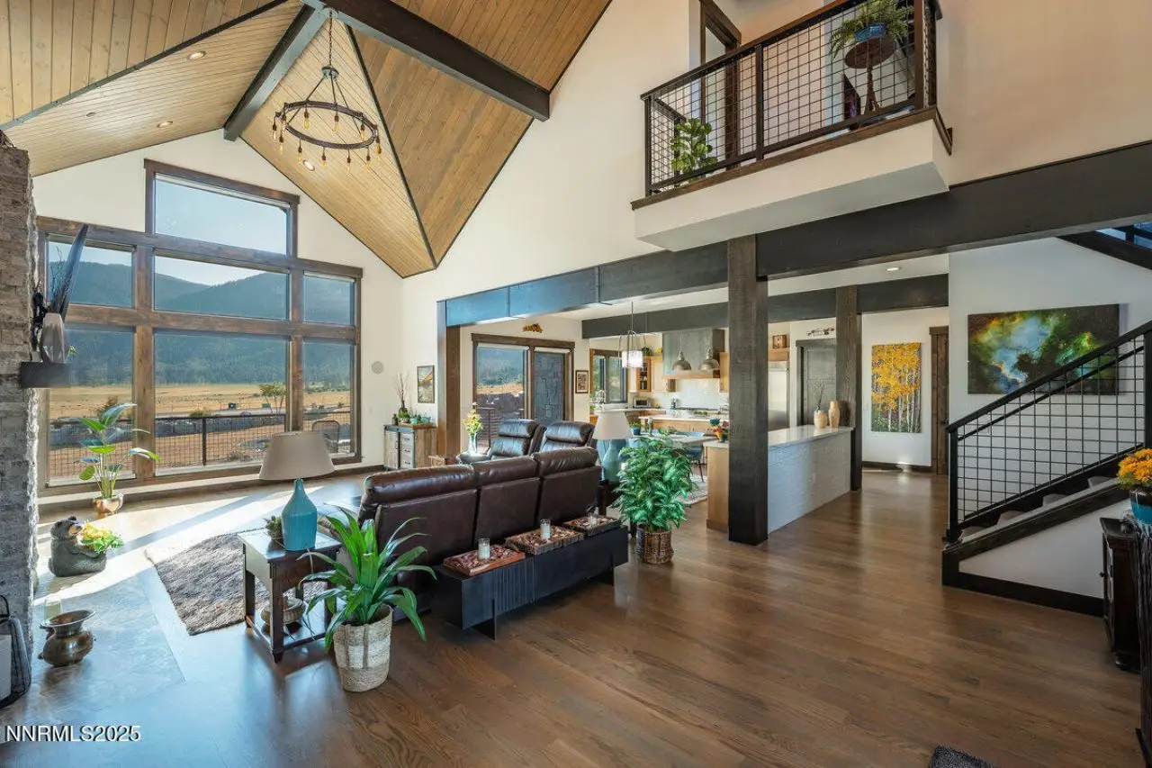Secured behind the private gates of Coyote Ranch Estates, this newly built custom home sits on 2 acres with breathtaking views of Jacks Valley Ranch and the Sierra Nevada Mountains. This architectural masterpiece boasts a seamless blend of modern elegance and traditional design elements. Upon entry, you are greeted by a grand great room featuring solid hardwood floors, soaring vaulted ceilings, and expansive windows that frame panoramic views. A stunning hardwood ceiling and metal trim accentuate the room's grandeur, while a state-of-the-art built-in surround sound system, electric shade system, and easy access to the expansive fortress deck and paver patio enhance the home's entertainment capabilities. The chef's kitchen is a true focal point, outfitted with top-of-the-line commercial-grade KitchenAid dual-fuel range, cooktop, 48-inch refrigerator, and built-in microwave. The solid Adler wood cabinetry complements the striking quartzite countertops, and the Kohler undermount sink adds both style and function. The main-level master suite offers a serene retreat with mesmerizing views, a luxurious custom bathroom with a large standalone steam-shower system, a freestanding bathtub, heated floors, and power mirrors. Upstairs features an additional ensuite bedroom and family room with half bath, Brazilian Tiger Wood flooring, a full bar with built-in refrigerator, and another stunning hardwood ceiling complete the upper level. This home also features an oversized three-car garage with electric vehicle charging capabilities, as well as beautifully landscaped grounds with ornamental trees, shrubs, and grasses. Granite rock boulder walls and an elegant water feature further enhance the property's appeal. Coyote Ranch Estates is a boutique community of just 16, two acre homesites, offering privacy, security, and convenience-minutes from the historic town of Genoa, Genoa Lakes and Ranch golf courses, Minden-Tahoe Private Airport, the areas super stores and a short drive to Lake Tahoe. This is more than a home-it's a lifestyle.