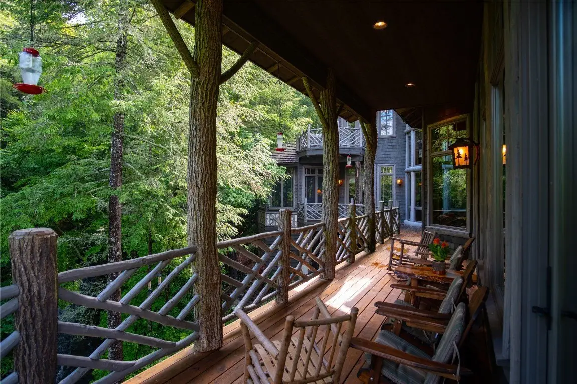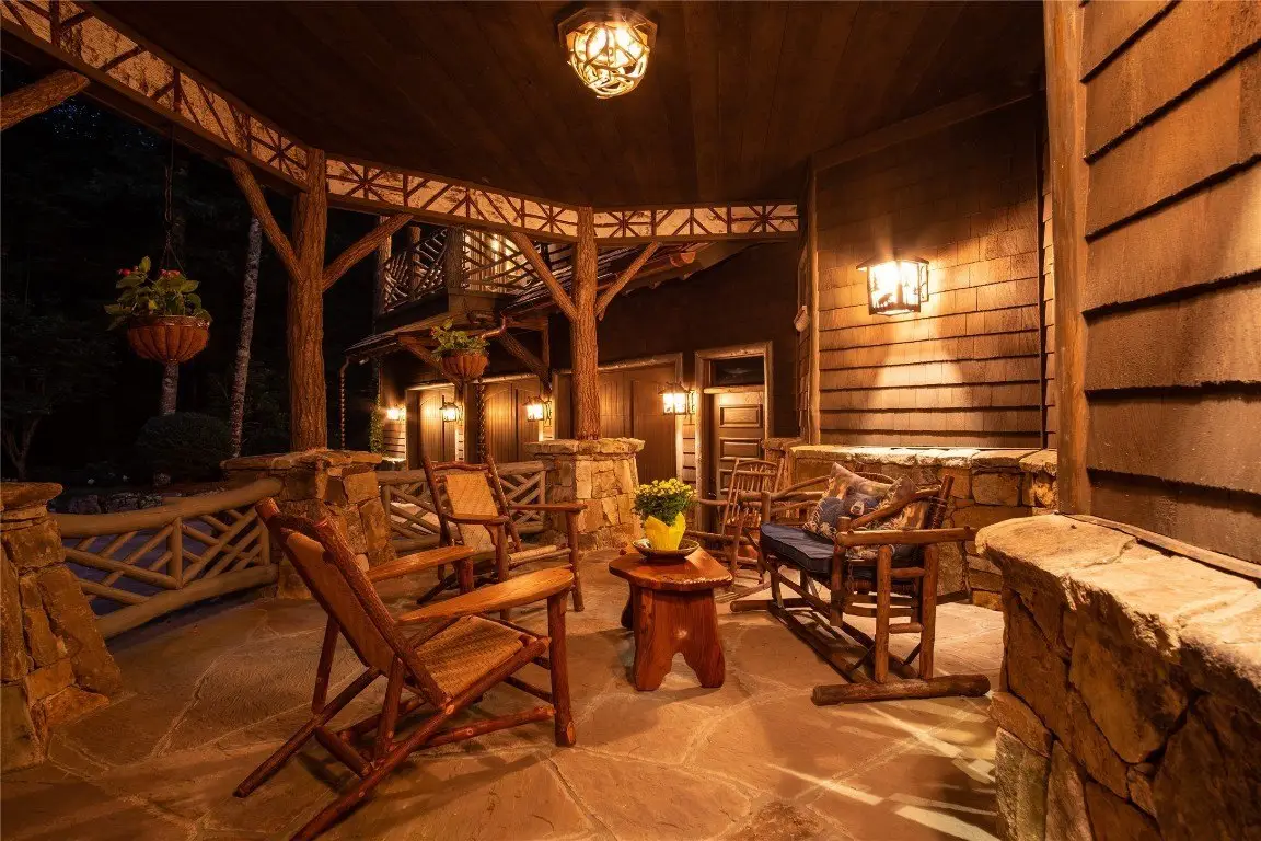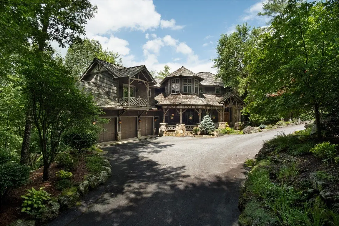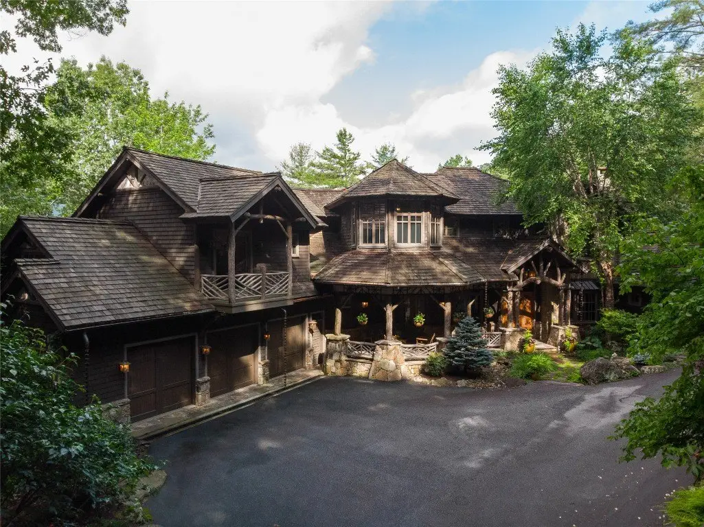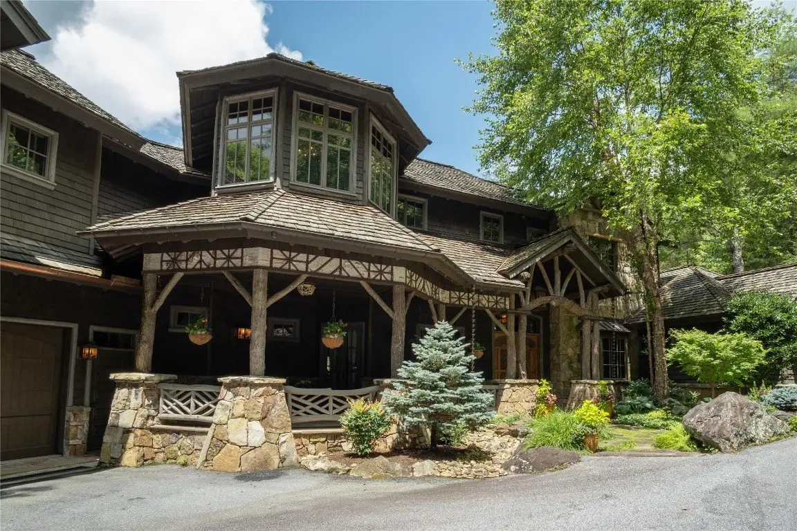 Just minutes from the shopping and fine dining of downtown Cashiers, Blue Bear Camp is the ultimate Adirondack-style mountain lodge. This prime property borders the Nantahala National Forest, ensuring privacy and abundant wildlife. Another world awaits in the dream-like setting amid the wild Chattooga River, flowering landscaping, a sparkling waterfall, and lush forest, all against the stunning backdrop of Whiteside Mountain and Devil's Courthouse. Reminiscent of the great camps in the early 1900s, the rustic decor is warm and welcoming with natural wood details such as pine logs with golden chinking, wax-rubbed reclaimed heart pine floors, and a grandiose circular log staircase surrounding a seven-foot antler chandelier. The staircase is a masterpiece of engineering, constructed from Colorado Ponderosa pine over three months. Much of the custom furniture and details were built by local craftsmen on site. Other unique finishes were created by artisans from across the country, using natural materials such as mica, aged copper, shed elk antlers from Wyoming, Canadian birch bark, wormy chestnut, and turquoise. The stunning stonework and multiple fireplaces throughout the home were built from Tennessee fieldstones, many of which reveal 300,000-year-old fossils. In addition to the private guest quarters with a kitchenette and laundry room, the sprawling three-story home with an elevator offers an abundance of space for family and guests to explore, including a sunroom, library, an artist studio, game room, wine cellar, a resplendent home theater, and a fitness room with a sauna and steam room. Nature lovers will revel in the magical surroundings and fresh mountain air on the covered porch amid sights and sounds of the rushing waterfall. There's something for everyone to enjoy in an area offering residents access to the countless natural resources and opportunities for outdoor recreation such as hiking, fly fishing, biking, skiing, and golf.