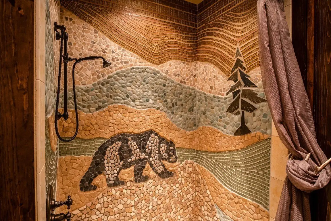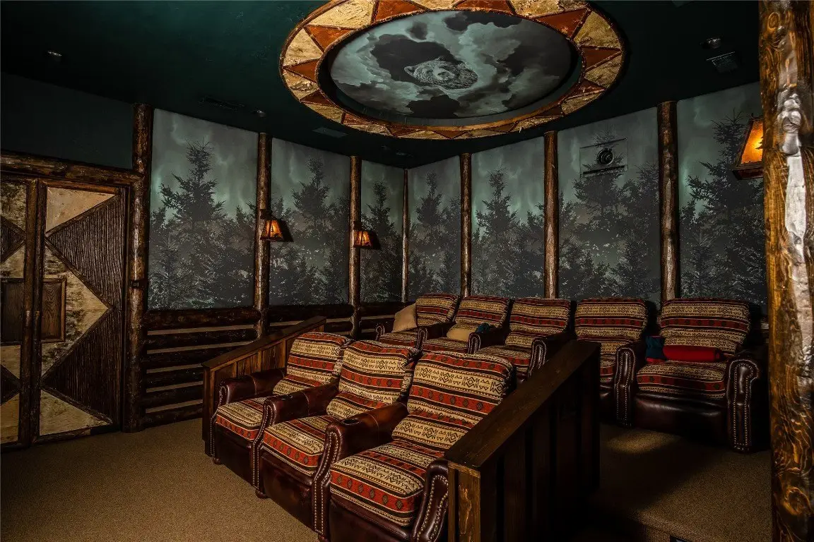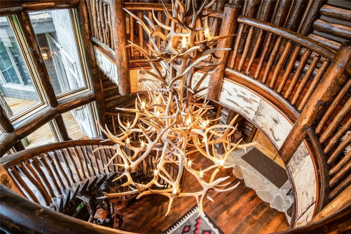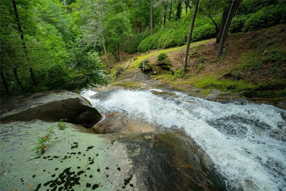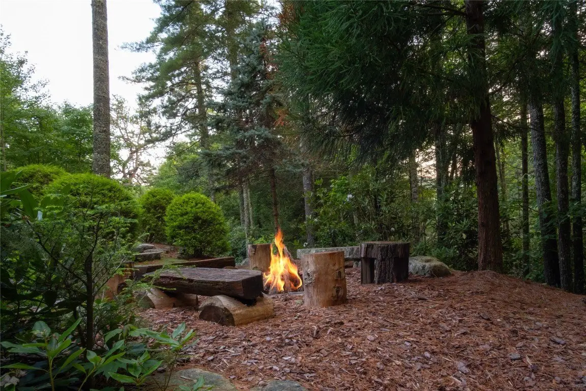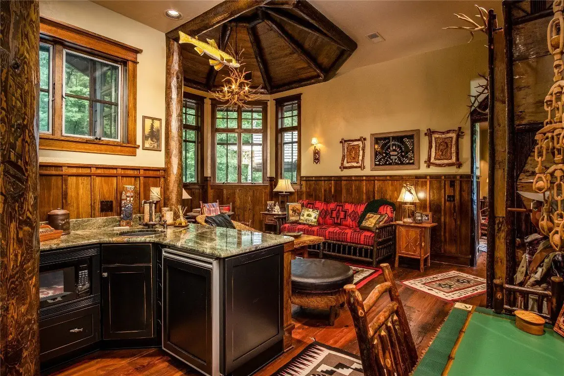 Just minutes from the shopping and fine dining of downtown Cashiers, Blue Bear Camp is the ultimate Adirondack-style mountain lodge. This prime property borders the Nantahala National Forest, ensuring privacy and abundant wildlife. Another world awaits in the dream-like setting amid the wild Chattooga River, flowering landscaping, a sparkling waterfall, and lush forest, all against the stunning backdrop of Whiteside Mountain and Devil's Courthouse. Reminiscent of the great camps in the early 1900s, the rustic decor is warm and welcoming with natural wood details such as pine logs with golden chinking, wax-rubbed reclaimed heart pine floors, and a grandiose circular log staircase surrounding a seven-foot antler chandelier. The staircase is a masterpiece of engineering, constructed from Colorado Ponderosa pine over three months. Much of the custom furniture and details were built by local craftsmen on site. Other unique finishes were created by artisans from across the country, using natural materials such as mica, aged copper, shed elk antlers from Wyoming, Canadian birch bark, wormy chestnut, and turquoise. The stunning stonework and multiple fireplaces throughout the home were built from Tennessee fieldstones, many of which reveal 300,000-year-old fossils. In addition to the private guest quarters with a kitchenette and laundry room, the sprawling three-story home with an elevator offers an abundance of space for family and guests to explore, including a sunroom, library, an artist studio, game room, wine cellar, a resplendent home theater, and a fitness room with a sauna and steam room. Nature lovers will revel in the magical surroundings and fresh mountain air on the covered porch amid sights and sounds of the rushing waterfall. There's something for everyone to enjoy in an area offering residents access to the countless natural resources and opportunities for outdoor recreation such as hiking, fly fishing, biking, skiing, and golf.