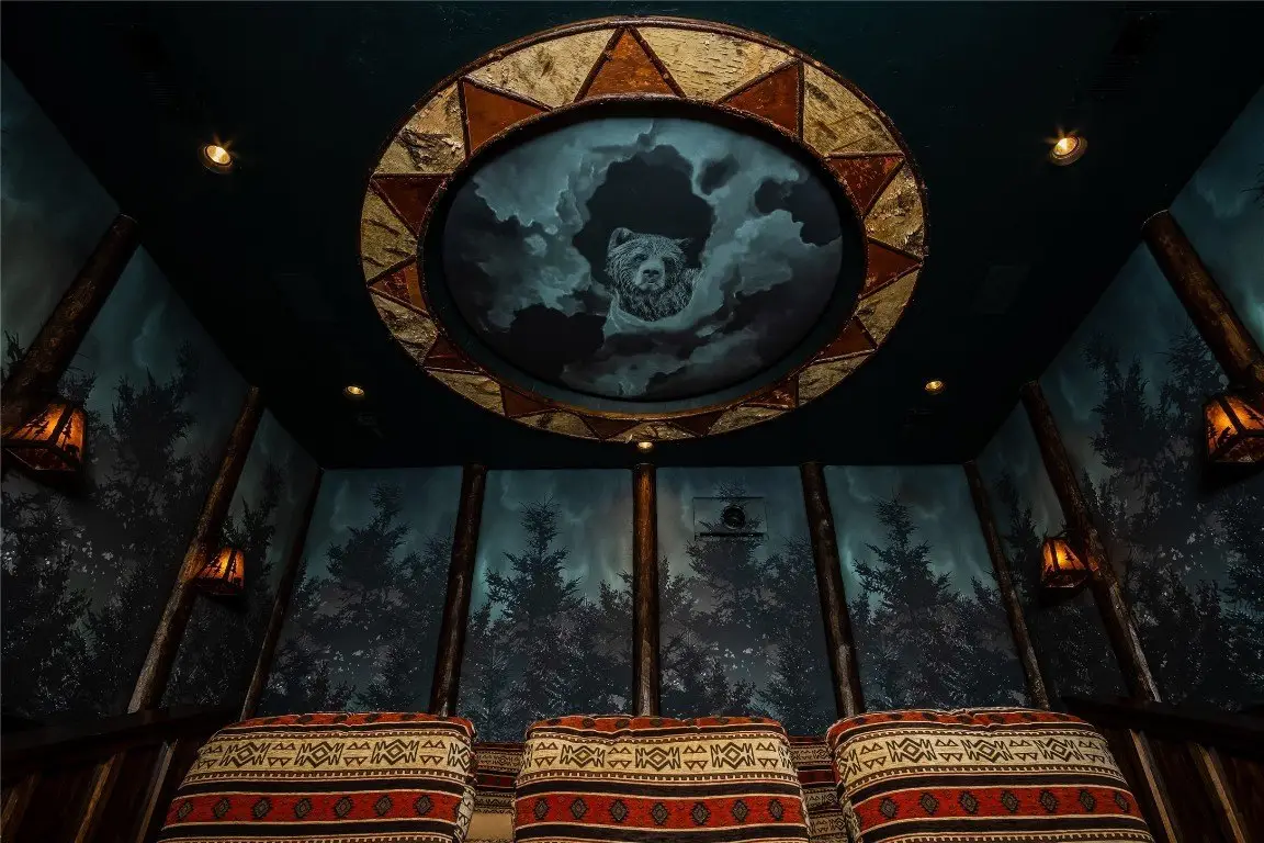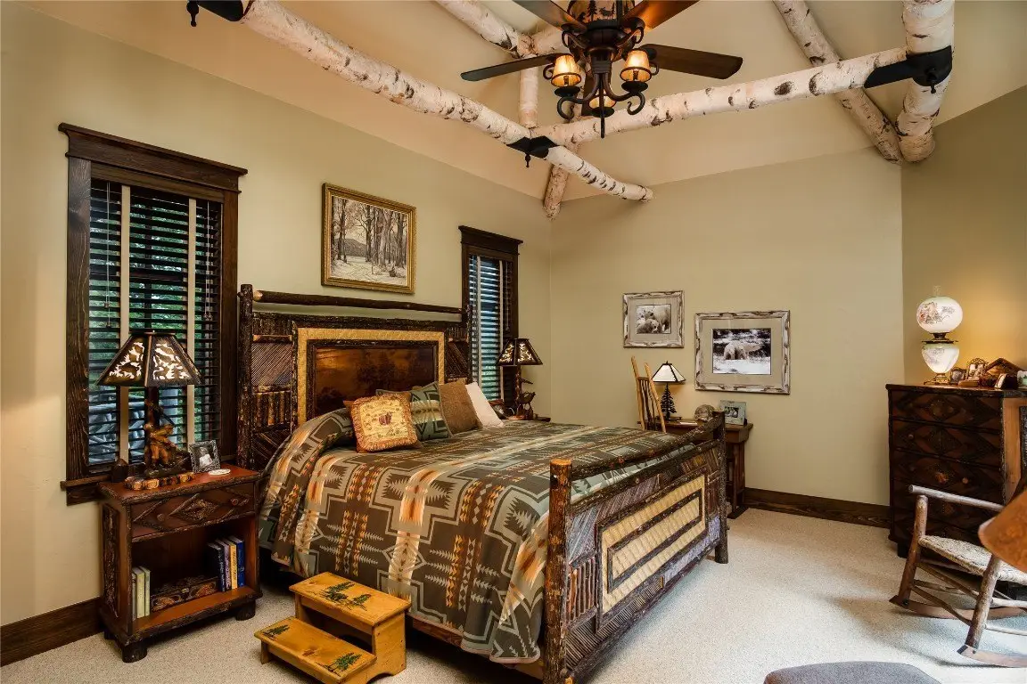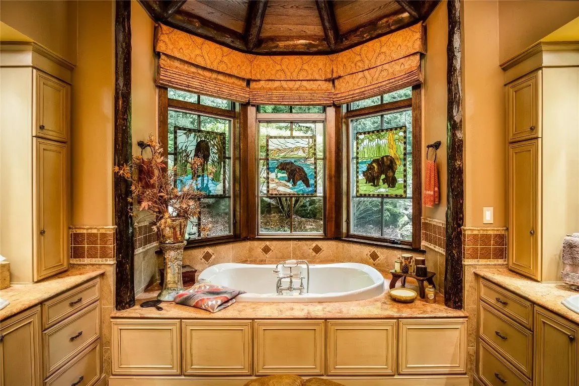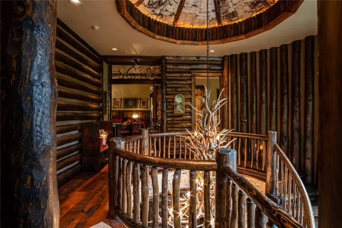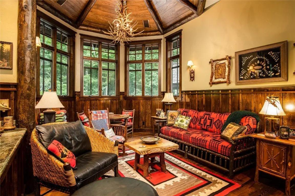 Just minutes from the shopping and fine dining of downtown Cashiers, Blue Bear Camp is the ultimate Adirondack-style mountain lodge. This prime property borders the Nantahala National Forest, ensuring privacy and abundant wildlife. Another world awaits in the dream-like setting amid the wild Chattooga River, flowering landscaping, a sparkling waterfall, and lush forest, all against the stunning backdrop of Whiteside Mountain and Devil's Courthouse. Reminiscent of the great camps in the early 1900s, the rustic decor is warm and welcoming with natural wood details such as pine logs with golden chinking, wax-rubbed reclaimed heart pine floors, and a grandiose circular log staircase surrounding a seven-foot antler chandelier. The staircase is a masterpiece of engineering, constructed from Colorado Ponderosa pine over three months. Much of the custom furniture and details were built by local craftsmen on site. Other unique finishes were created by artisans from across the country, using natural materials such as mica, aged copper, shed elk antlers from Wyoming, Canadian birch bark, wormy chestnut, and turquoise. The stunning stonework and multiple fireplaces throughout the home were built from Tennessee fieldstones, many of which reveal 300,000-year-old fossils. In addition to the private guest quarters with a kitchenette and laundry room, the sprawling three-story home with an elevator offers an abundance of space for family and guests to explore, including a sunroom, library, an artist studio, game room, wine cellar, a resplendent home theater, and a fitness room with a sauna and steam room. Nature lovers will revel in the magical surroundings and fresh mountain air on the covered porch amid sights and sounds of the rushing waterfall. There's something for everyone to enjoy in an area offering residents access to the countless natural resources and opportunities for outdoor recreation such as hiking, fly fishing, biking, skiing, and golf.