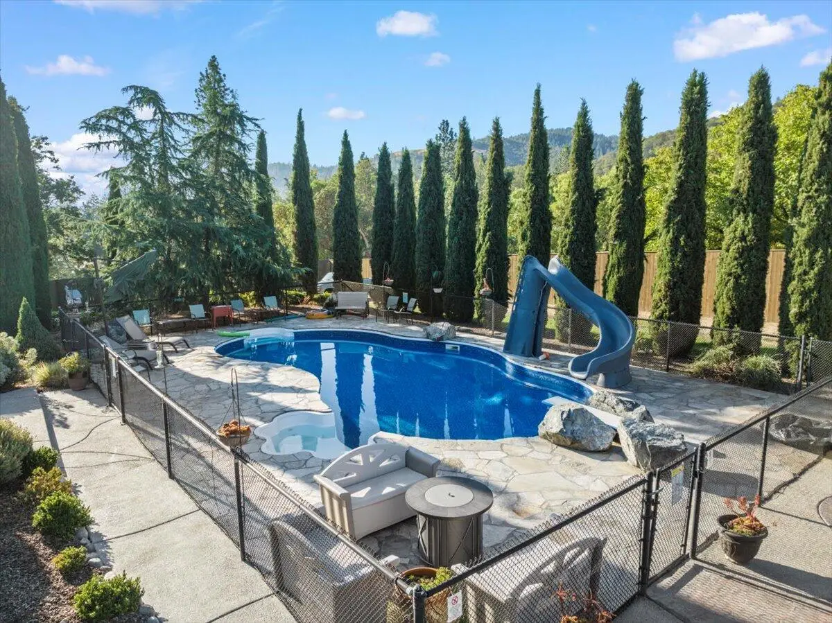 WOW! Instant Equity w/this below appraised value home! Extremely Desirable Old Stage Rd Location & 1-of-a-kind multi-family dream estate! There's a main home, add. living space on lower-level w/separate entrance, additional house next door +more. Back yard has a beautiful salt water in-ground swimming pool/diving board/rocks/upgraded slide, pool fire pump, fruit tree orchard, large garden area, & electric SunSetter awnings over back patios. Main home boasts upgrades including 28' ceilings in grand entrance, cherry wood floors, 2 fireplaces, custom woodwork, +more. Kitchen features high-end appliances, bar area, built-in wine rack, vegetable sink, island, granite countertops, custom cabinets & stunning mountain views. Large primary includes gas fireplace, tile shower, jetted tub, & walk-in closet. Lower level offers a large family room, bedroom, full bath, & kitchenette, perfect for an in-law suite or Airbnb w/separate entrance. Completely 100% perimeter fencing for massive privacy.