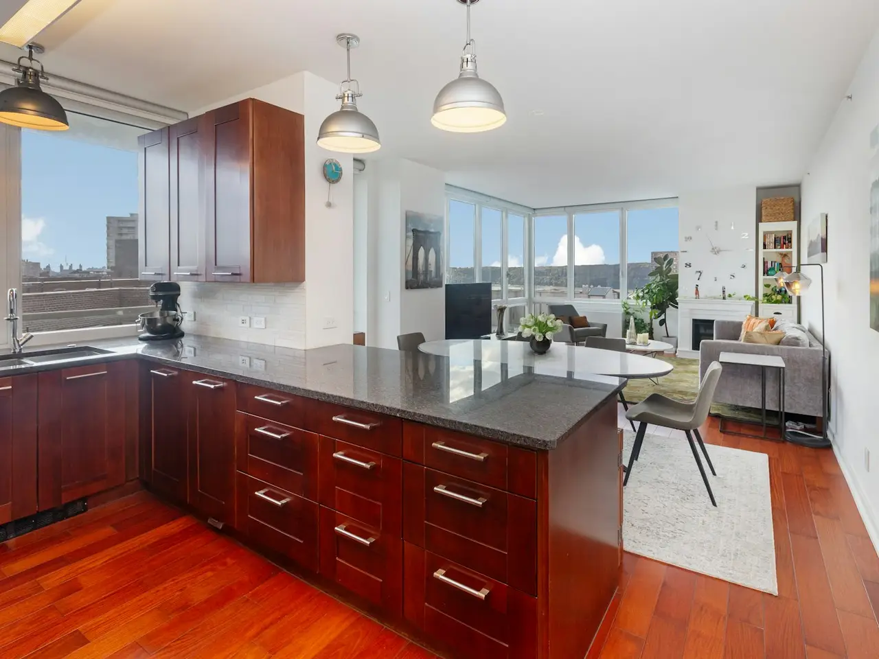 Floor to ceiling windows with city to river views