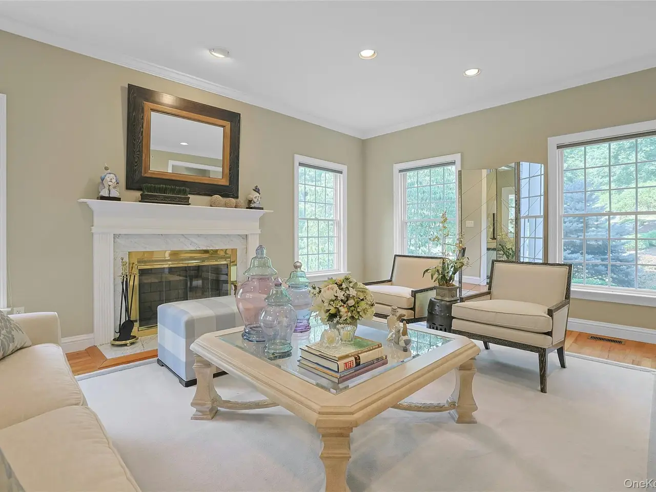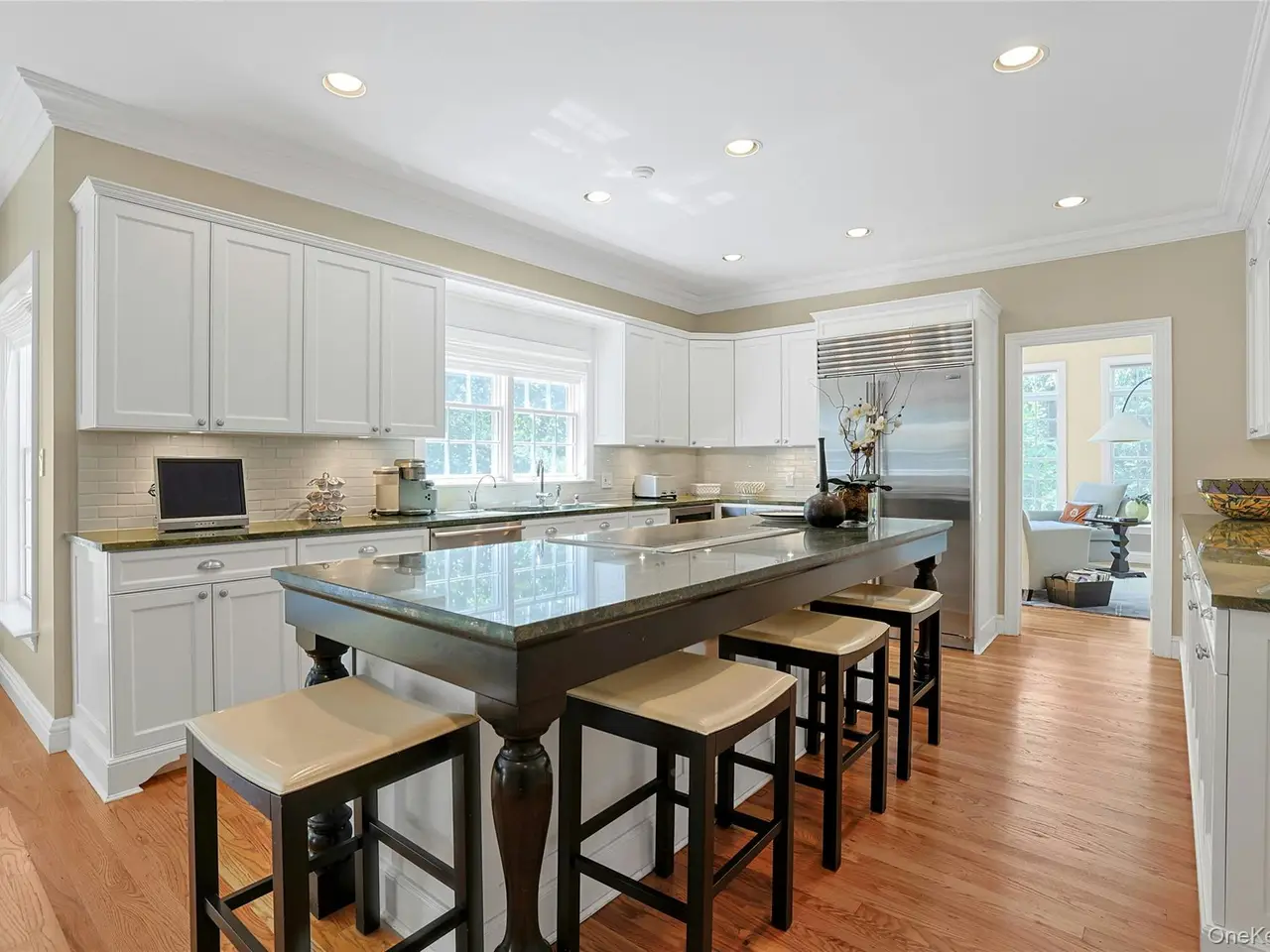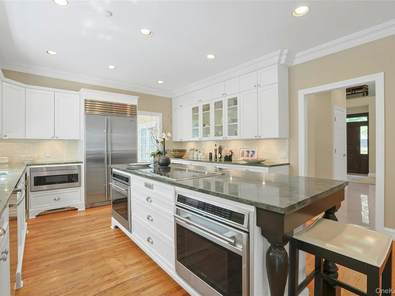 Living like a four-bedroom, this gracious and spacious three-bedroom plus bonus room modern Colonial shines from top to bottom from the meticulous maintenance and updates by the original owners. A welcoming, grand two-story entry introduces a large formal living room brightly illuminated by large front- and side-facing windows, recessed lighting and a wood-burning fireplace. French doors add light from the adjoining sun room, which can easily serve as a home office. Host feasts or fests in the traditional front-facing formal dining room. The kitchen is a cornucopia of delights: custom white wood cabinetry, natural stone countertops, subway tile backsplash, massive center island with plenty of prep space and a breakfast bar for quick dining, and high-end stainless-steel appliances including two Wolf electric convection ovens, a Wolf induction cooktop, large Sub-Zero refrigerator/freezer, built-in Sharp microwave, Miele dishwasher and Sub-Zero wine fridge. Open to the family room is the adjoining breakfast area with built-ins and sliding glass door to the deck for easy BBQ or dining alfresco. Large, rear, south-facing windows and a sliding glass door to the deck beam natural light throughout the spacious family room with its skylit cathedral ceiling, built-in cabinetry and back staircase ascending to the upper level. A powder room and a well-organized laundry/mud room with access to the three-car garage complete the main level. A sweeping staircase ascends to the upper level, home to three bedrooms, three bathrooms and a bonus room, which include the luxurious front-to-back primary suite endowed with a king-sized bedroom, an adjoining sitting or exercise area, walk-in closet, and an elegant, private, skylit, spa-like ensuite bath with wide, two-sink vanity, spa tub, separate shower stall, and radiant heat; two comfortably-sized bedrooms include a front-facing bedroom with two closets and private ensuite bath with shower over bathtub, and a rear-facing bedroom with door to hall bath with two-sink vanity and shower over bathtub; and an extra-large bonus room with closet, which can serve as a den, guest quarters, lounge, office, study, etc. All upper-level rooms have hardwood flooring beneath wall-to-wall carpeting. Designed for entertainment, the finished walk-out lower level showcases two large recreation spaces with a sliding glass door to a large deck, an exercise area (possible in-law or au pair space) and a full bath with shower. Solid, poured concrete foundation, recently updated mechanicals, an automatic backup generator and a newer roof to top it off. Lovely landscaping envelopes the residence. A velvety green lawn rolls out in the back yard, ideal for a catch or lounging about. Sited on a private cul-de-sac just a short drive to schools, shops, town and train. A gem!