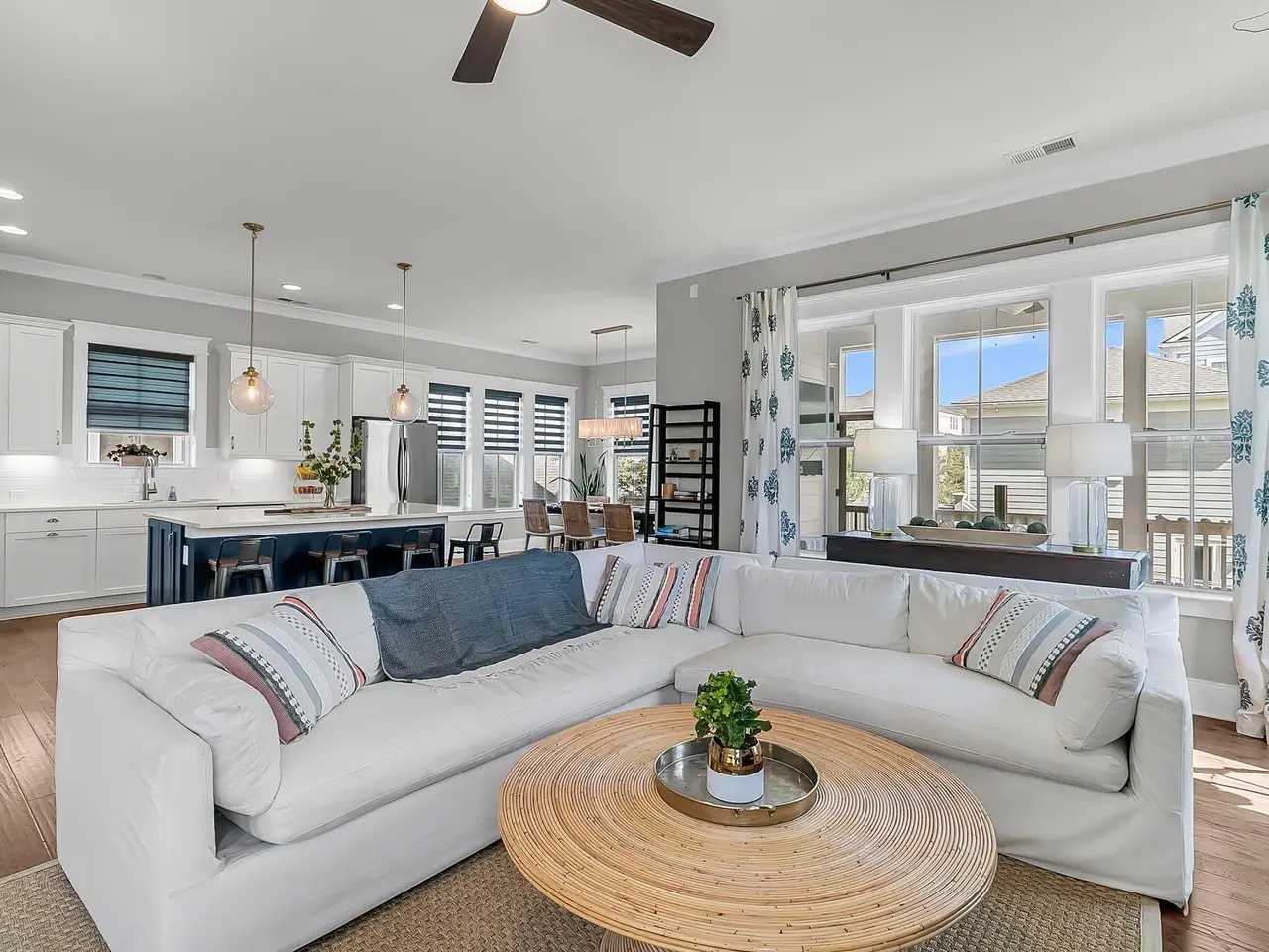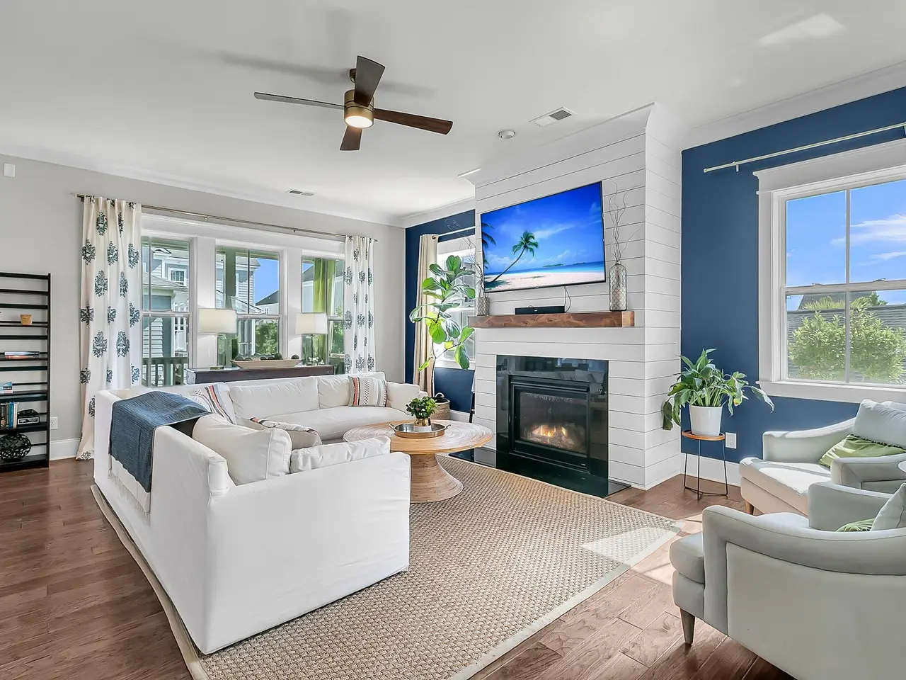 A charming Daniel Island South home with a wrap-around front porch, open floor plan and impressive backyard with fire pit and room for a pool - perfect for your indoor/outdoor Lowcountry lifestyle. Filled with natural light, the first floor offers spacious kitchen with large island, walk in pantry, family room with shiplap details and gas fireplace, convenient first floor guest room with full bath, plus home office with French doors. Retreat upstairs to your master suite with modern tub and glass shower, two additional bedrooms with private baths, loft for recreation and multiple walk in storage closets throughout! Located in Edgefield Park section on a cul de sac with green space in the front and access to endless amenities inc 3 community pools, playgrounds, parks & walking/biking trails. Enter the first floor to open concept family room with coastal shiplap details, large open kitchen with large island and a dining space surrounded by windows with plentiful natural light. A walk in pantry as well as wine fridge provide adequate kitchen storage. First floor also offers a convenient and private guest room with full bathroom and home office with french doors. Or utilize this bonus space for kids playroom or exercise space. Multiple walk in coat closets provides more flexible storage. A screened porch leads to a fit pit area for enjoying lowcountry nights and a huge fenced backyard provides ample space for outdoor living and plenty of room for a pool. This is a rare .24 acre lot on Daniel Island South. The second floor offers primary bedroom suite and two bedrooms each with its own bathroom en suite. Plus, a loft rec space, laundry room, and large walk in storage closet. All bedrooms feature modern ceiling fans. A long driveway leads to a detached two car garage. Daniel Island community offers access to endless amenities including three community pools, tennis courts, pickleball courts, playgrounds, walking trails, boat ramp, and community events. Note buyer pays one time .5% community enhancement fee to the property owners association at closing.