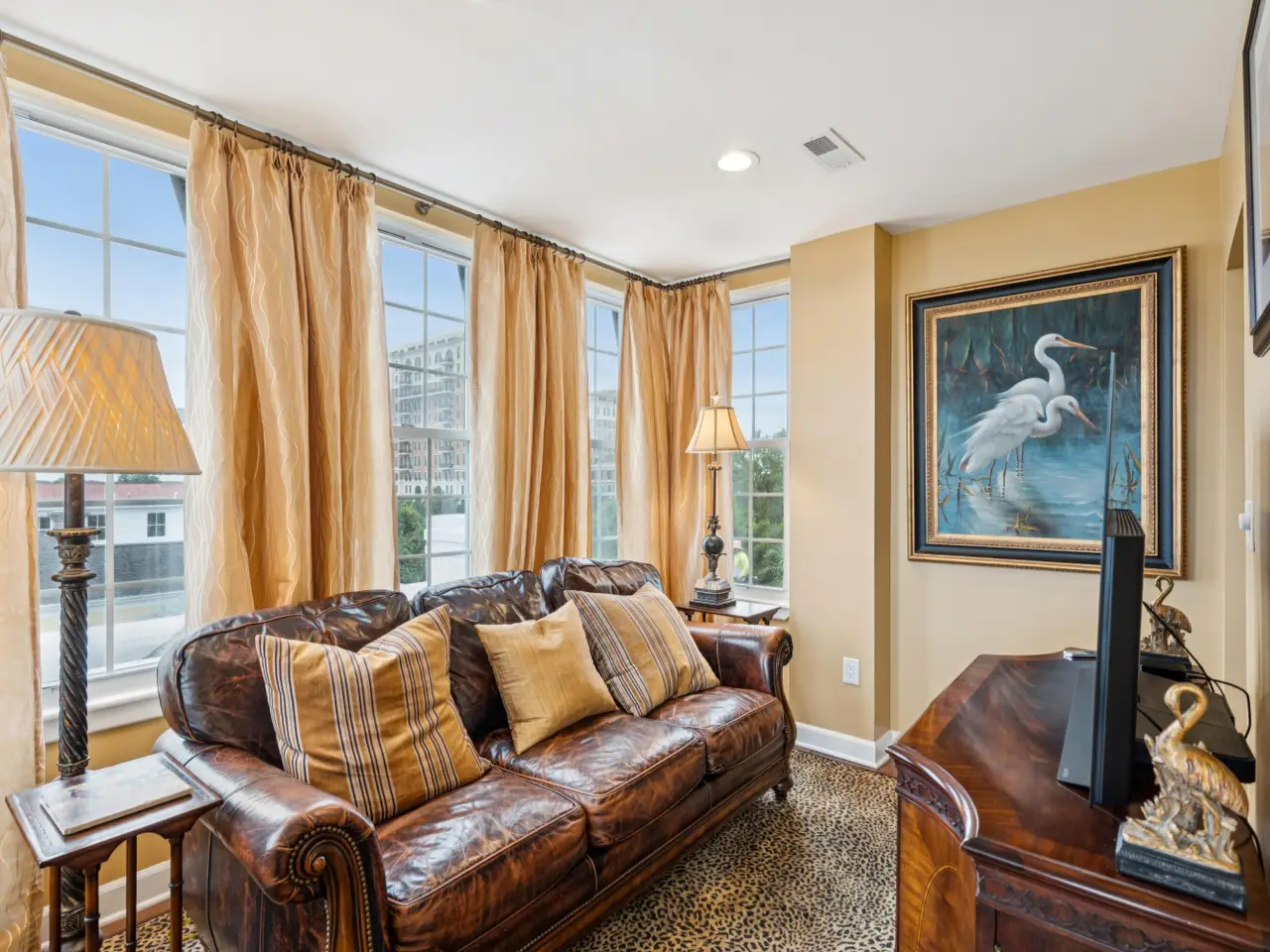 Experience breathtaking views stretching from the Ravenel Bridge to The Jasper on Broad Street from this unique, top floor, corner condominium at the historic Baker House overlooking Colonial Lake. Enjoy passive, park life and interesting wildlife, spectacular sunrises silhouetting the Charleston skyline in the mornings and colorful sunsets reflecting in the many windows of The Jasper and on the lake in the evenings. Built as a private hospital in the early 1900s, Baker House was converted into condominiums in the early eighties and Number 18 was renovated in 2021 and named ''Seven Spires''. The first level boasts three huge, Palladian style windows that showcase the panoramic vista from the living and dining area, beautiful wide plank flooring, a galley kitchen and half bath. This levelalso includes a large beverage bar with a wine cooler, coat closet and additional space separating the living area and kitchen for use as a media room, office or smaller dinette. Three bedrooms and two full bathrooms comprise the second level with unusually ample closets throughout. No storage issues here! The spacious, primary bedroom features a tiled, en-suite bathroom with a large shower and quartz countertop. The other two bedrooms are generously sized as well with skylights that enable one to sleep under the moon and the stars! A second, large, tiled bathroom with a combination tub and shower and quartz countertop is located off the hallway just a few steps from both bedrooms. Moultrie Park, a large, active park offering sports such as tennis, pickleball, and basketball, abuts the large, private parking lot for Baker House residents. Restaurants within close walking distance include The Alcove Market, Costa and Circa 1886. The Crosstown (Highway 17), connecting to all points north, east and west, is a three minute drive. This offering is an exceptional opportunity to live in an historic building, Baker House, in an historic neighborhood, Harleston Village, on the quiet, residential side of the peninsula and to enjoy fabulous views of Charleston above the tree tops! Chandeliers do not convey.