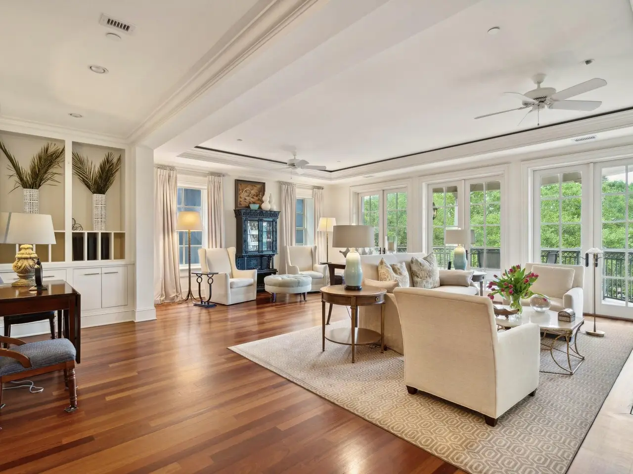 Factors Walk: the best there is in location, style, and maintenance-free luxury. Designed by Goff D'antonio Architects with historic Charleston as inspiration, this Classical Revival building has become a waterfront landmark. Distinguished by triple tiered columned porches overlooking the park, the Palladian style is continued in limestone-trimmed true stucco construction on a piano noble base. Apartment 3A is the largest of only 7 residences and runs the full depth of the building from the front piazza to a solarium at the rear. Parkside entry for guests with stone steps and gas lanterns. A coded elevator is accessed from secured garage parking, or from the gated garden entry. Grand rooms with floor to ceiling windows. Spectacular kitchen with fine cabinetry, three fireplaces, mahogany paneled elevator, piazza with columns and stone flooring, hurricane proof windows and doors, primary bedroom with fireplace and sitting room/office, building and residence security systems. Currently set up as a two bedroom, the library can easily be converted back to third bedroom.