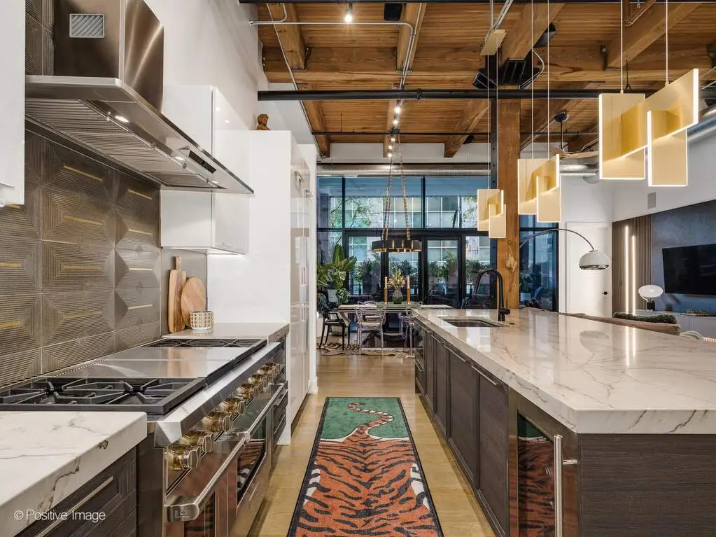 Experience elevated loft living at The Ronsley, one of River North's most sought-after luxury residences. This exceptional 3-bedroom, 3-bathroom home offers a perfect blend of industrial and modern feel, featuring soaring 15-foot timber ceilings, exposed brick, floor-to-ceiling windows, hardwood floors, custom lighting and automatic shades throughout. The open concept living and dining area is filled with natural light and anchored by a custom media wall, seamlessly flowing to a spacious private terrace. The chef's kitchen is outfitted with top-of-the-line Wolf appliances, a large island with polished quartz countertops, custom cabinetry, beverage refrigerator, pantry, and a custom designed built-in breakfast nook. A desirable split-bedroom floor plan offers convenience with each bedroom featuring a full en-suite bath. The luxurious primary suite includes oversized windows with blackout shades, a walk-in closet, and a spa-inspired bath with a steam shower, soaking tub, dual vanities, and updated mirrors. The generously sized second and third bedrooms each offer ample closet space and beautifully appointed en-suite baths. Additional features include a spacious laundry room with side-by-side washer/dryer, utility sink, and extensive cabinetry. The Ronsley is a full amenity building offering 24-hour door staff, fitness center, yoga room, resident lounge, and an expansive landscaped courtyard with grilling stations, fire pit, and lounge seating. Ideally located near Montgomery Ward Park, the Chicago Riverwalk, Larrabee dog park, Health/Wellness Clubs such as East Bank Club and Bian, Target, groceries, top dining, nightlife, shopping, public transit and highway access. Price includes a premium deeded garage parking space with a lift accommodating two vehicles.