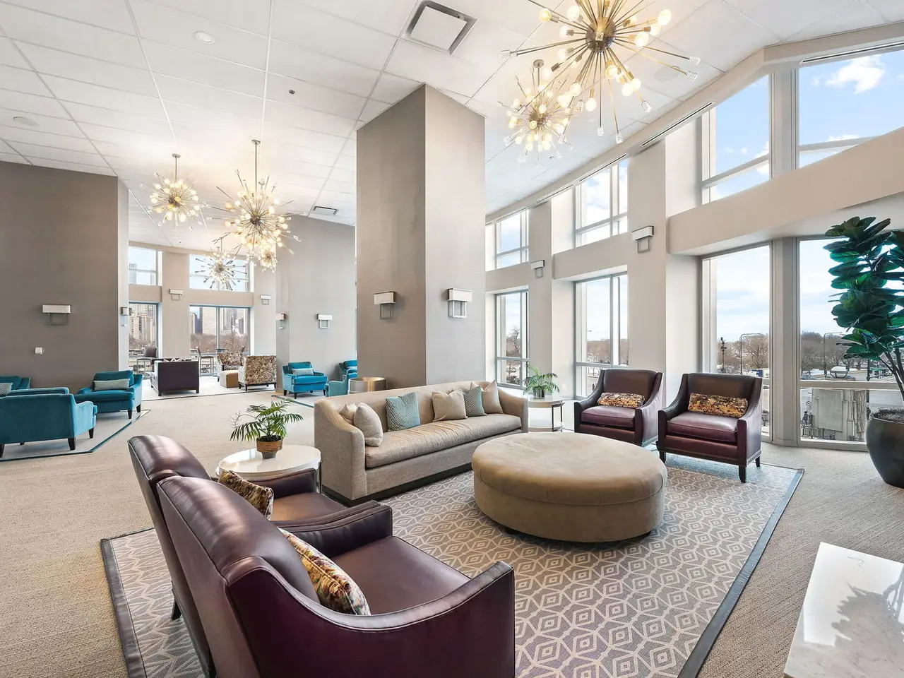 Floor-to-ceiling windows with panoramic city and lake views